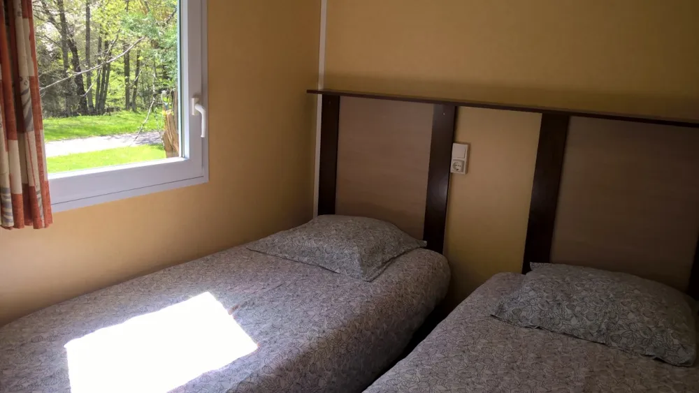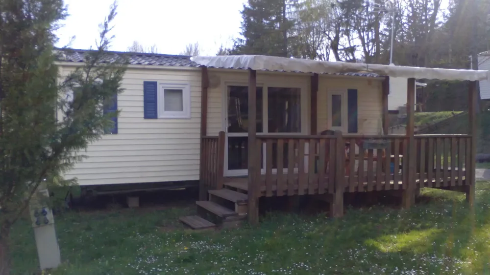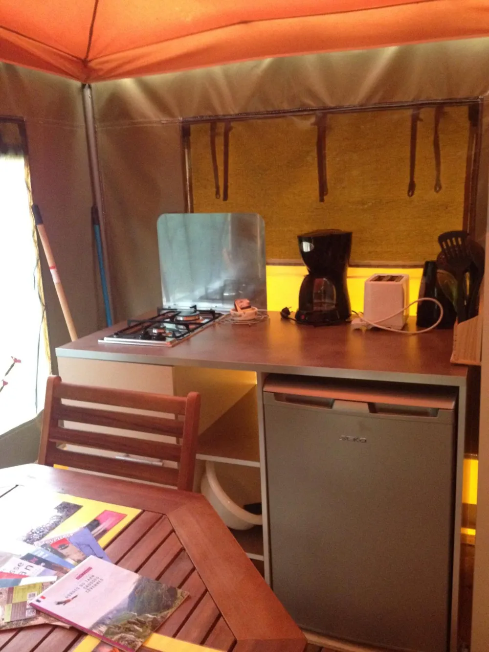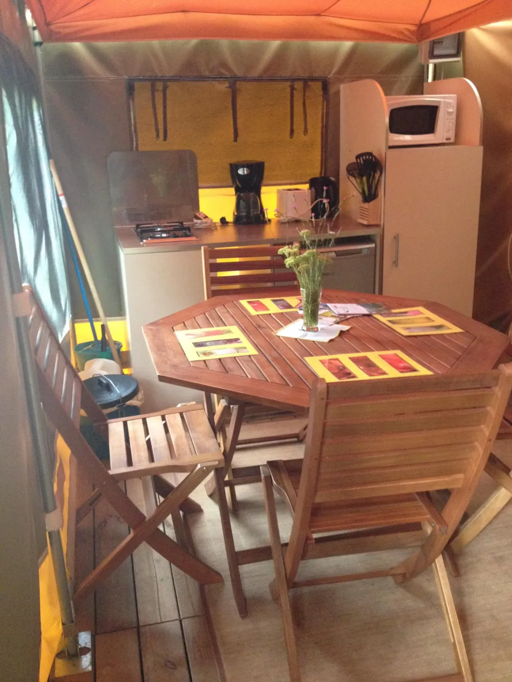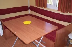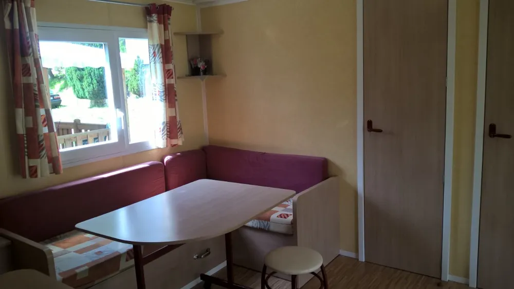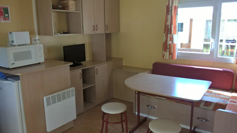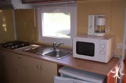 Mobil-home pour 3 à 4 personnes, composé d'une pièce à vivre avec coin cuisine équipé ( 2 feux gaz, hotte aspirante, frigo, micro ondes, cafetière à dosette senseo, nécessaire de cuisine et vaisselle.