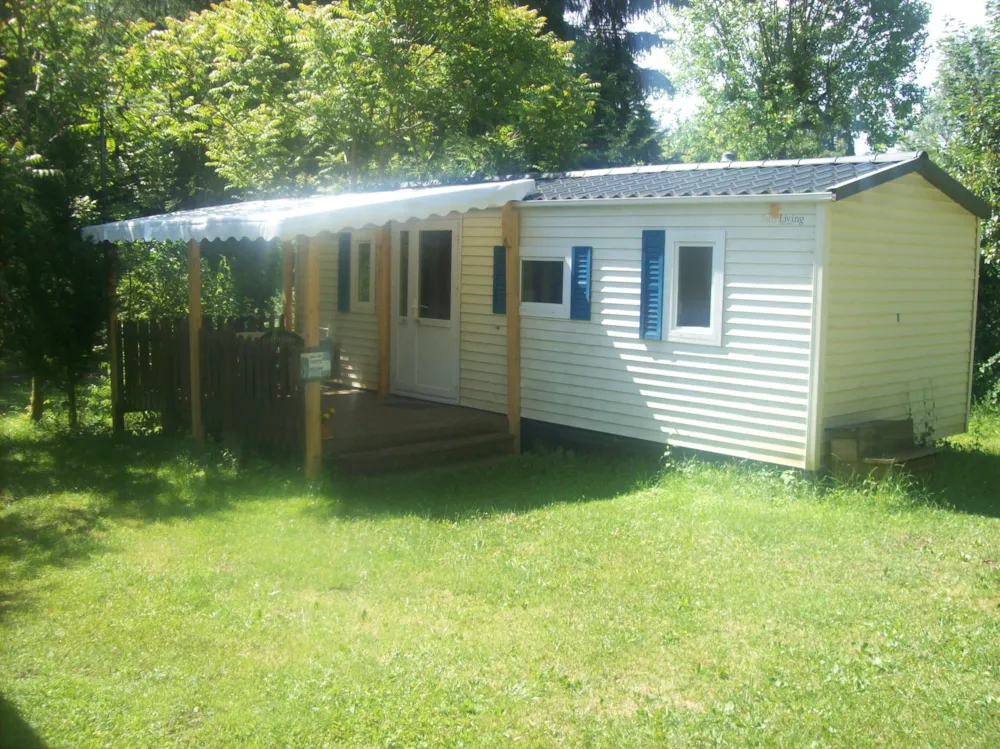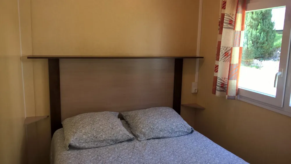 Mobil-home pour 1 à 2 personnes, composé d'une pièce à vivre avec coin cuisine équipé ( 2 feux gaz, hotte aspirante, frigo, micro ondes, cafetière à dosette senseo, nécessaire de cuisine et vaisselle.