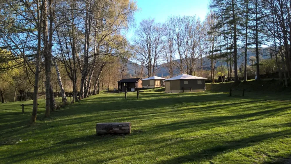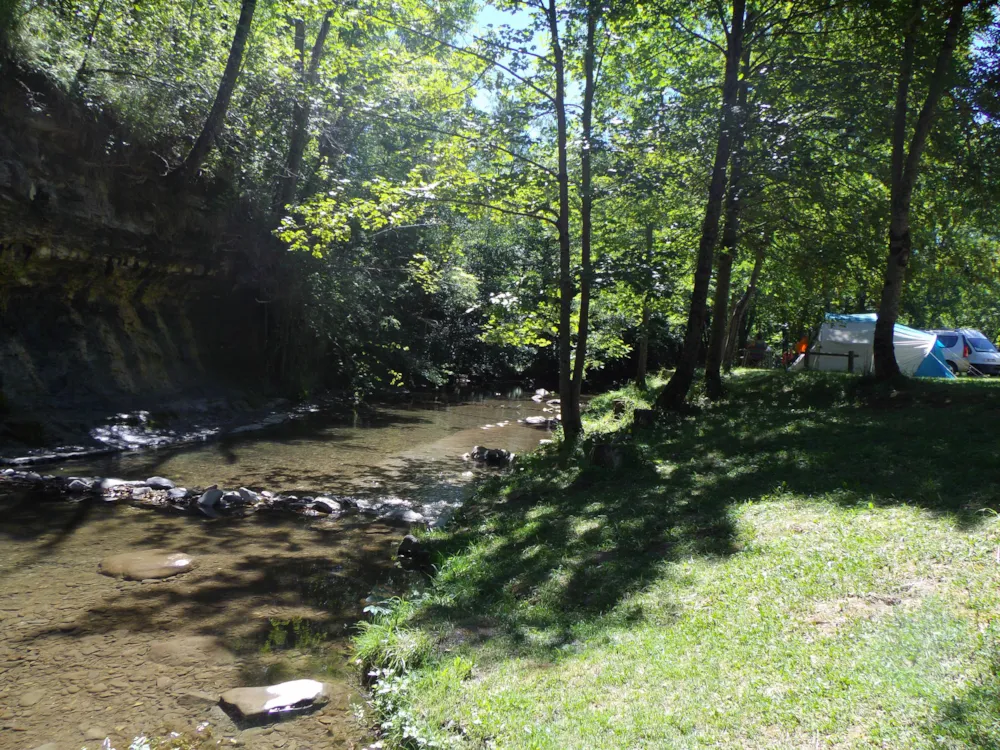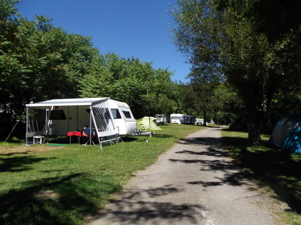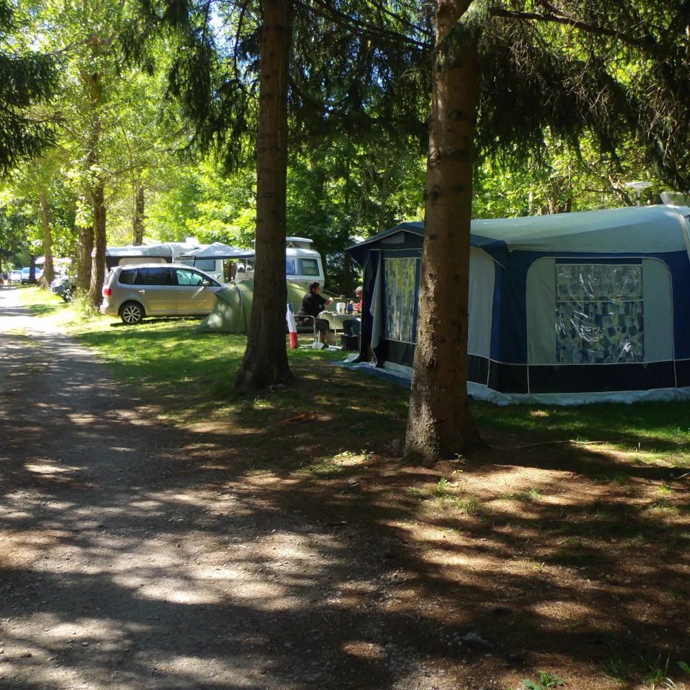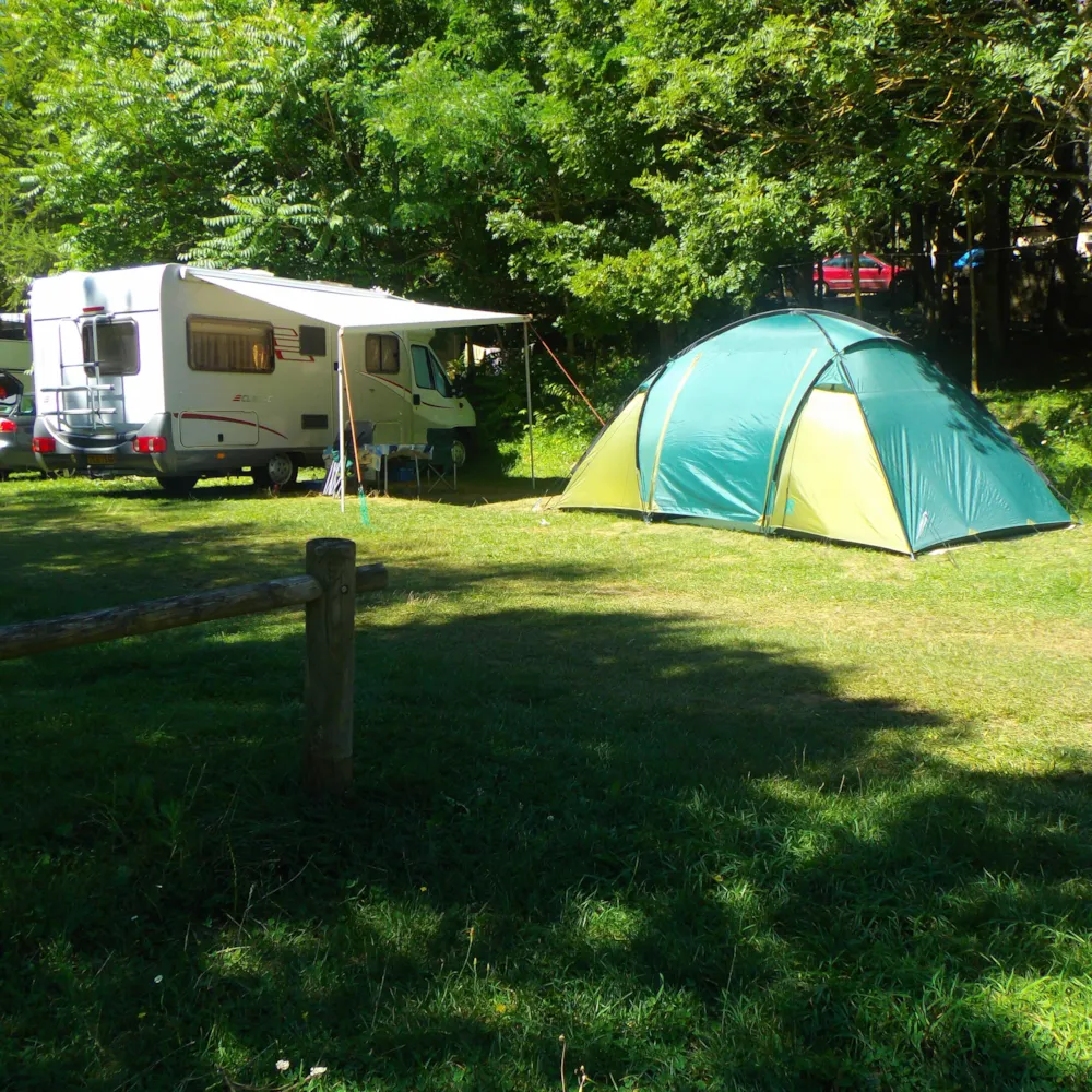 Emplacements sur sol herbeux, d'une superficie d'au minimum 70 m², tous arborés, numérotés et délimités par des rondins de bois.