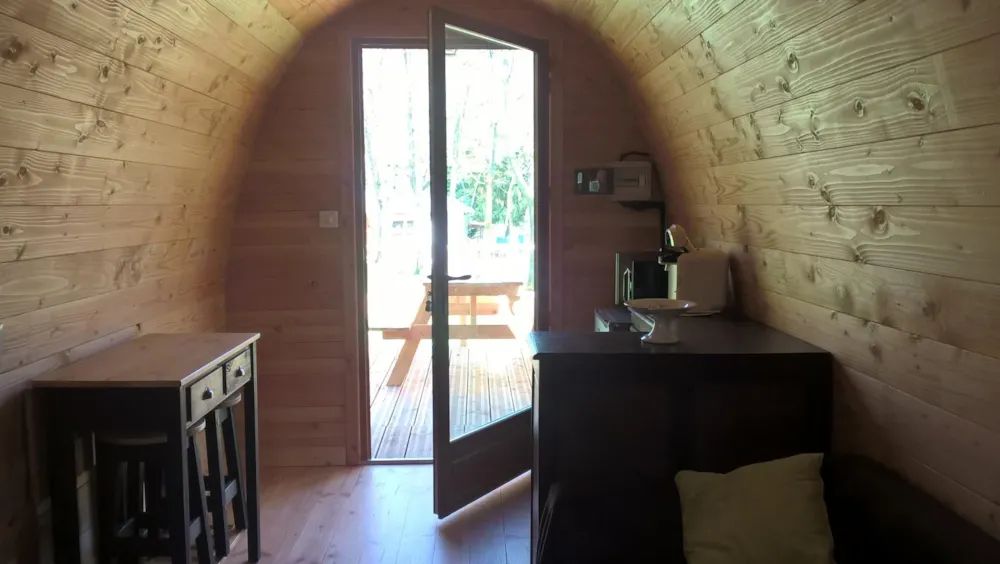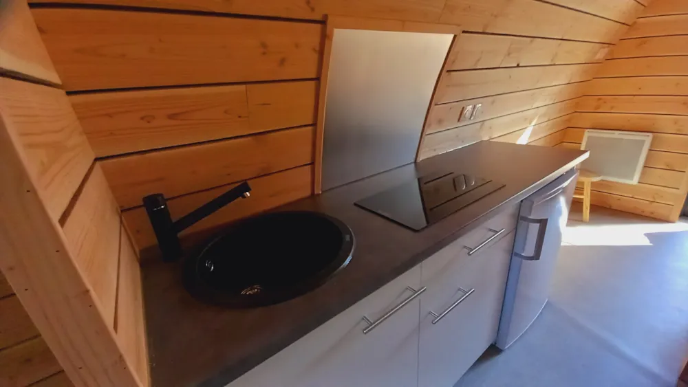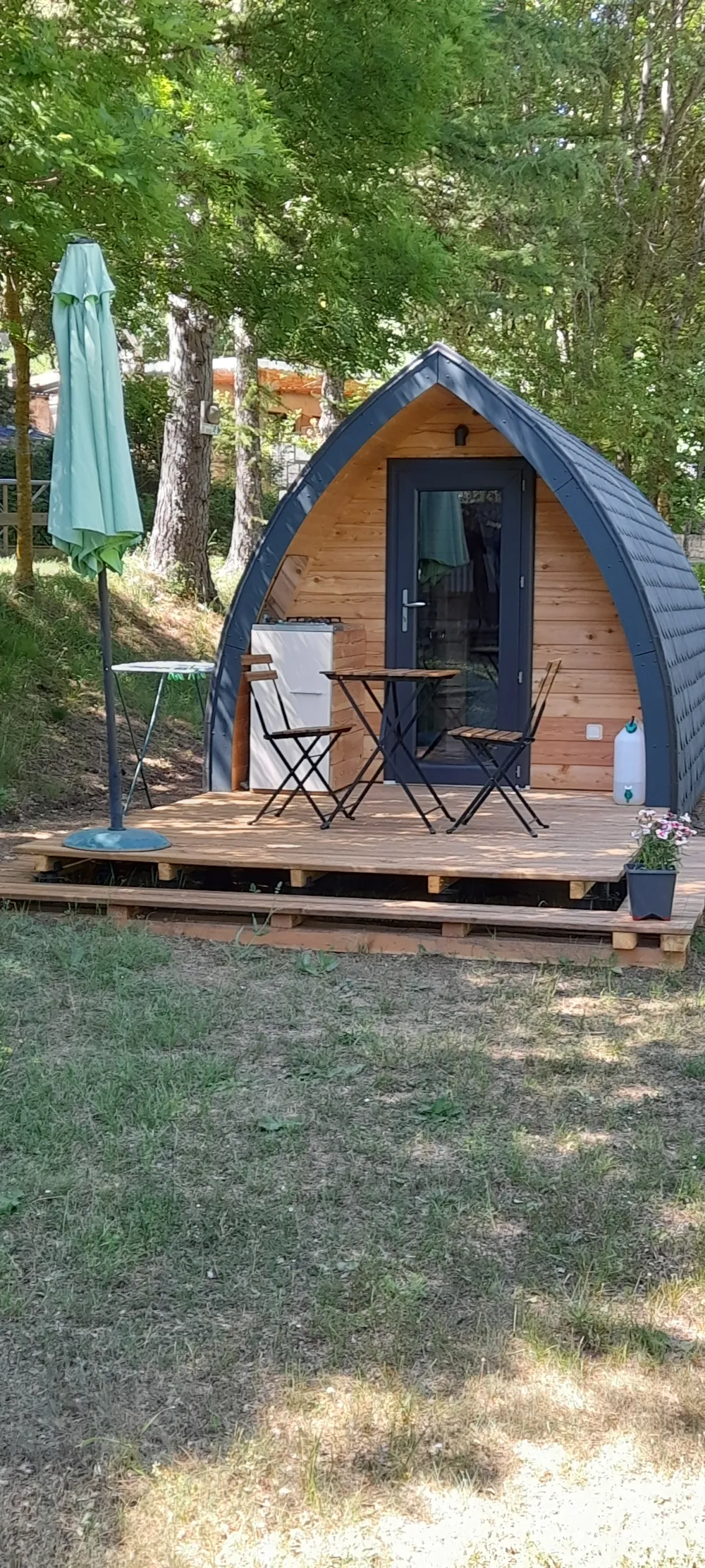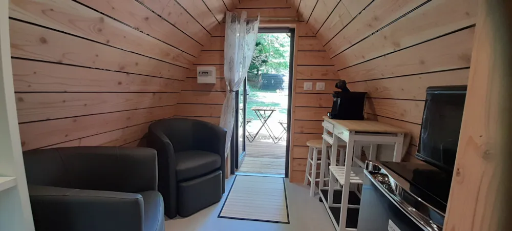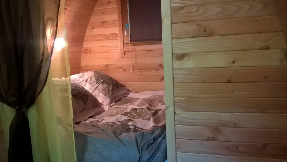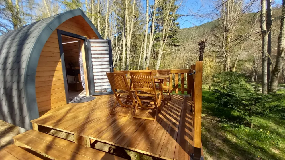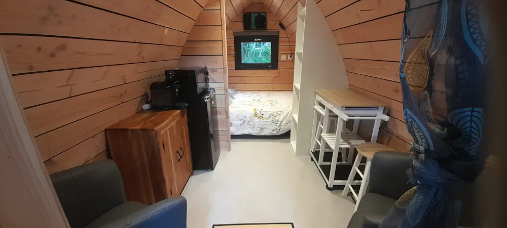 Cabane en bois pour 1 à 2 personnes avec 1 couchage en 140cm, linge de lit fourni. Pièce à vivre avec fauteuils, écran tv, frigo, micro-ondes, cafetière à dosette senseo, nécessaire de cuisine et vaisselle. A l'extérieur, une petite terrasse en bois équipée de 2 feux gaz, ensemble de jardin et parasol. Sanitaires et point d'eau à proximité. Les animaux ne sont pas admis dans les cabanes.