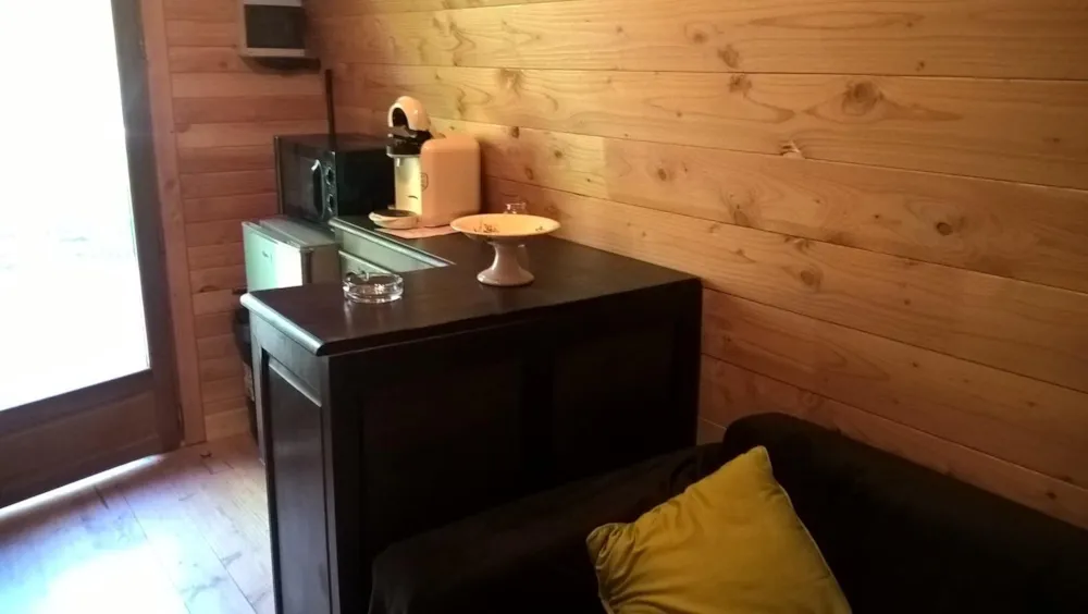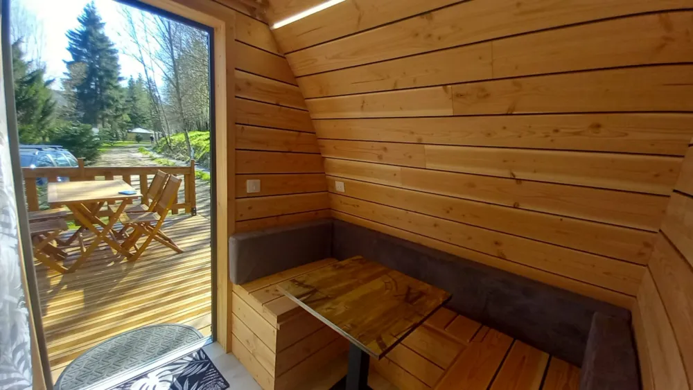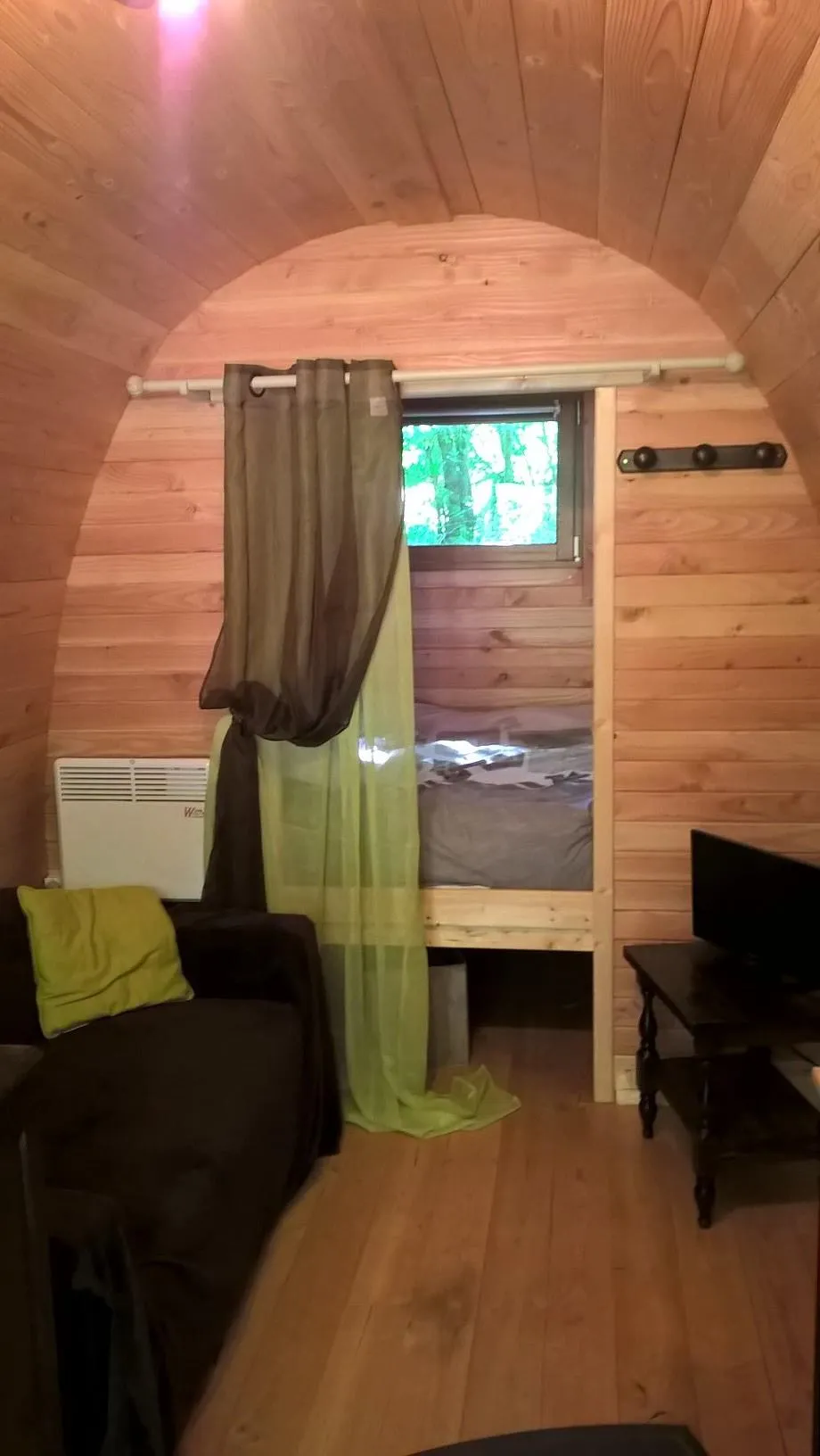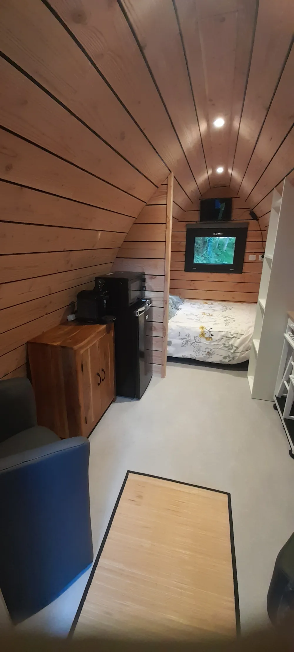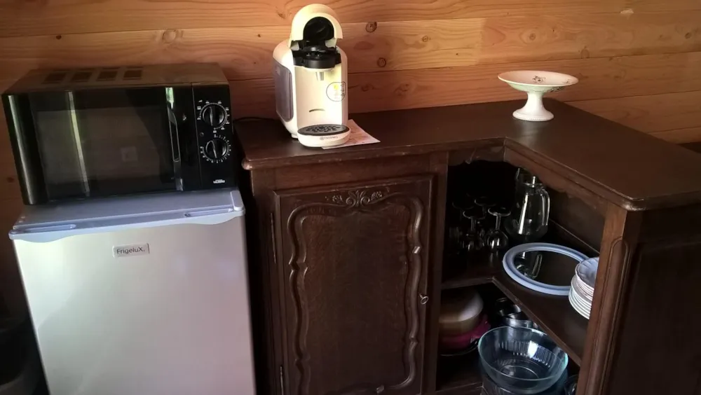 Cabane en bois pour 1 à 2 personnes avec 1 couchage en 140cm, linge de lit fourni. Pièce à vivre avec fauteuils, écran tv, frigo, micro-ondes, cafetière à dosette senseo, nécessaire de cuisine et vaisselle. A l'extérieur, une petite terrasse en bois équipée de 2 feux gaz, ensemble de jardin et parasol. Sanitaires et point d'eau à proximité. Les animaux ne sont pas admis dans les cabanes.