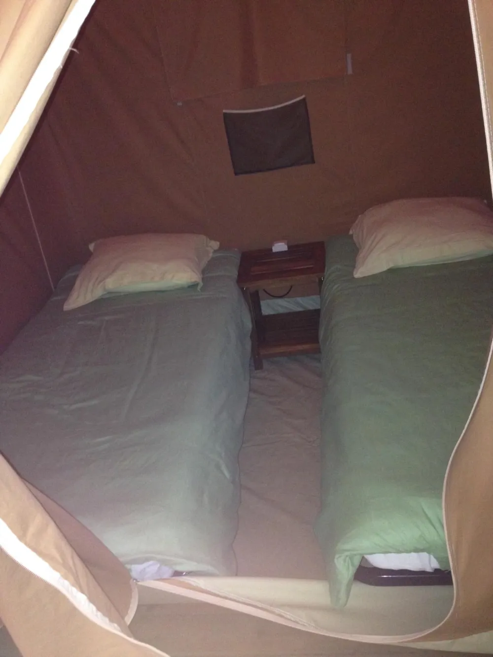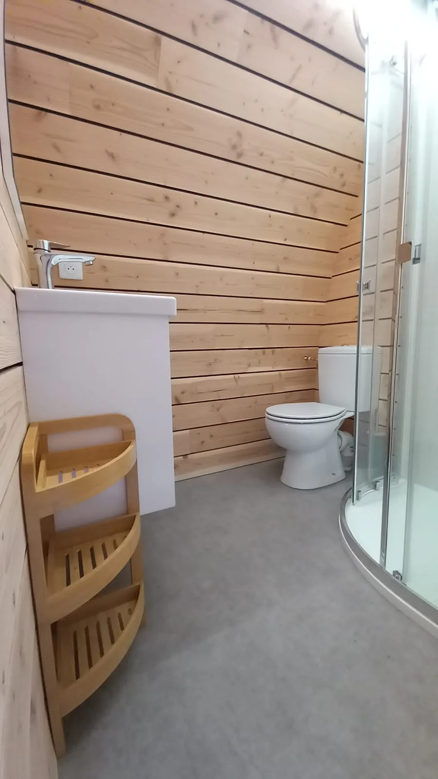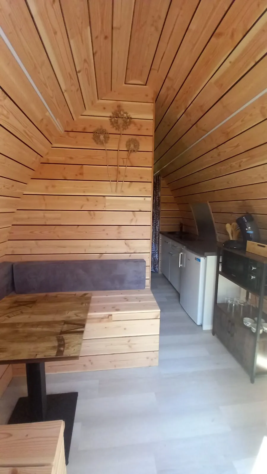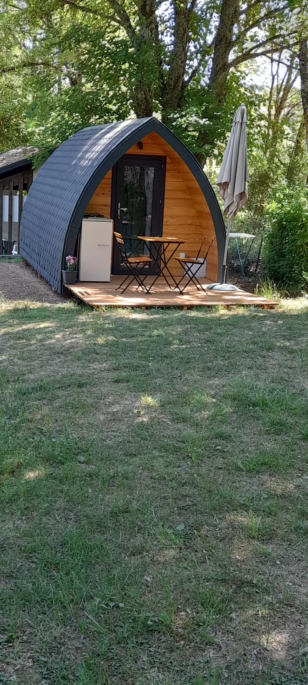 Cabane en bois pour 1 à 2 personnes avec 1 couchage en 140cm, linge de lit fourni. Pièce à vivre avec fauteuils, écran tv, frigo, micro-ondes, cafetière à dosette senseo, nécessaire de cuisine et vaisselle. A l'extérieur, une petite terrasse en bois équipée de 2 feux gaz, ensemble de jardin et parasol. Sanitaires et point d'eau à proximité. Les animaux ne sont pas admis dans les cabanes.