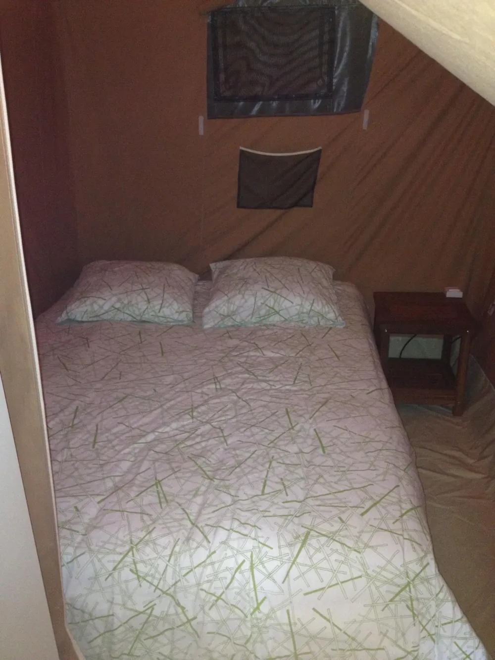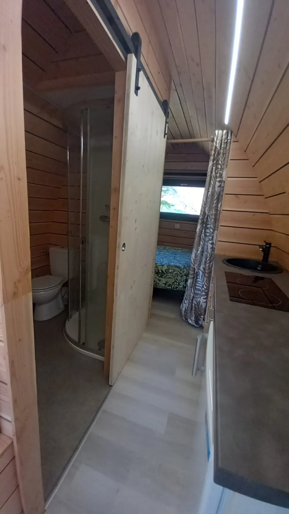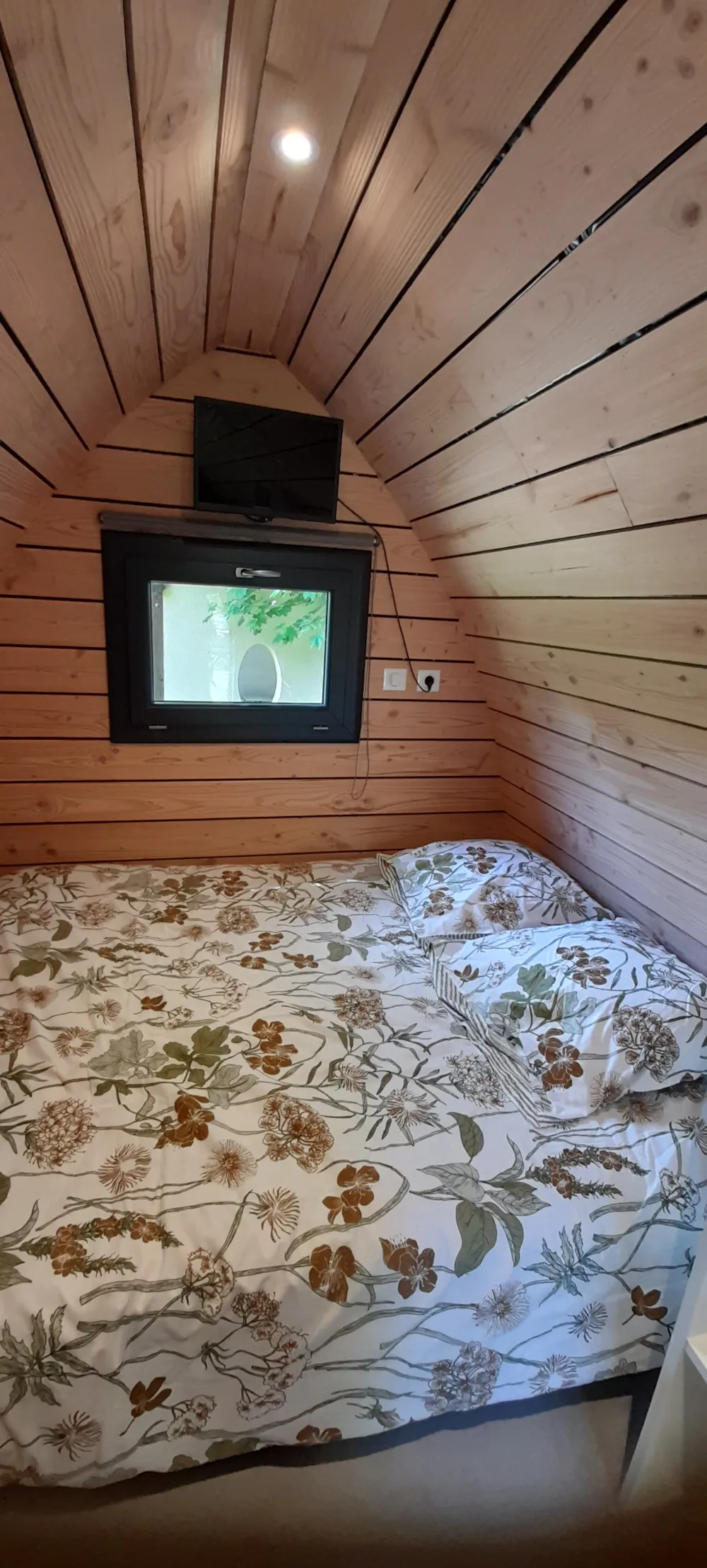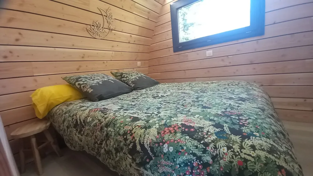 Cabane en bois isolée 4 saisons pour 1 à 2 personnes. Elle est composée d'une chambre située au fond avec un lit en 140cm. Le linge de lit est fourni et le lit fait à l'arrivée.