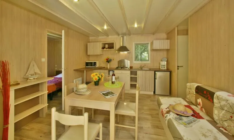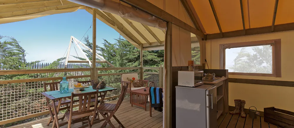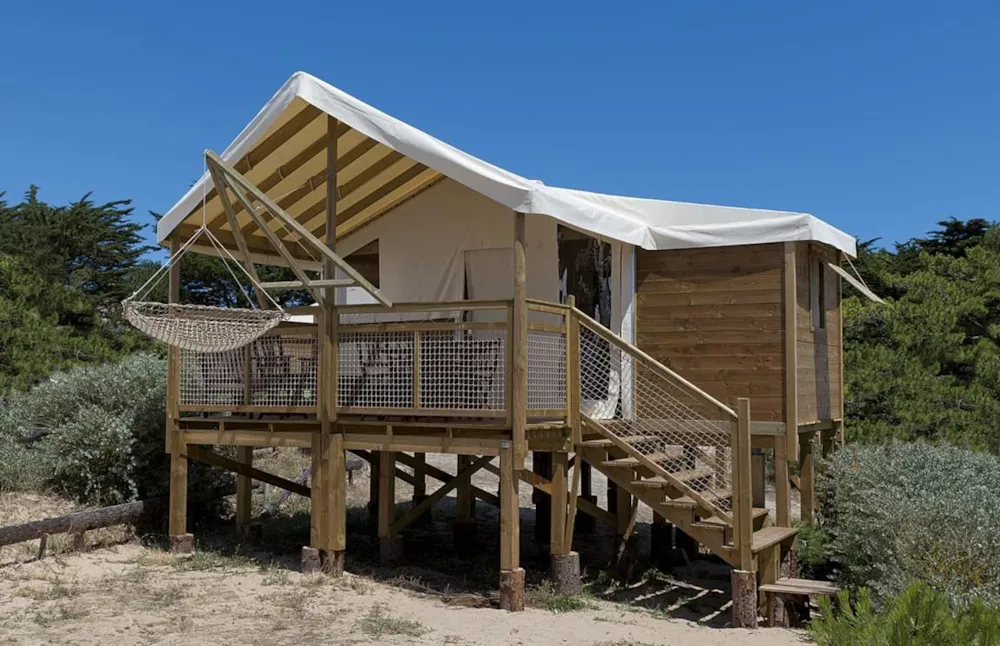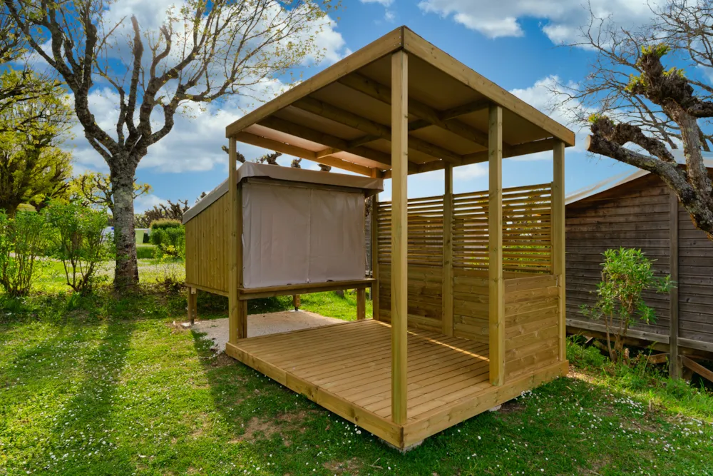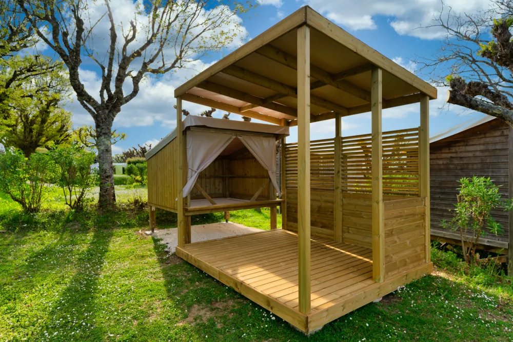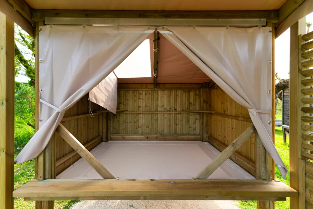 Vous êtes itinérant soit randonneurs du GR6 ( à 300 m du camp), soit cyclotouristes ou motards à la découvertes des voies vertes et charmantes petites routes du perigord noir, mais vous n’avez pas tout l’équipement du campeur ou vous ne voulez pas vous encombrer de matériel de camping . Nous avons une solution "prêt à camper" pour vous : le lodge Camp'Etoile, constitué d'un espace de couchage en bois et toile sur pilotis, et d'une belle terrasse couverte pour la détente et les repas. Ce logement est équipé avec électricité 6A/10A/16A, table + 2 chaises, un éclairage portatif Imaginez dormir comme à la belle étoile avec vue sur une magnifique voûte céleste estivale, des nuits sous la toile au plus proche de la nature et des réveils aux sons des oiseaux, le tout dans le confort douillet de votre hébergement.