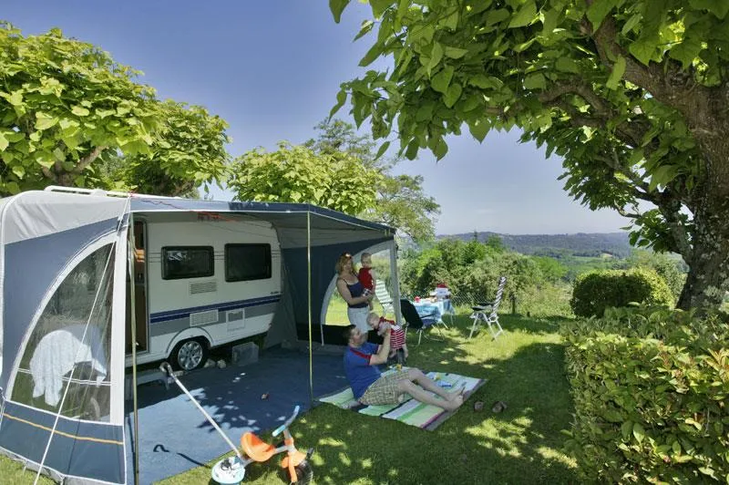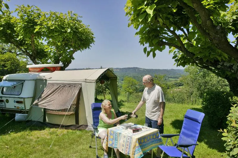 Ruime kampeerplaats, voor caravan of camper (pakket voor 2 personen + 10/16 A elektriciteit + afvoer van afvalwater, wateraansluiting) schaduwrijk, afgebakend, op terrassen met 180° panorama, rustig. Ter plaatse Elektriciteit en waterpunt, gemakkelijke toegang.