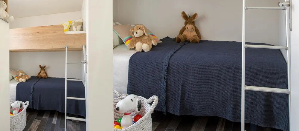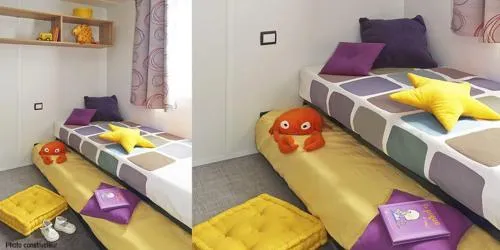 mobile home with terrace and garden furniture. This modern design accommodation consists of a bedroom with a bed 2 people, private bathroom, iron / ironing board, a room with two beds 1 person, a bedroom with two bunk beds 1 person, a bathroom with hairdryer and separate toilet, a kitchen (dishwasher, fridge-freezer, gas hob, microwave, coffee maker, toaster, dishes ...) and a lounge / dining room with sofa, TV and air conditioning.