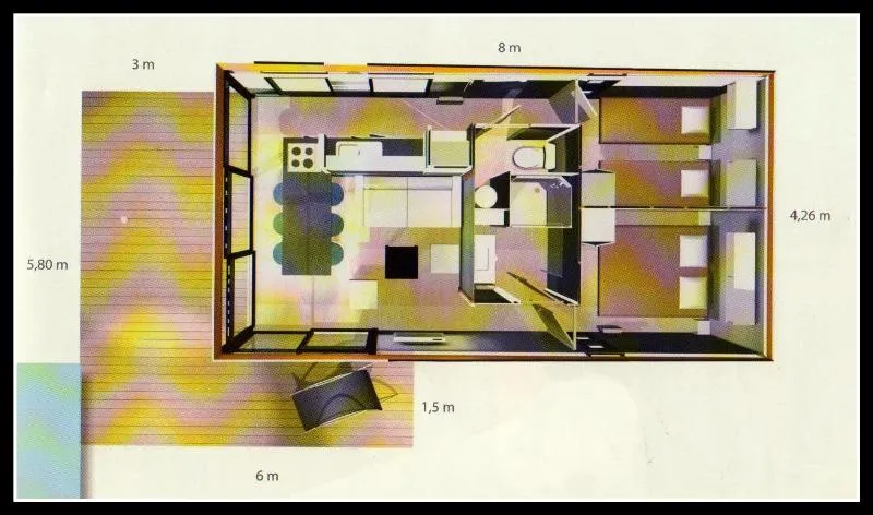 Chalet mit überdachter Terrasse Das Chalet bietet ein Zimmer mit einem Doppelbett, ein Schlafzimmer mit zwei Einzelbetten 90 x 190 cm, einem Wohnzimmer mit Sofa und Kochnische. Badezimmer mit Dusche und separater Toilette. Es ist geräumig für 4 Personen. Die Terrasse ist bedeckt