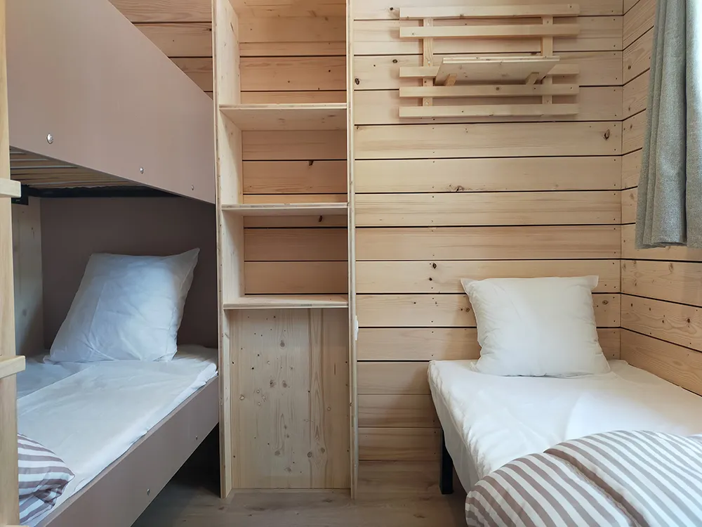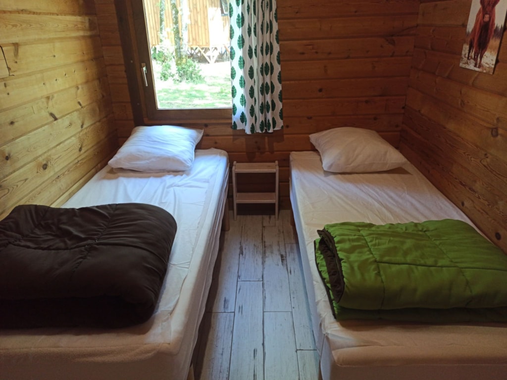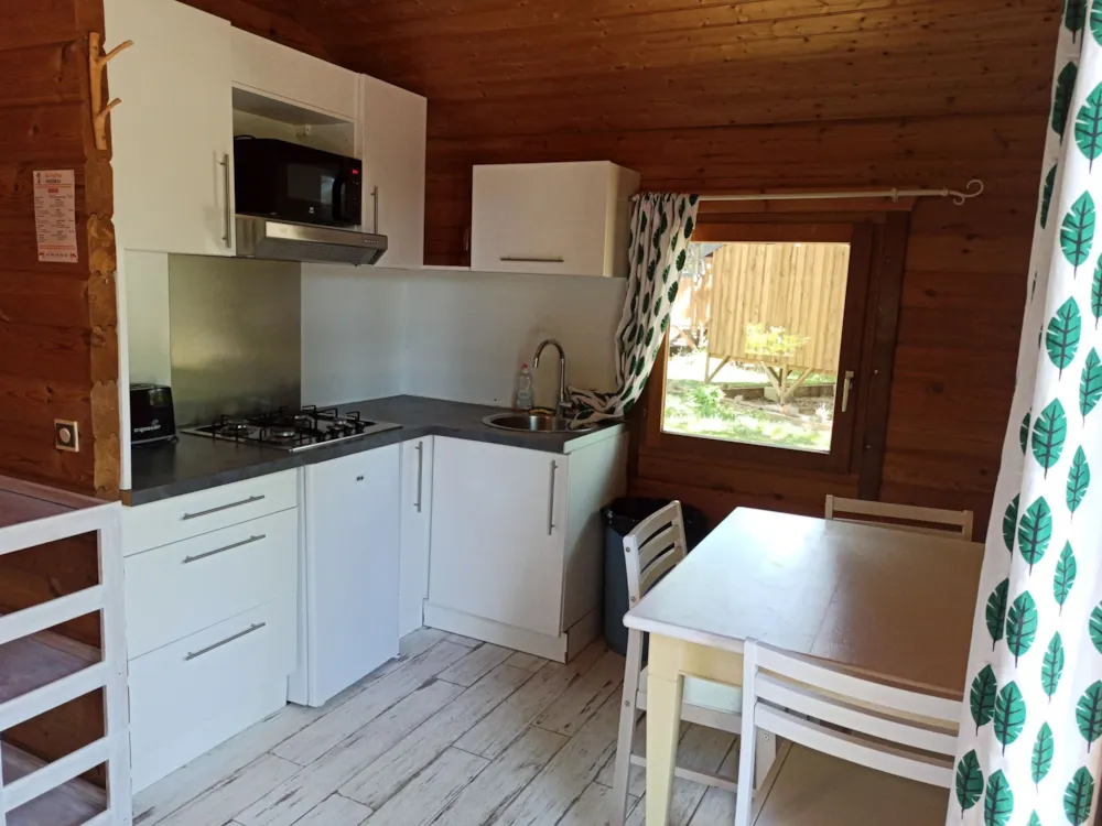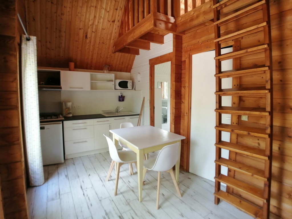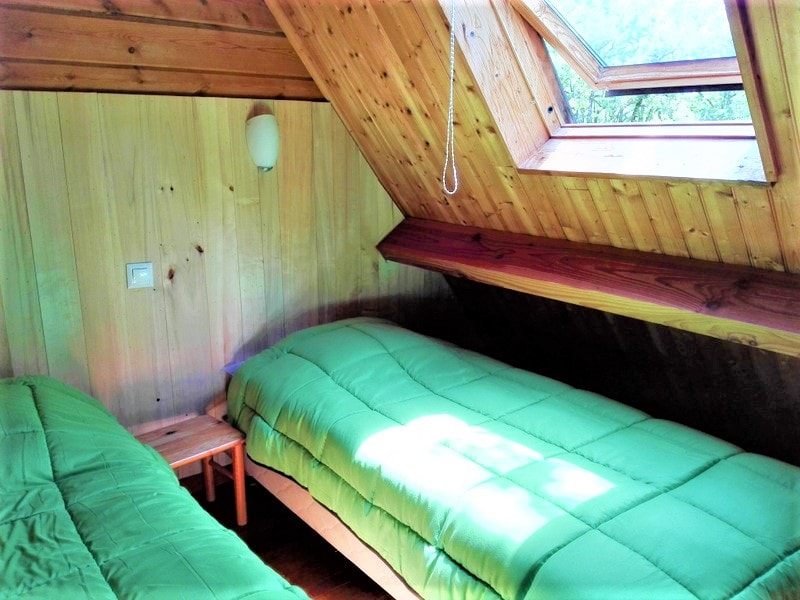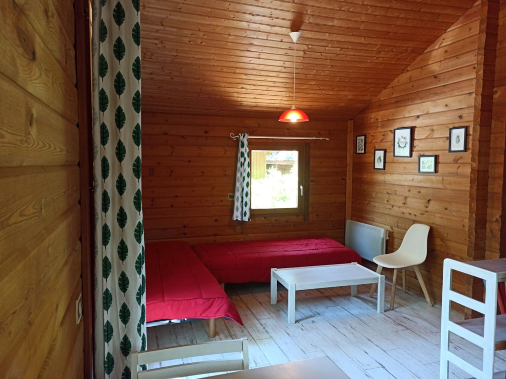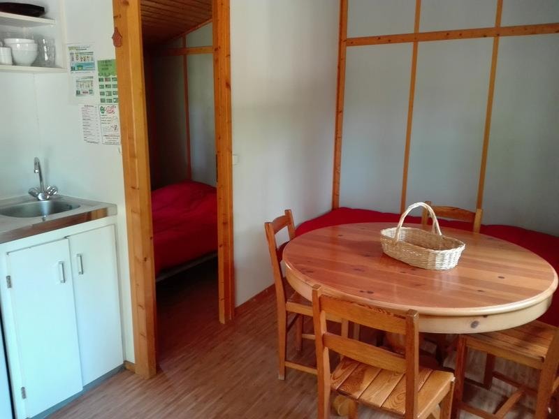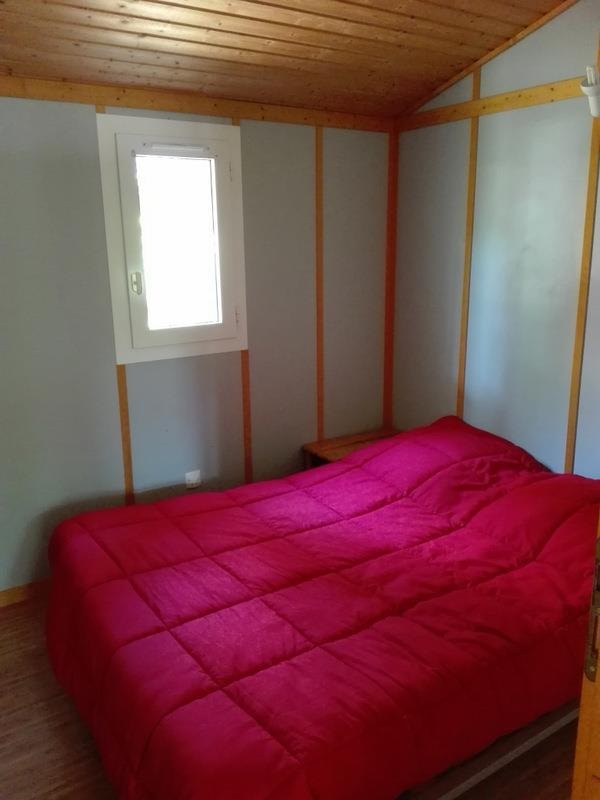 Das Chalet besteht aus einem Schlafzimmer mit Doppelbett, ein Schlafzimmer mit zwei Etagenbetten 90 x 190 cm, Zimmer Bad mit WC und einem Wohnzimmer mit Kochnische und ein Fünftel für eine Person. Traditionelle Herstellung, Blockhäuser Qualität bieten allen Komfort eines wirklichen Hauses (Fliesenboden, Isolierung, Fensterläden) kombiniert mit dem Charme des Holzes. Es verfügt über eine große Holzterrasse.
