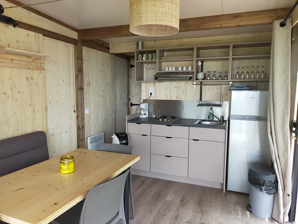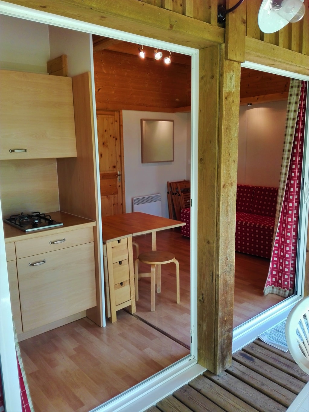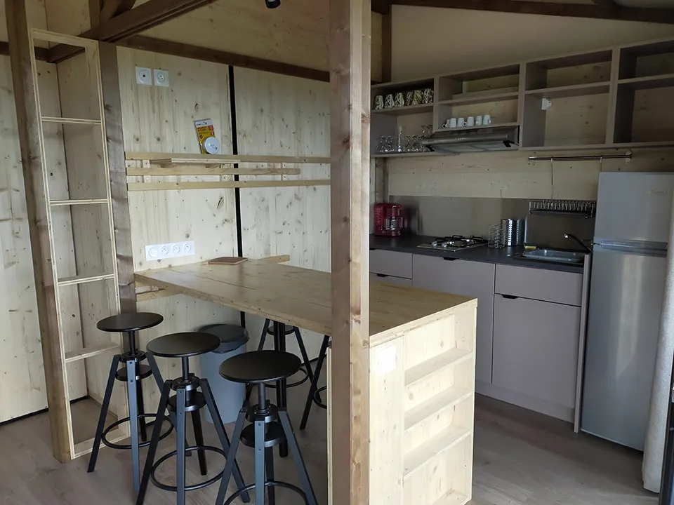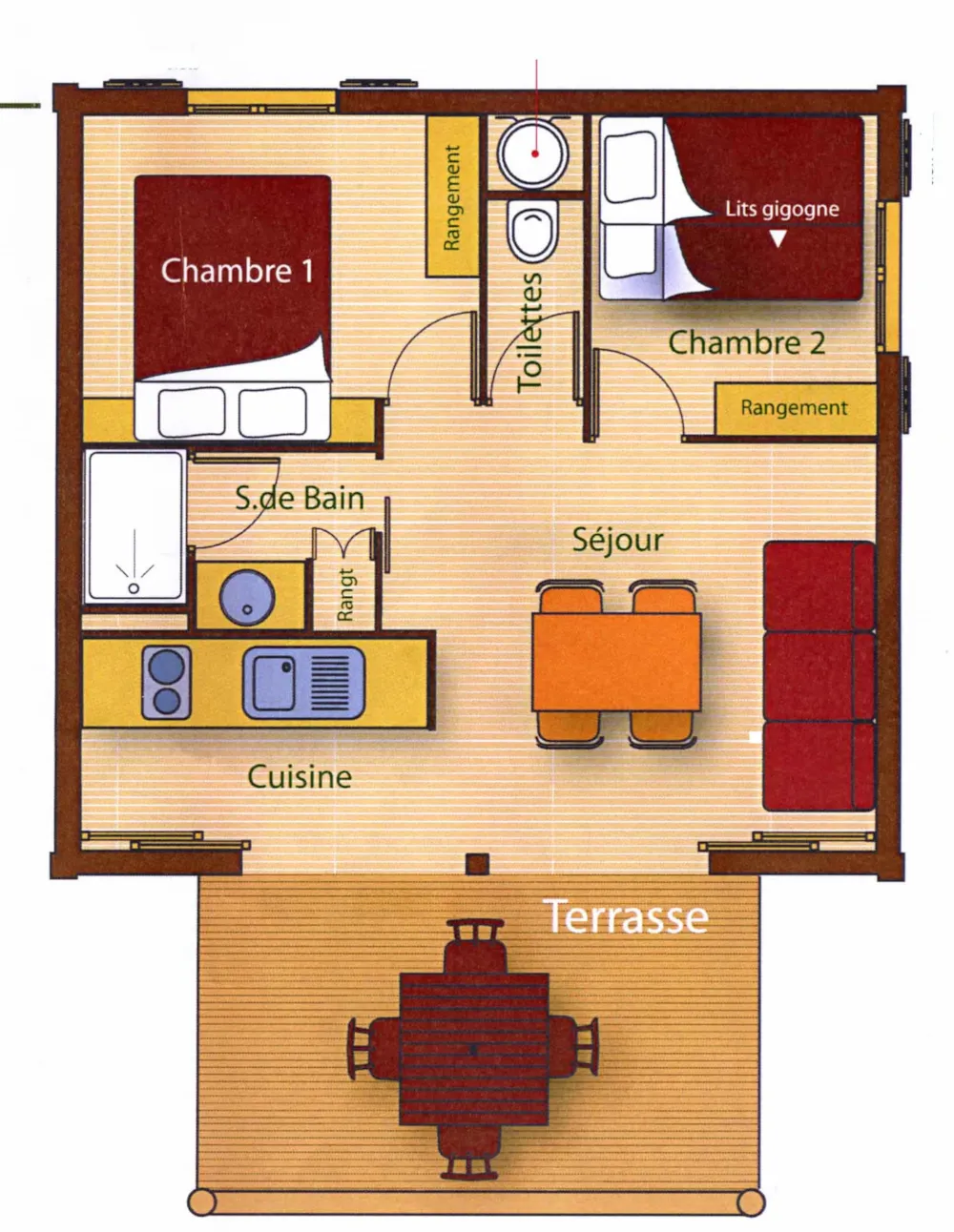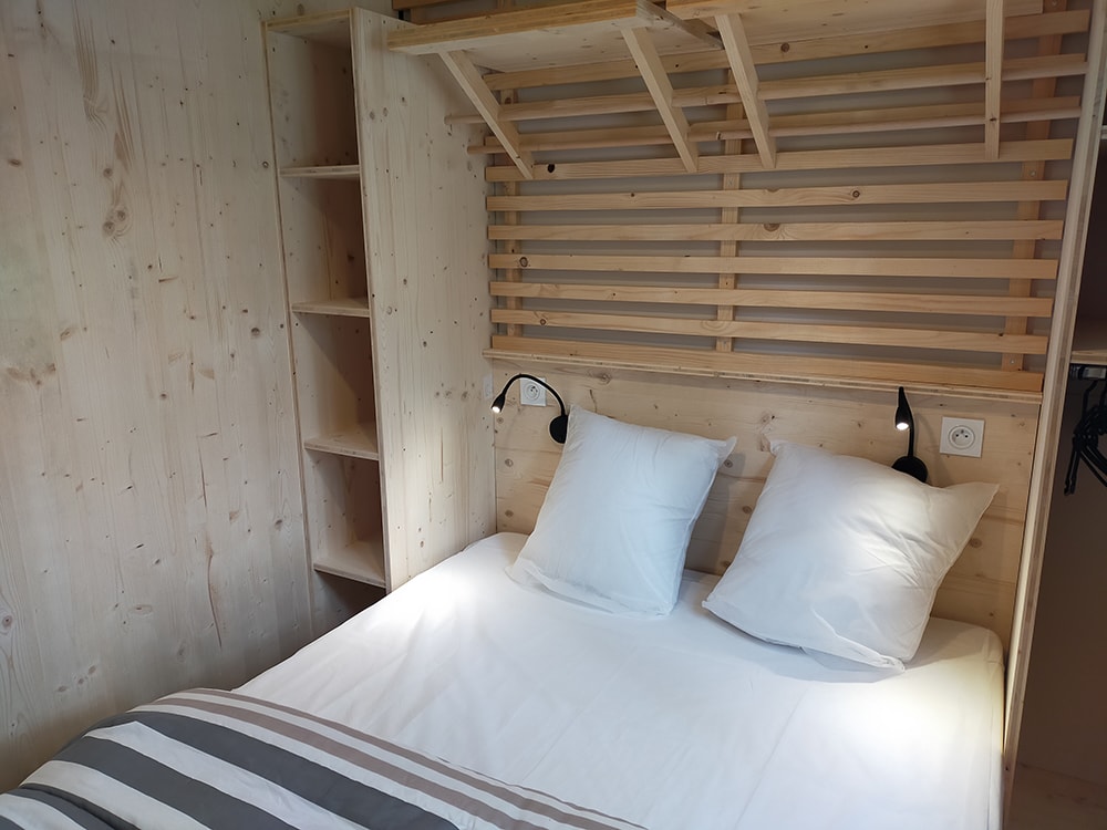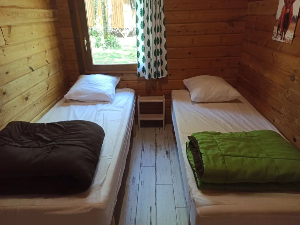 Das Chalet besteht aus einem Schlafzimmer mit Doppelbett, ein Schlafzimmer mit zwei Etagenbetten 90 x 190 cm, Zimmer Bad mit WC und einem Wohnzimmer mit Kochnische und ein Fünftel für eine Person. Traditionelle Herstellung, Blockhäuser Qualität bieten allen Komfort eines wirklichen Hauses (Fliesenboden, Isolierung, Fensterläden) kombiniert mit dem Charme des Holzes. Es verfügt über eine große Holzterrasse.
