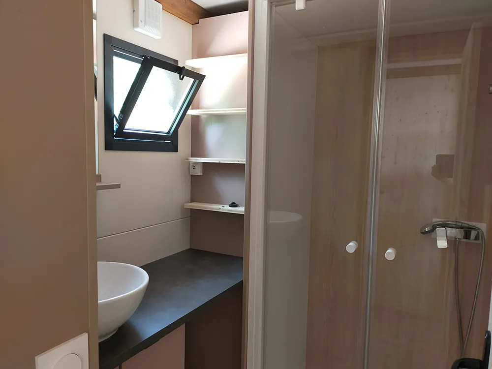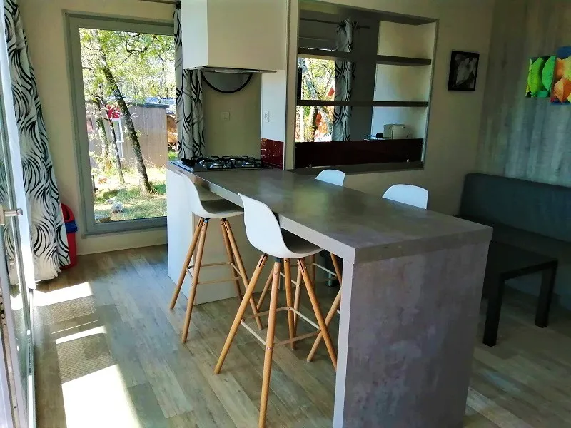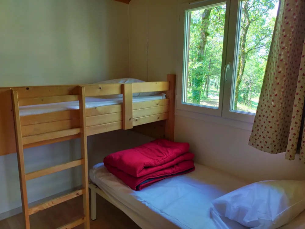 deales Ferienhaus für eine Familie von 5 Personen, mit drei Kindern Einzelbetten weil es ein Doppelzimmer und ein Zimmer mit drei bietet 90 x 190. Standort unter den Eichen in einer ruhigen Gegend der Campingplatz schattiert.