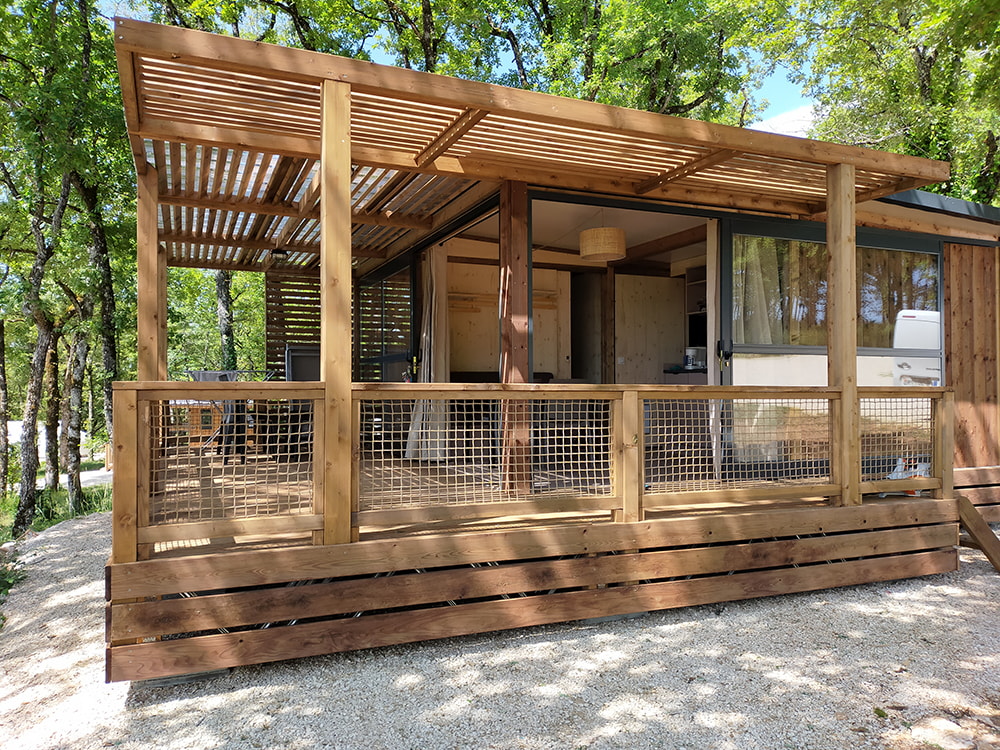 Neu im Jahr! Ein sehr helles Chalet mit einem Eckerker, der sich zu einem grünen Meer hin öffnet. Ein Vollholz-Interieur im Einklang mit aktuellen Werten Bestehend aus zwei Schlafzimmern, überdachter Terrasse und moderner Küche.