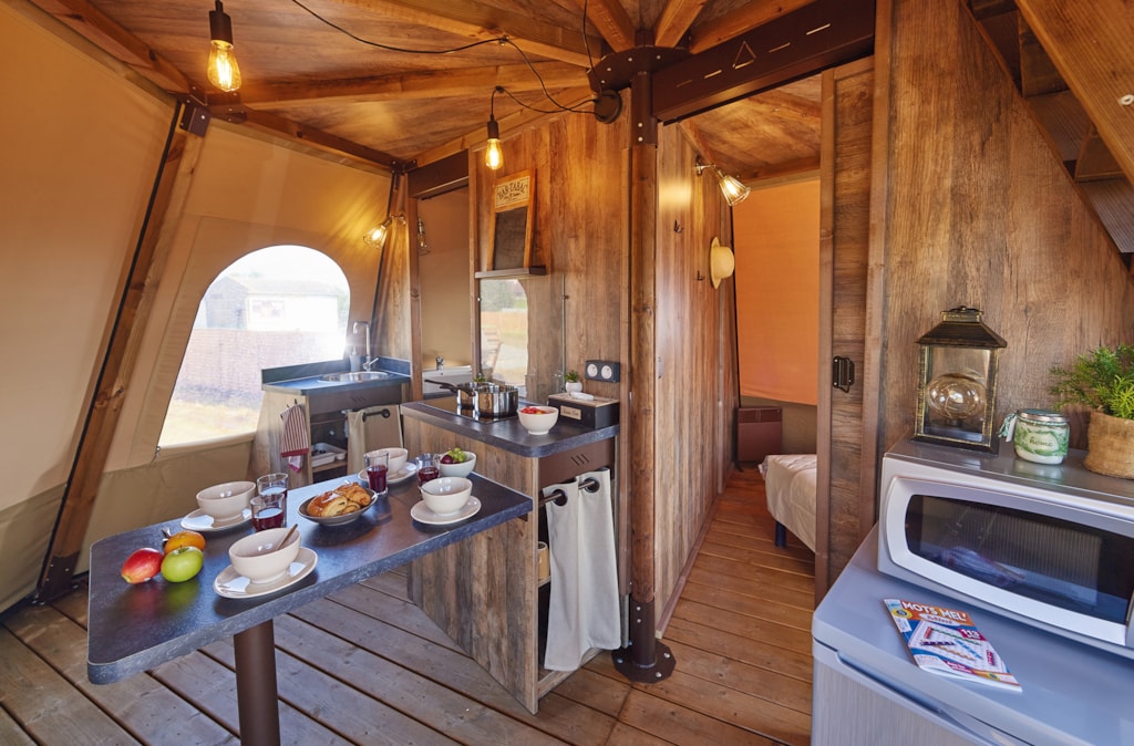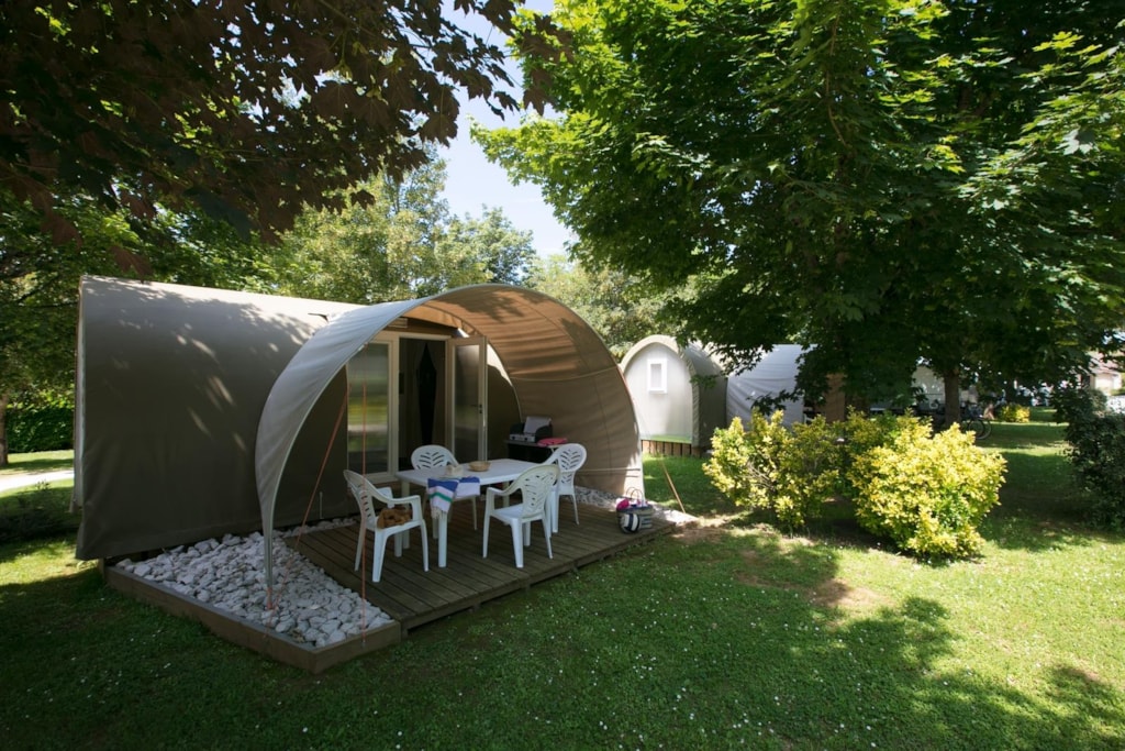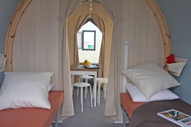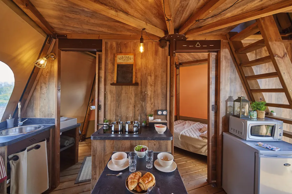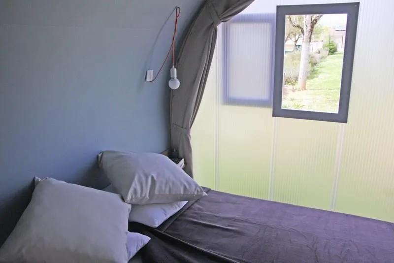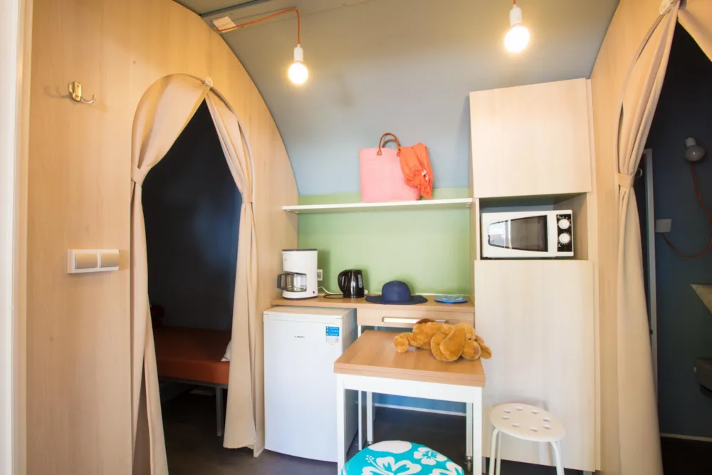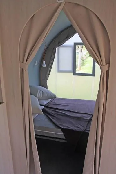Coco Sweet Duo : Innenfläche: 11 m² + Überdachte Terrasse COCO ist ein Wohnmobil mit einer runden Form, die mit einer Leinwand bedeckt ist. Seine Wände sind starr und isoliert, seine Haustür ist verschlossen. Es bietet Platz für 2 Personen mit seinen Zimmern mit Boxspring mit Matratze ausgestattet. Es bietet keine Sanitäranlagen, sondern eine Küchenzeile mit einer Mikrowelle und einem Kühlschrank. Das Leben in COCO setzt sich auf der Terrasse unter der Markise fort. COCO ist neu! Suchen Sie eine ungewöhnliche Unterkunft für Ihren Urlaub, die Einfachheit, Natur und Komfort kombiniert? COCO Sweet ist für dich! Im Inneren finden Sie alle Annehmlichkeiten eines Mobilheims: 1 Schlafzimmer mit einem Doppelbett von 140 (Bettdecken, Kissen, Matratzenauflagen zur Verfügung gestellt). Und am Eingang der Küchenbereich mit Tisch und Hockern, Kühlschrank, Herd, Mikrowelle, Kaffeemaschine und Geschirr für 4 Personen. Sie haben auch eine Terrasse mit großer Markise mit Gartenmöbeln. Vermietung ohne Wasser oder Sanitär - Ohne Heizung