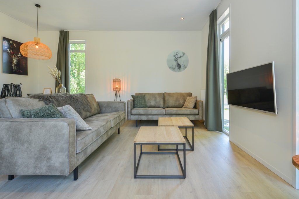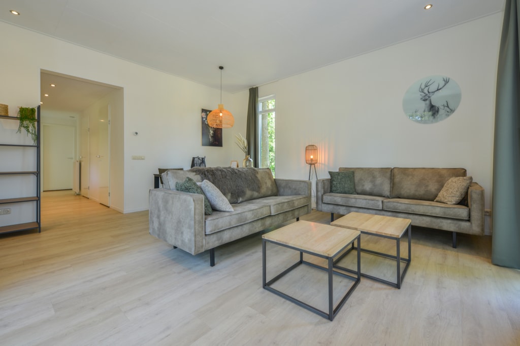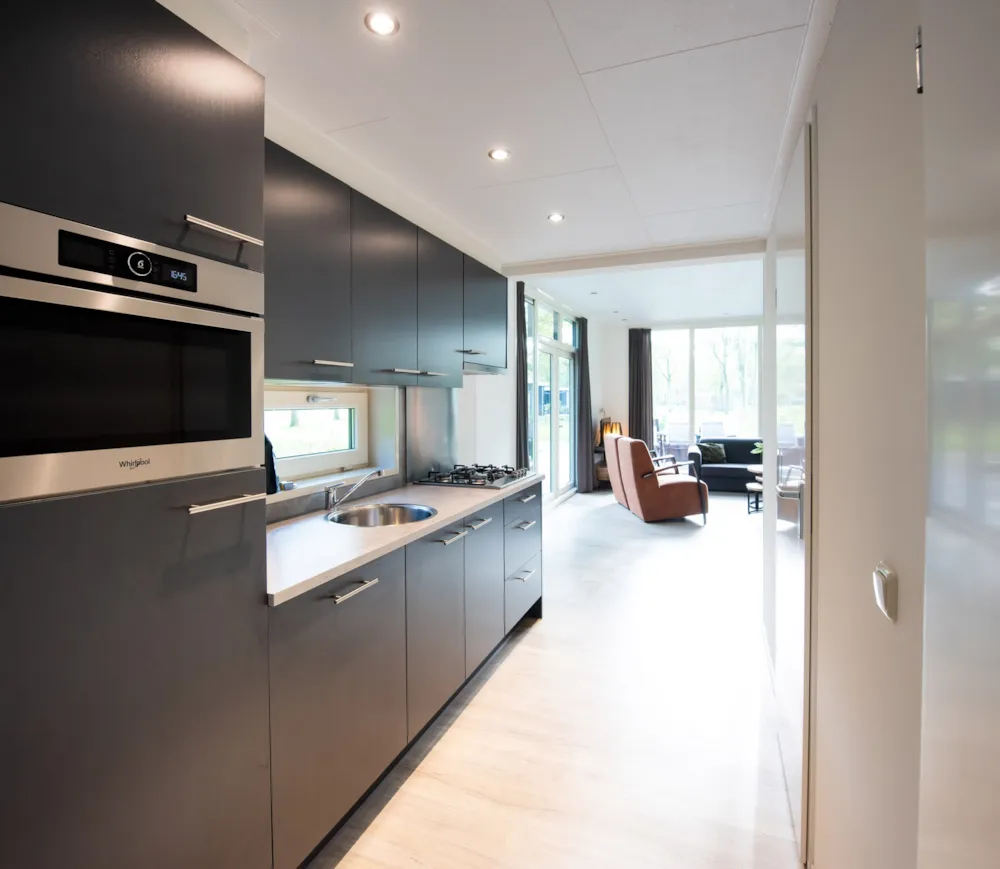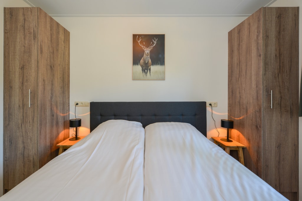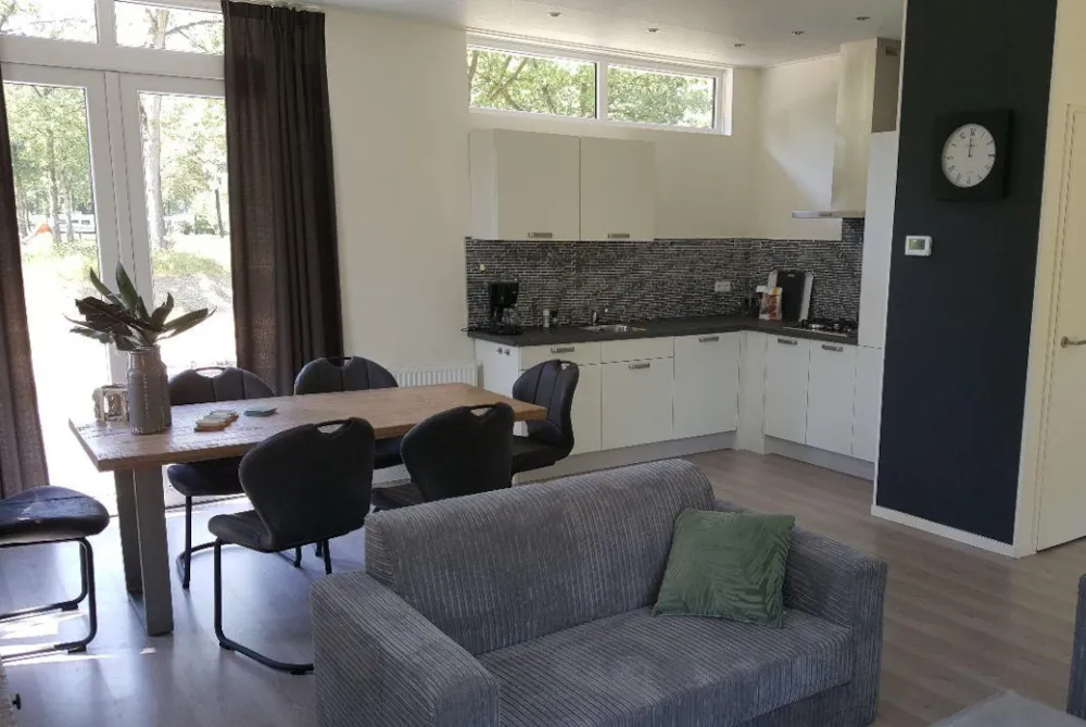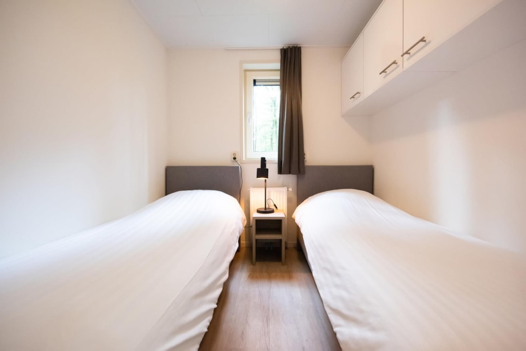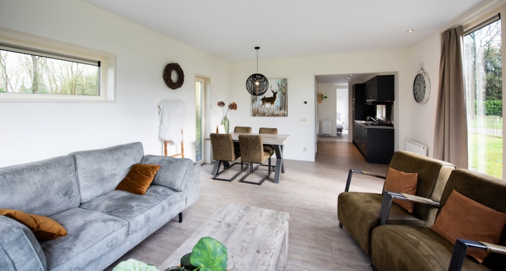 Deze vakantiewoning kent veel comfort met extra ruime woonkamer en open keuken. Door grote raampartijen voelt het ook binnen alsof u zich midden in de natuur bevindt. De keuken beschikt over vaatwasser, combimagnetron, waterkoker en filterkoffieapparaat. Twee slaapkamers zijn voorzien van eenpersoons boxsprings. Één slaapkamer is voorzien van een stapelbed. Dit stapelbed is 90 cm breed en voorzien van 20 cm hoge polyethermatrassen. Daarnaast heeft deze accommodatie naast een toilet in de badkamer ook nog een extra apart toilet.