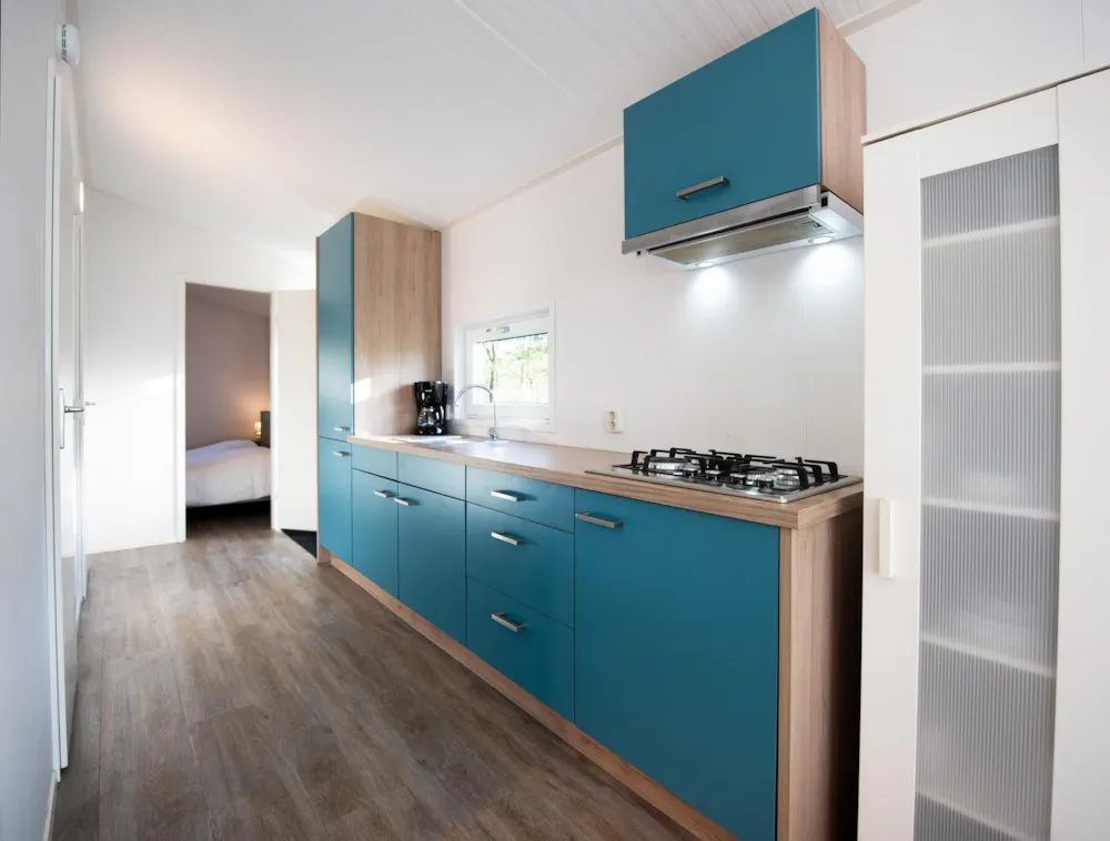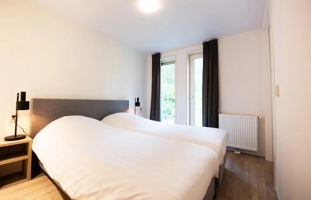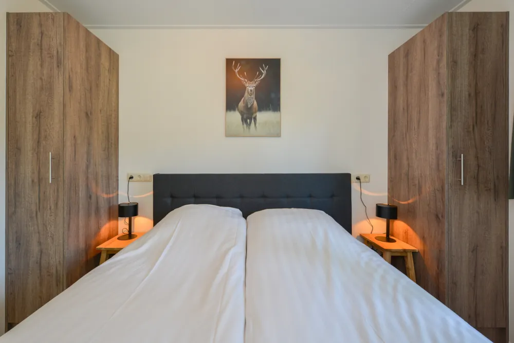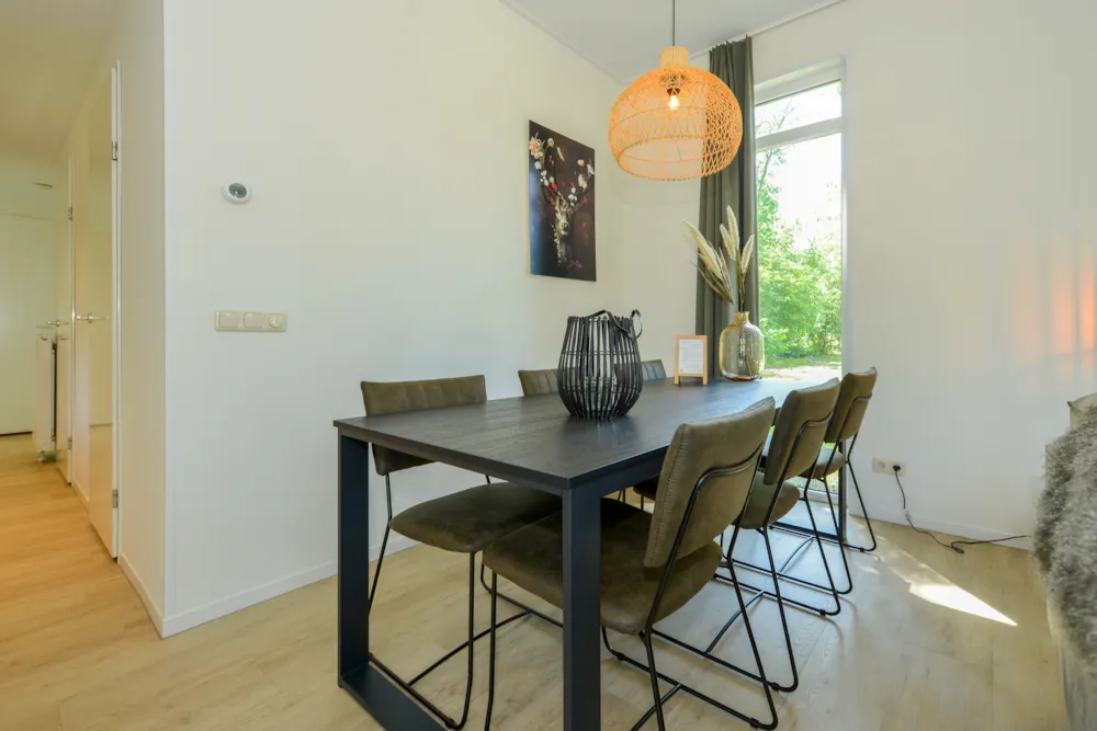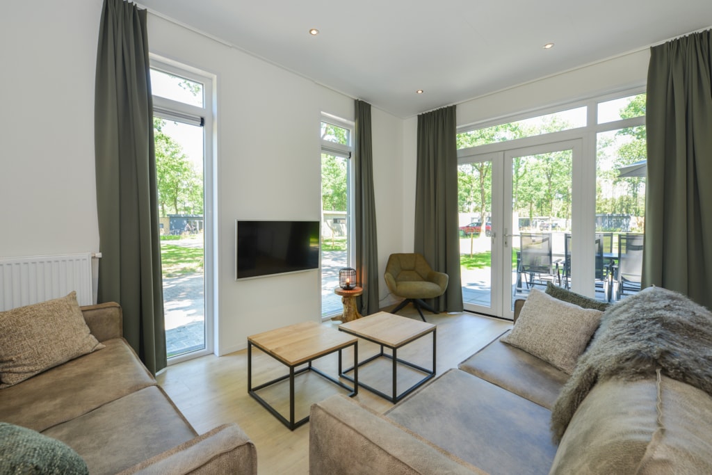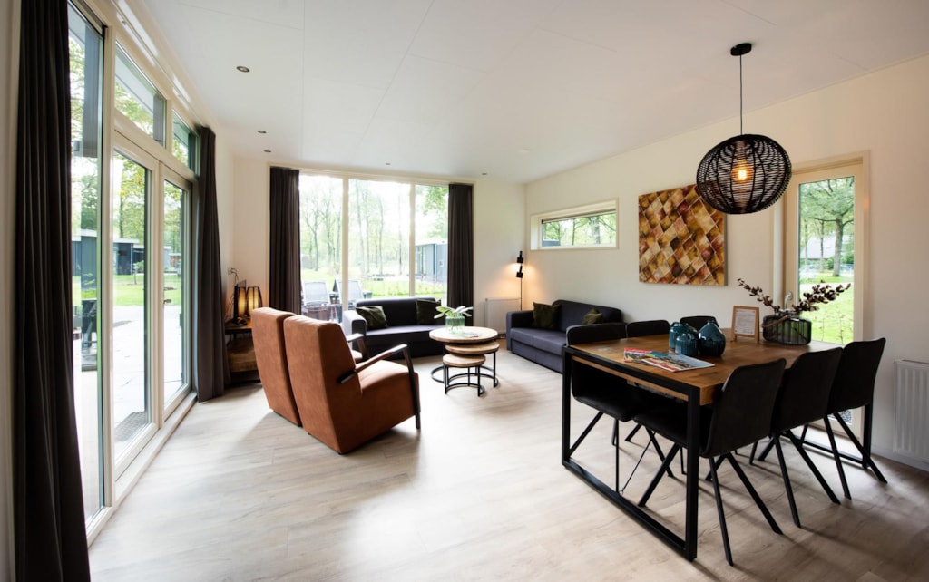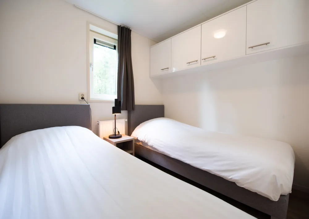 Deze vakantiewoning kent veel comfort met extra ruime woonkamer en open keuken. Door grote raampartijen voelt het ook binnen alsof u zich midden in de natuur bevindt. De keuken beschikt over vaatwasser, combimagnetron, waterkoker en filterkoffieapparaat. Twee slaapkamers zijn voorzien van eenpersoons boxsprings. Één slaapkamer is voorzien van een stapelbed. Dit stapelbed is 90 cm breed en voorzien van 20 cm hoge polyethermatrassen. Daarnaast heeft deze accommodatie naast een toilet in de badkamer ook nog een extra apart toilet.