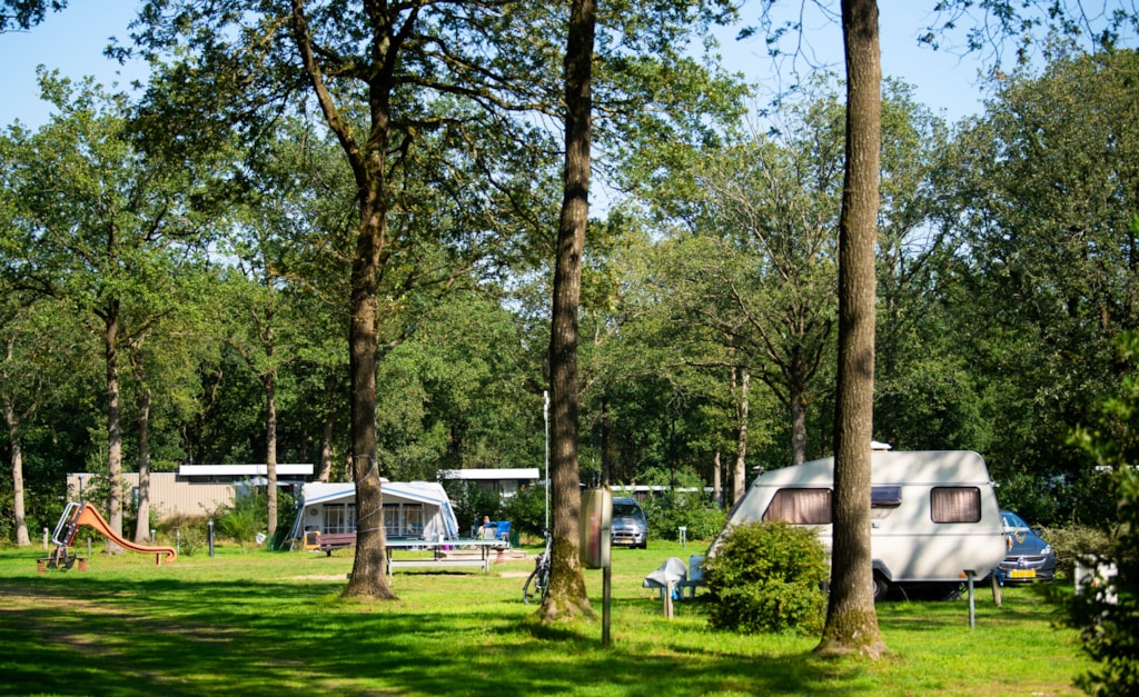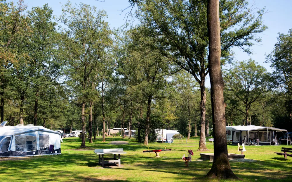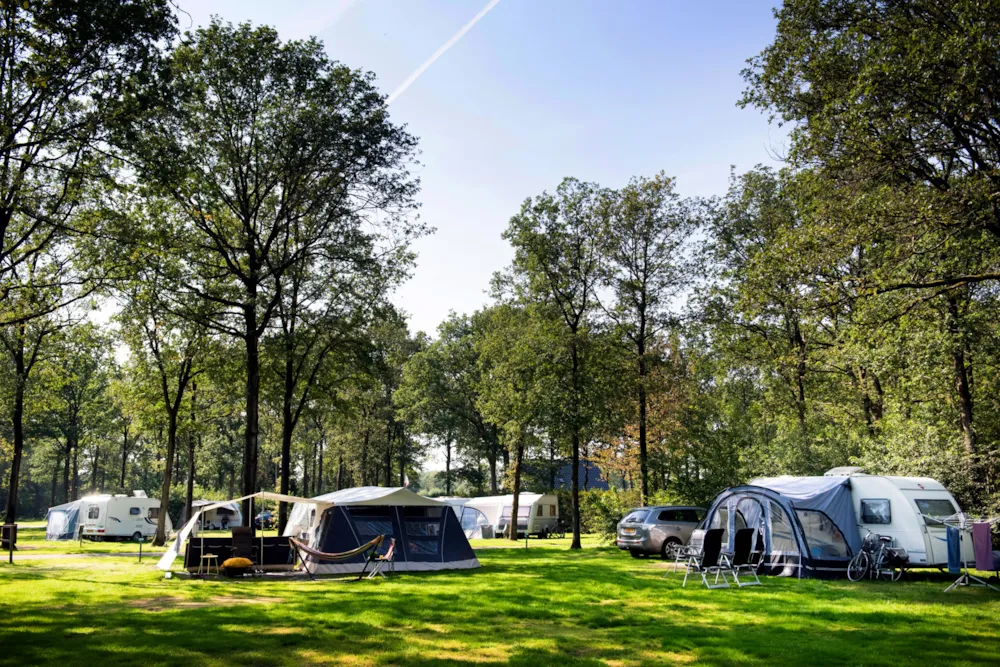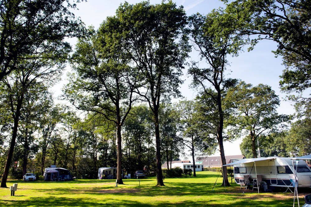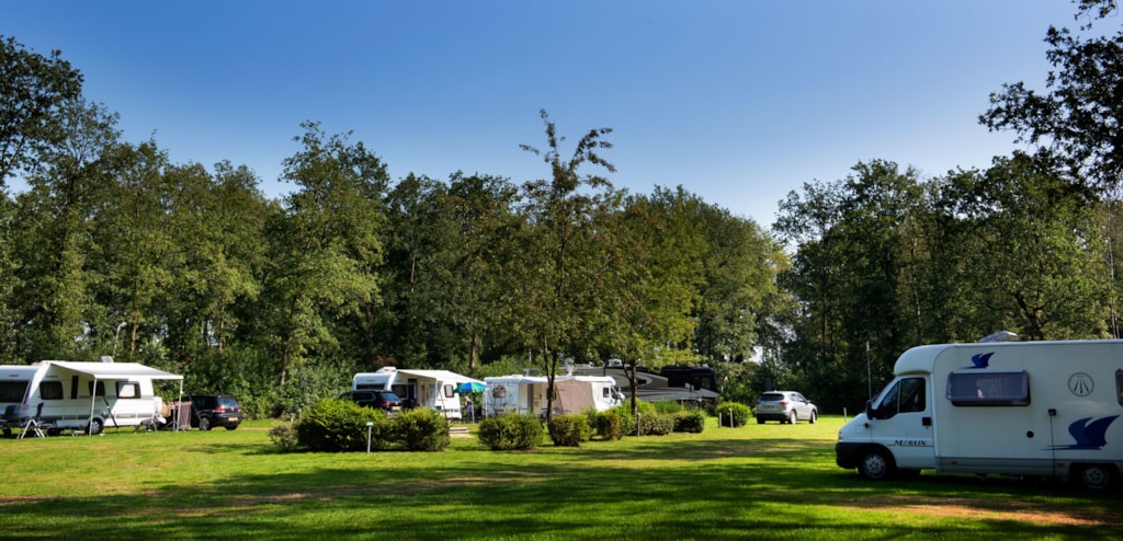 Kamperen op een extra ruime kampeerplaats (minimaal 100m2) met een eigen water-, riool-, cai- en elektra- aansluiting 12 amp. Op een zonnig en schaduwrijk veld. U kunt gebruik maken van het centraal gelegen moderne sanitair gebouw. Warm water en douche gratis.