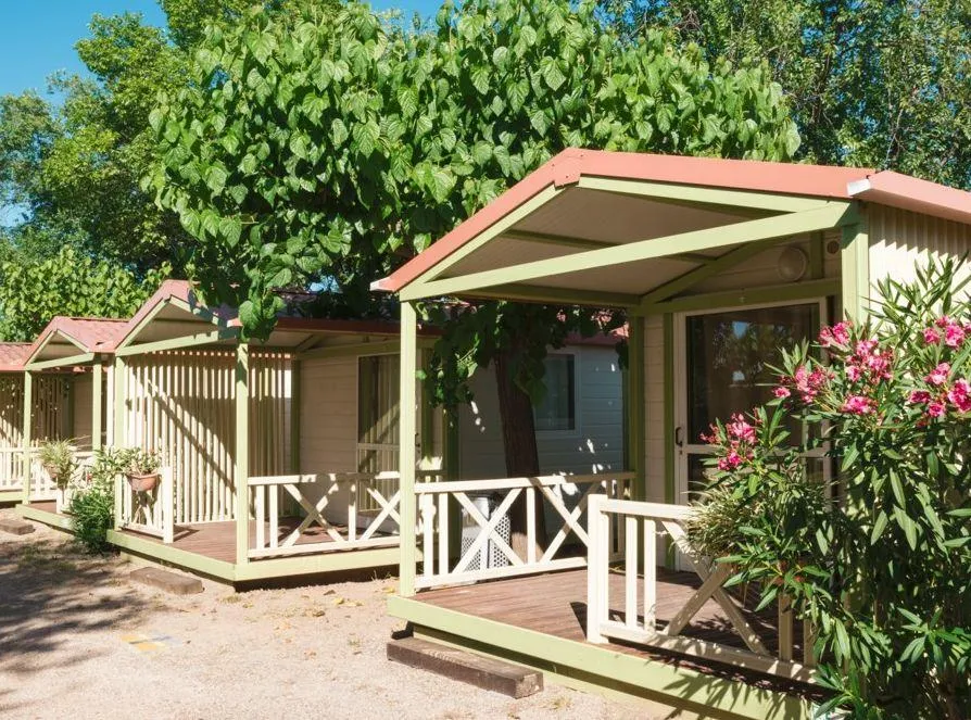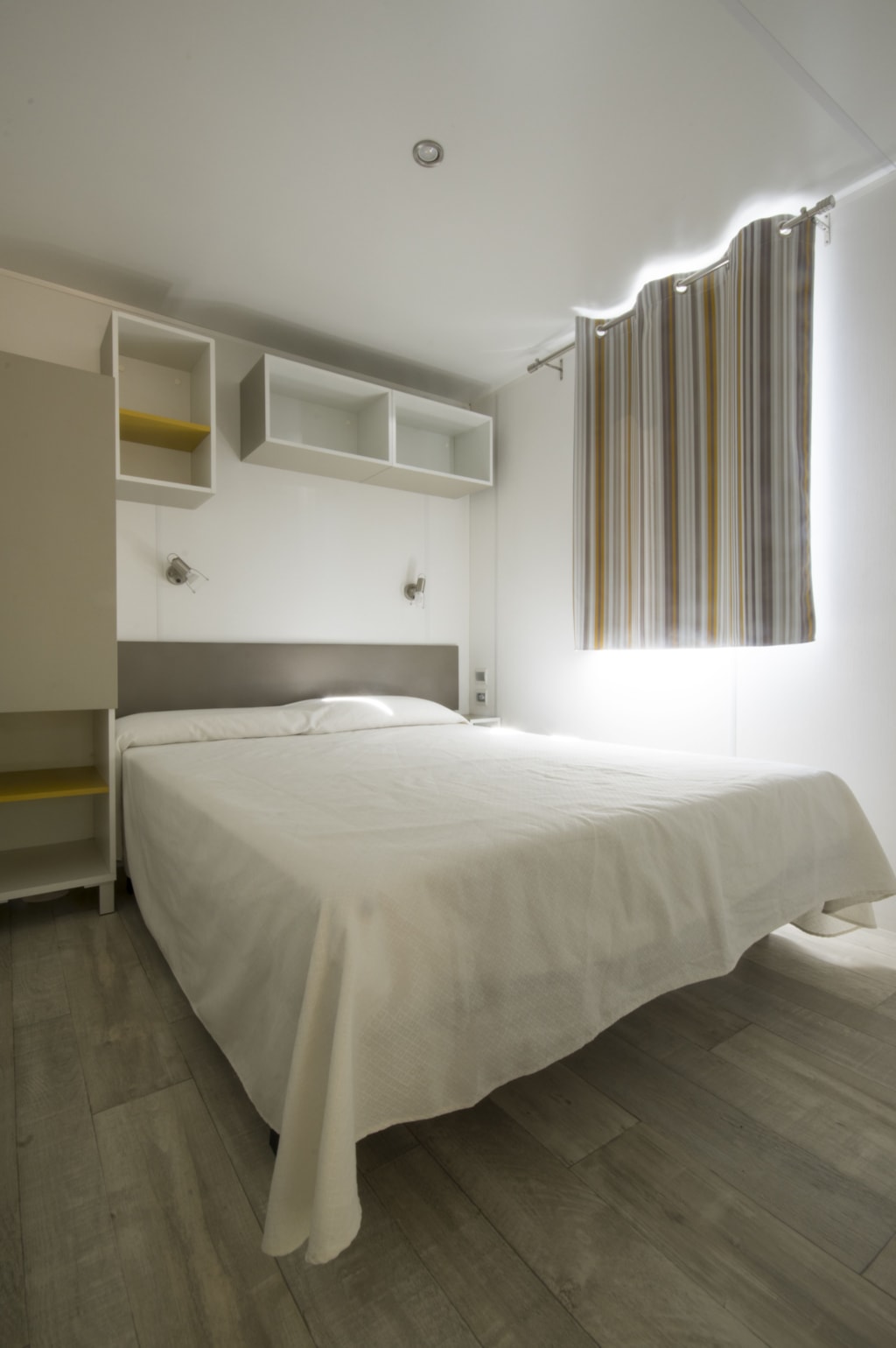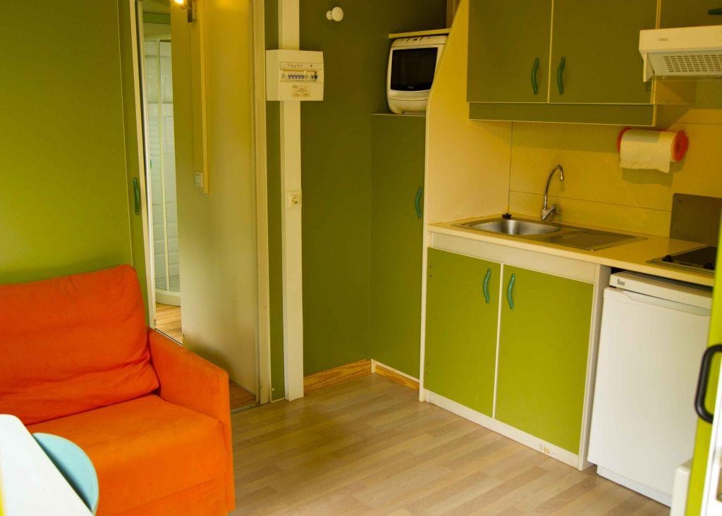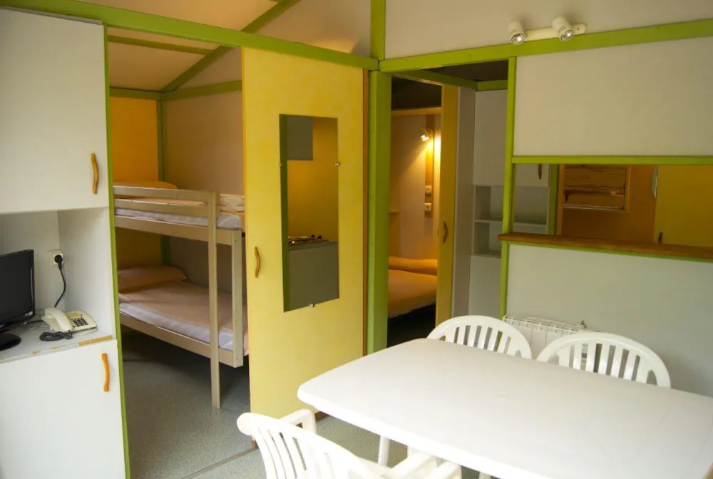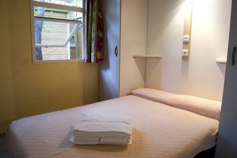 Der Bungalow Typ C2 ist ein sehr komfortabler und funktionaler Campitel-Bungalow aus Holz mit einer Kapazität von 4-5 Personen. Er besteht aus 2 Schlafzimmern, Bad, Küche, Wohnzimmer mit Essbereich und einer Schlafcouch für eine Person, überdachter Terrasse und Parkplatz im Freien für ein Auto. Das Bad besteht aus WC, Waschbecken und Dusche mit Warmwasser. Küche mit Koch- und Essgeschirr, Herd, Spüle und Kühlschrank. Ein Schlafzimmer ist mit einem Doppelbett ausgestattet und das andere mit einem Etagenbett für zwei Personen. Er verfügt auch über TV, Telefon, Mikrowelle und Gartenmöbel auf der Terrasse. Inklusive Bettwäsche und Handtücher mit wöchentlichem Wechsel. Bungalow C2, 4/5 Pers. - 30 m2.