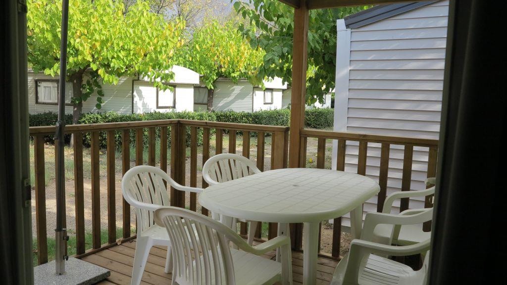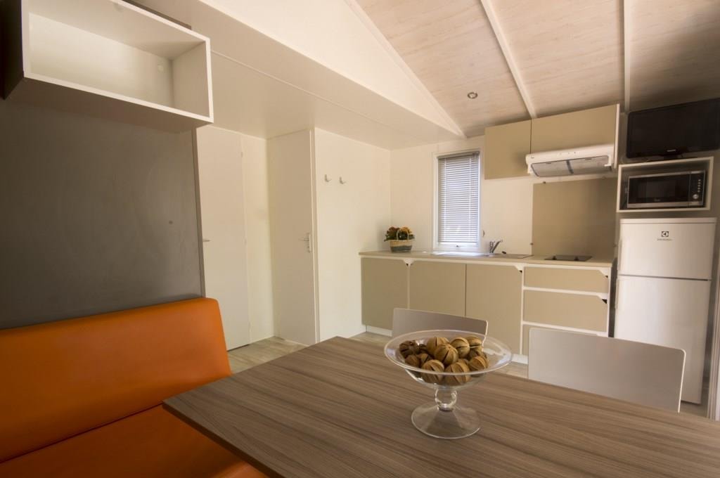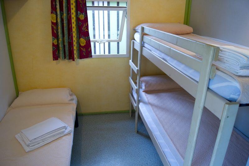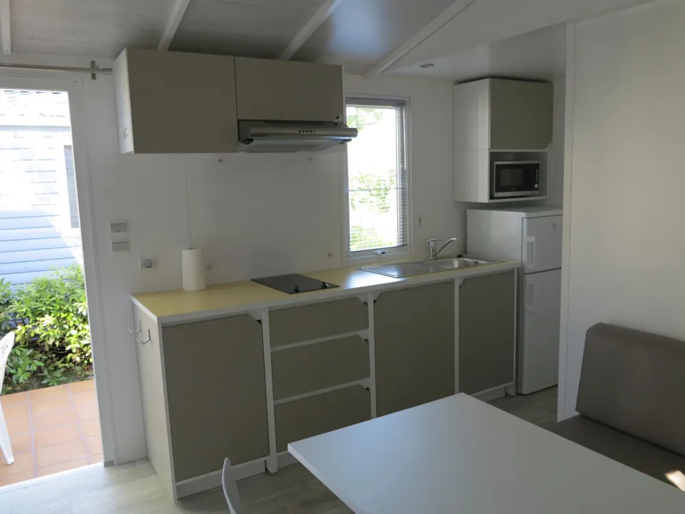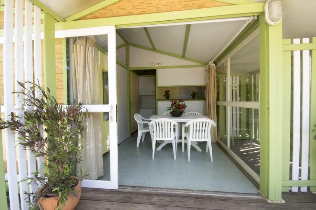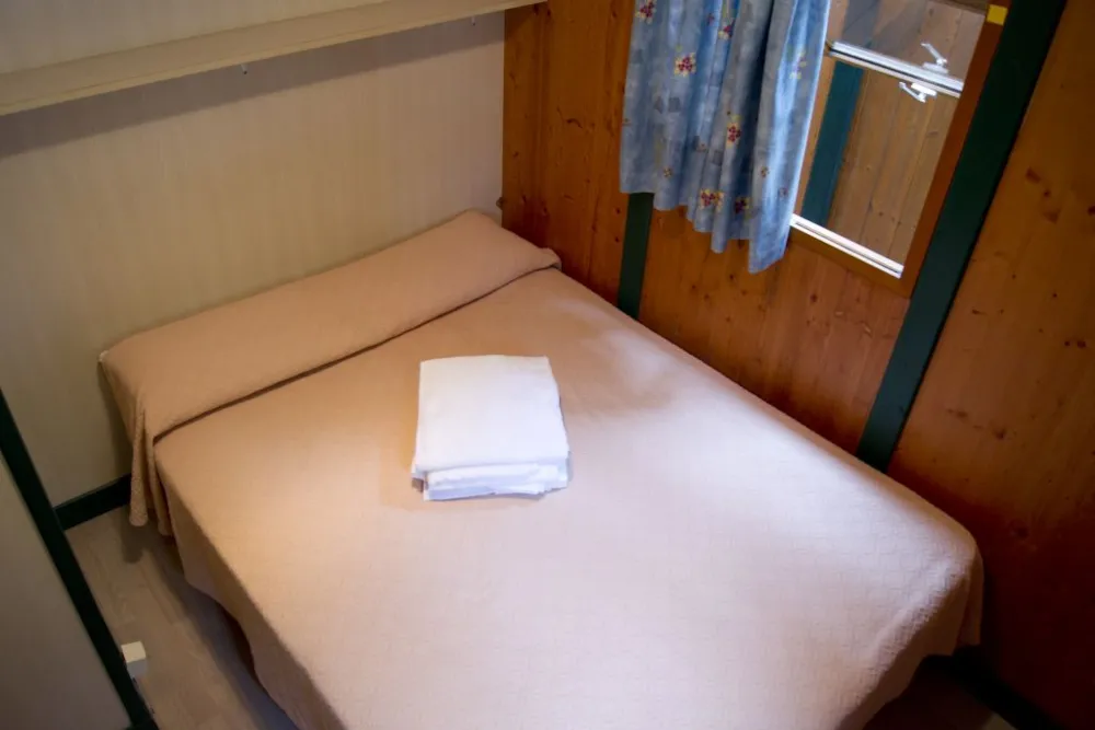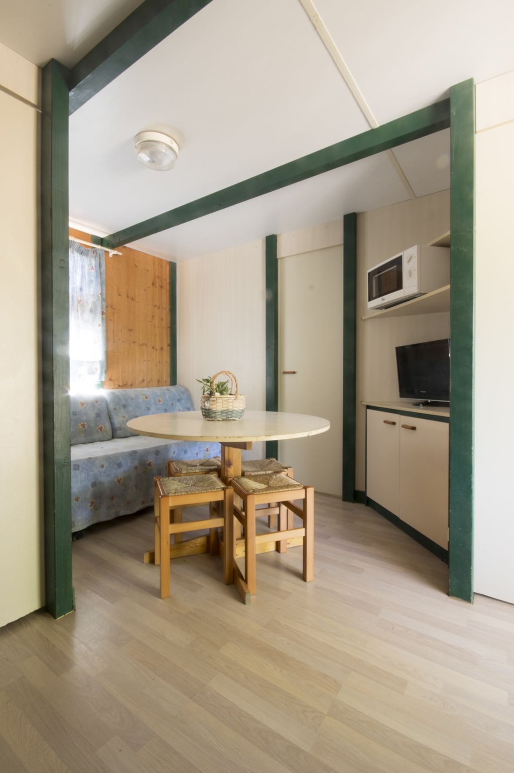 Der Bungalow Typ C2 ist ein sehr komfortabler und funktionaler Campitel-Bungalow aus Holz mit einer Kapazität von 4-5 Personen. Er besteht aus 2 Schlafzimmern, Bad, Küche, Wohnzimmer mit Essbereich und einer Schlafcouch für eine Person, überdachter Terrasse und Parkplatz im Freien für ein Auto. Das Bad besteht aus WC, Waschbecken und Dusche mit Warmwasser. Küche mit Koch- und Essgeschirr, Herd, Spüle und Kühlschrank. Ein Schlafzimmer ist mit einem Doppelbett ausgestattet und das andere mit einem Etagenbett für zwei Personen. Er verfügt auch über TV, Telefon, Mikrowelle und Gartenmöbel auf der Terrasse. Inklusive Bettwäsche und Handtücher mit wöchentlichem Wechsel. Bungalow C2, 4/5 Pers. - 30 m2.