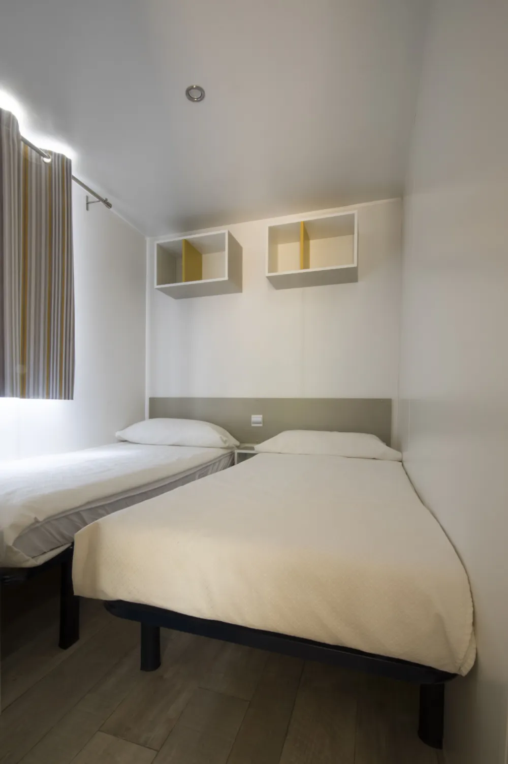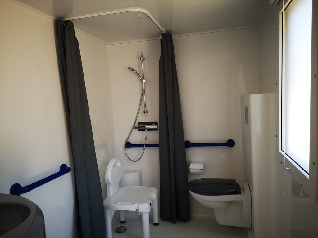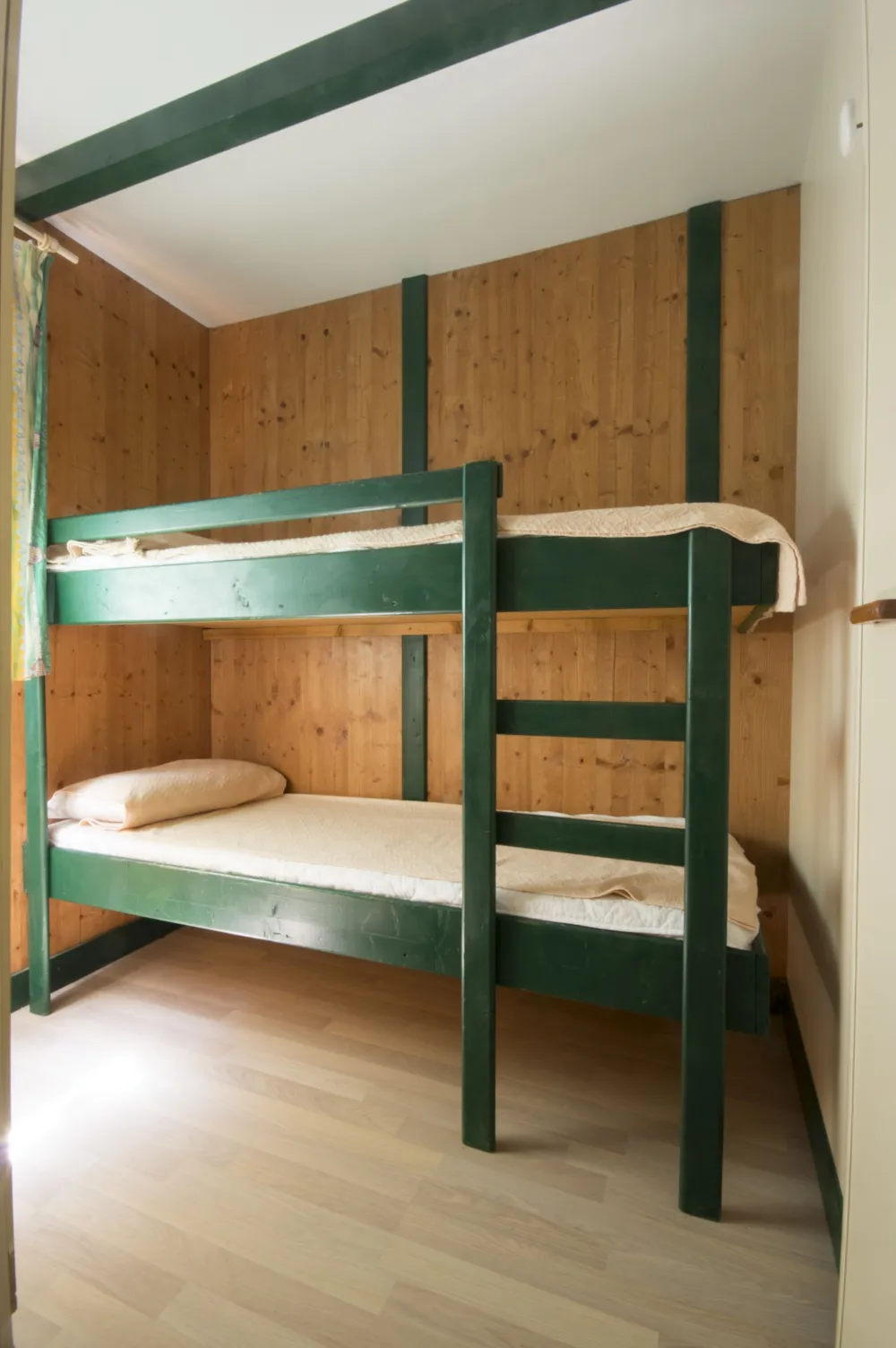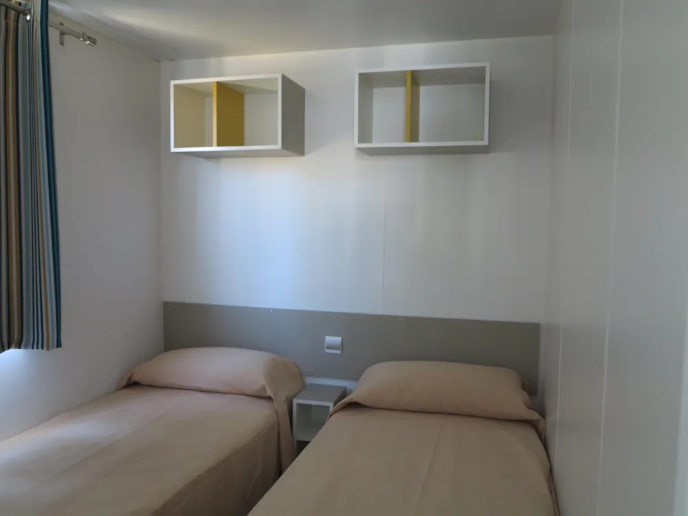 Der Bungalow Typ C2 ist ein sehr komfortabler und funktionaler Campitel-Bungalow aus Holz mit einer Kapazität von 4-5 Personen. Er besteht aus 2 Schlafzimmern, Bad, Küche, Wohnzimmer mit Essbereich und einer Schlafcouch für eine Person, überdachter Terrasse und Parkplatz im Freien für ein Auto. Das Bad besteht aus WC, Waschbecken und Dusche mit Warmwasser. Küche mit Koch- und Essgeschirr, Herd, Spüle und Kühlschrank. Ein Schlafzimmer ist mit einem Doppelbett ausgestattet und das andere mit einem Etagenbett für zwei Personen. Er verfügt auch über TV, Telefon, Mikrowelle und Gartenmöbel auf der Terrasse. Inklusive Bettwäsche und Handtücher mit wöchentlichem Wechsel. Bungalow C2, 4/5 Pers. - 30 m2.