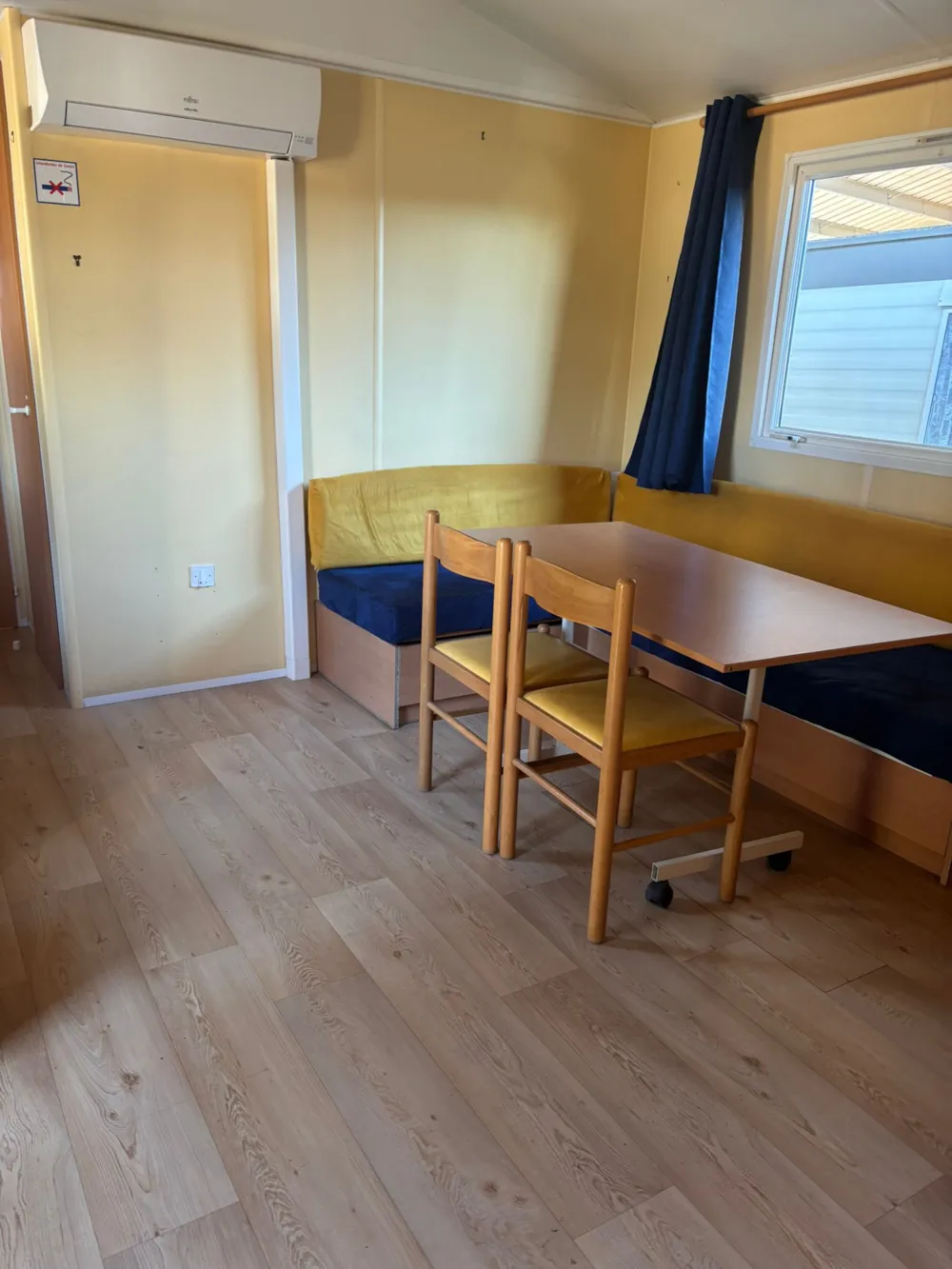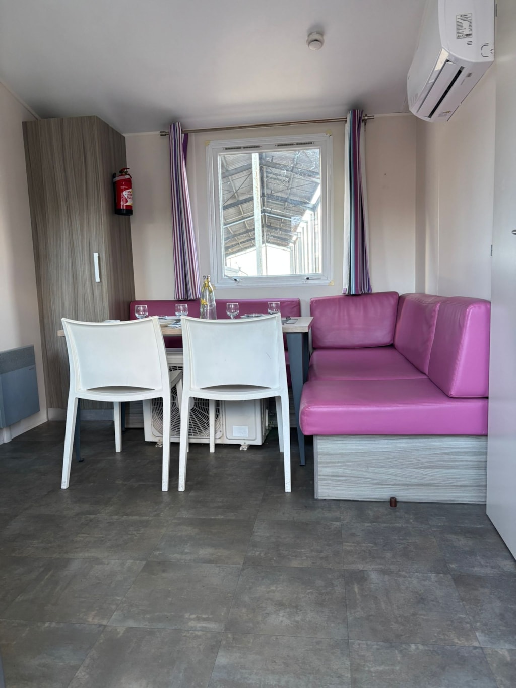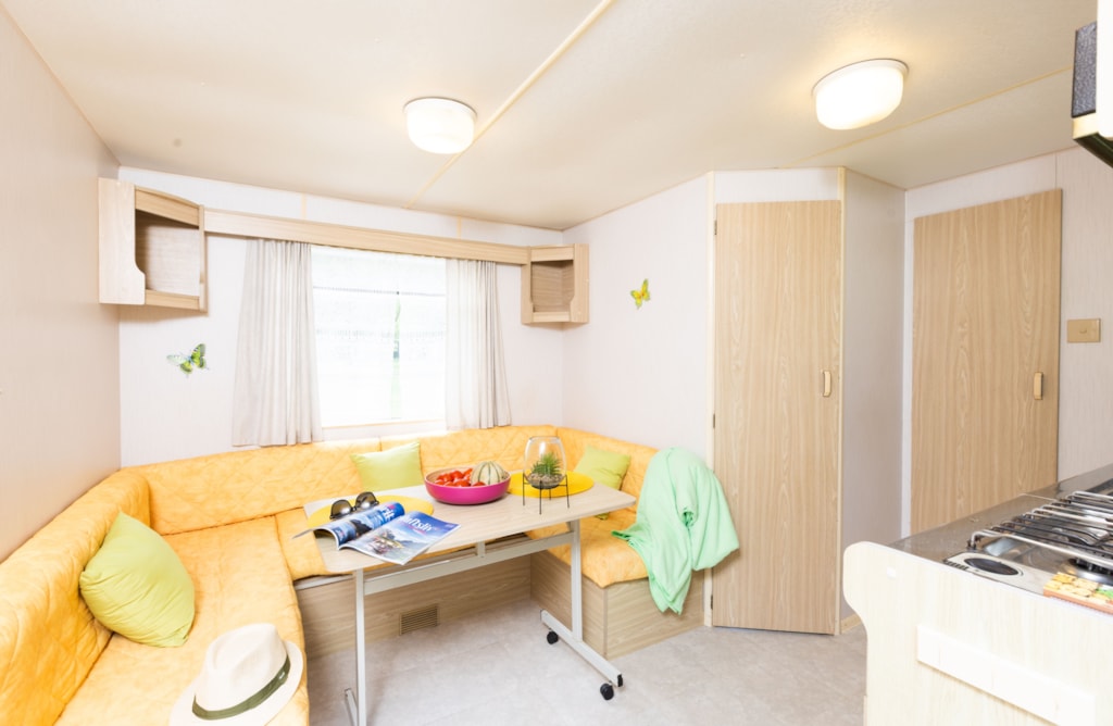 Comfortable and bright mobile home including a convivial dining area, a fully equipped kitchen, ample storage and a pleasant living space. Ideal for a relaxing holiday at Camping La Belle Etoile.