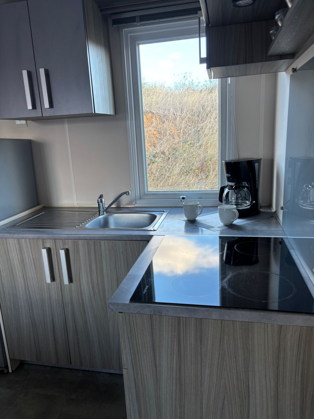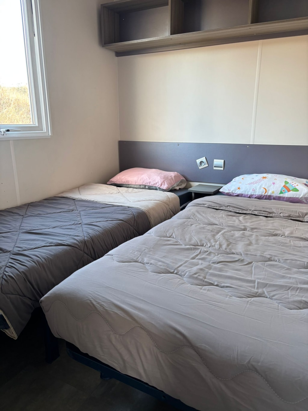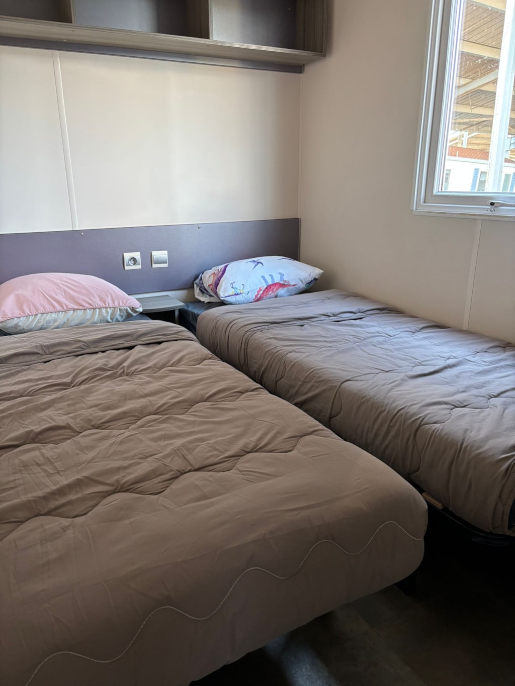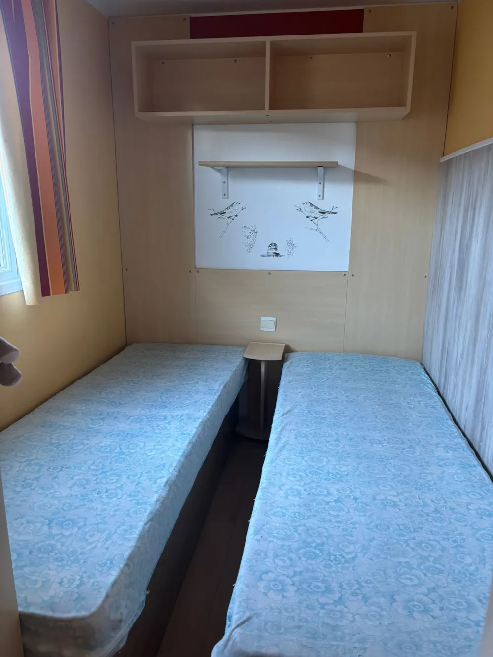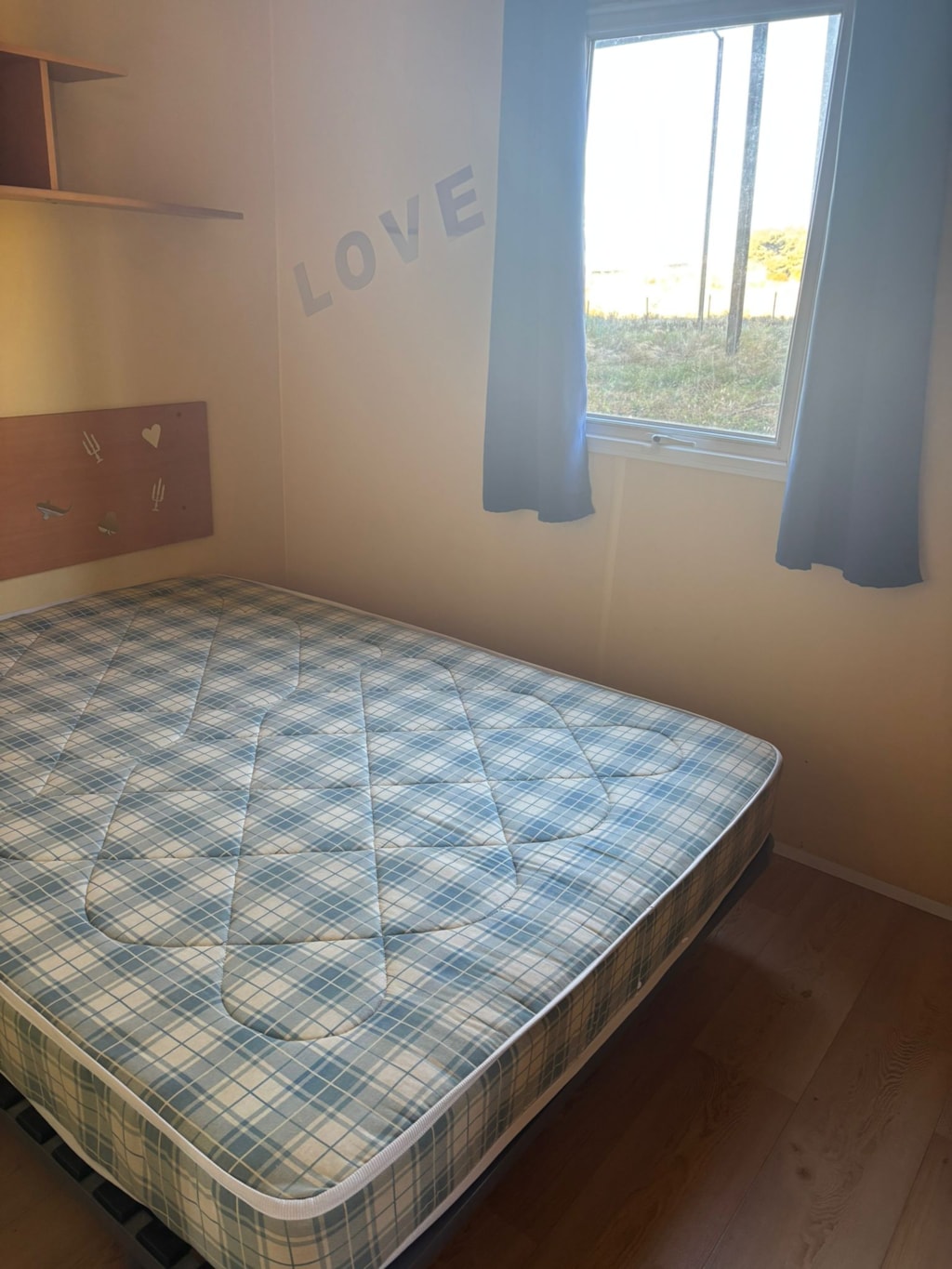 A mobile home with 2 bedrooms (one with a double bed and the other with 2 single beds) as well as a fully equipped kitchen, a bathroom with shower, separate toilet and a little covered terrace