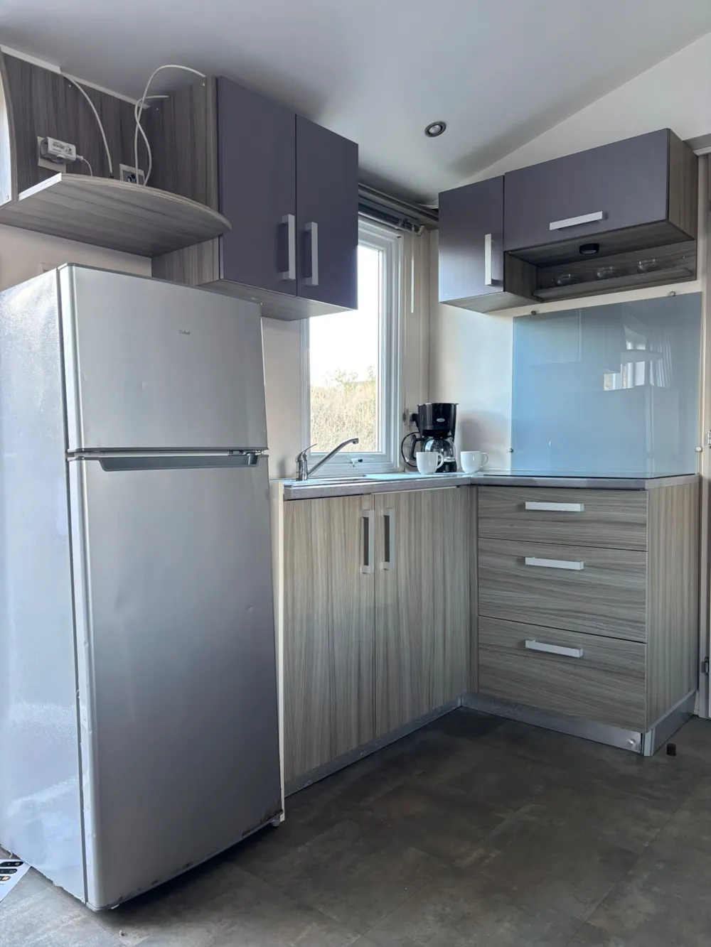 Comfortable 2-bedroom mobile home with fully equipped kitchen, dining area, comfortable living room, shower room and separate toilet. Ideal for a holiday with family or friends at Camping La Belle Étoile.