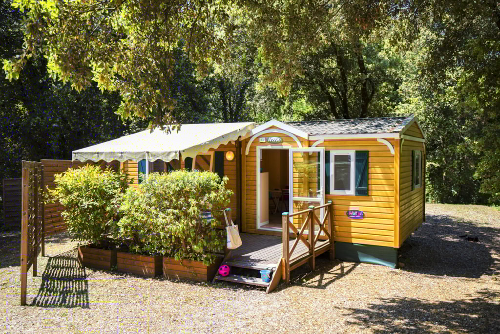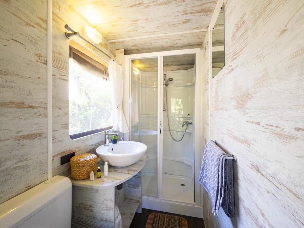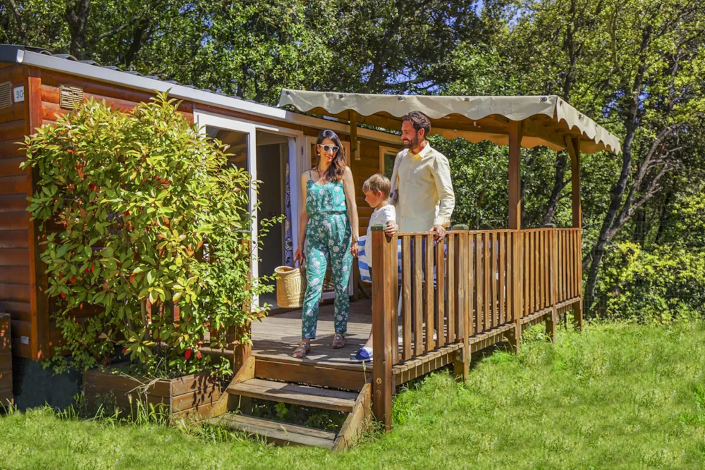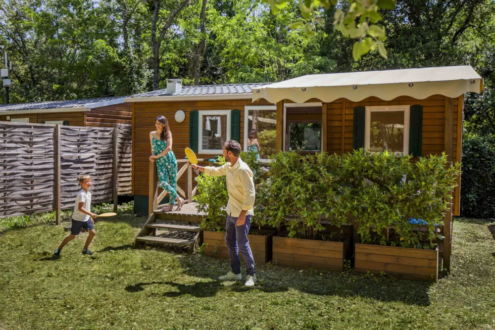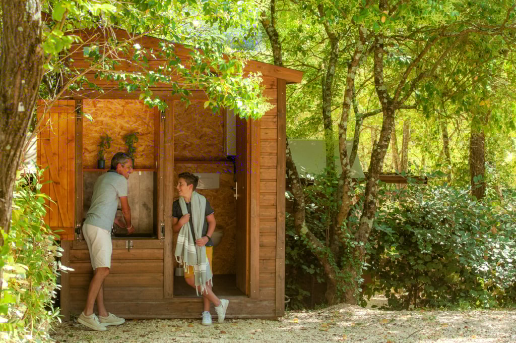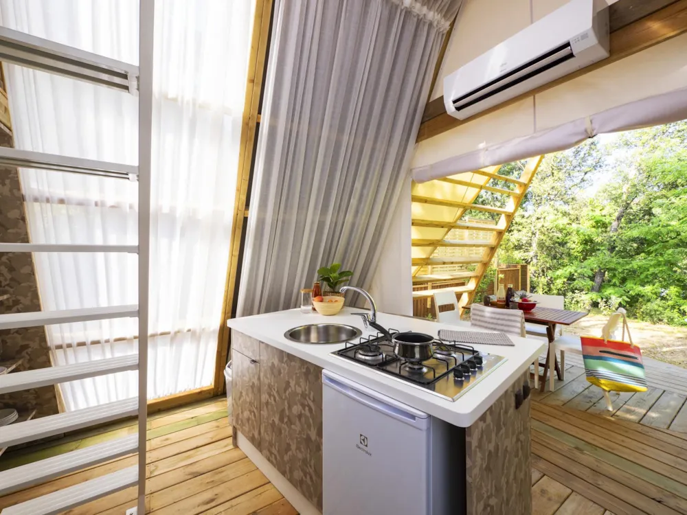 Die Air Lodge, die vollständig aus natürlichen Materialien gebaut wurde, ist ideal für ein Paar oder eine Familie von 4 Personen, die Privatsphäre und Entspannung auf dem Campingplatz Les Cascades wünschen. Bestehend aus 2 Schlafzimmern, eines im ersten Stock mit einem Doppelbett mit Blick auf die Sterne und einer kleinen Terrasse mit Blick auf den umliegenden Hügel, und einem Schlafzimmer im Erdgeschoss. Sie verfügen über eine voll ausgestattete Küche mit Kaffeemaschine, Wasserkocher, Toaster, Mikrowelle und Gasherd. Das Designer-Badezimmer verfügt über eine Dusche, ein Waschbecken und Toiletten. Draußen gibt es eine sehr große Terrasse mit Tisch, 4 Stühlen, 2 Liegestühlen zum Essen im Freien und Sonnenbaden. *Haustiere in der Unterkunfterlaubt : Nein *Moskitonetzefür Fenster : Ja