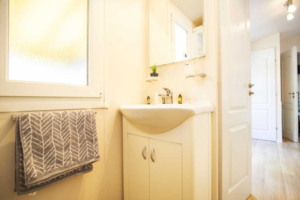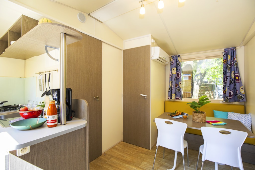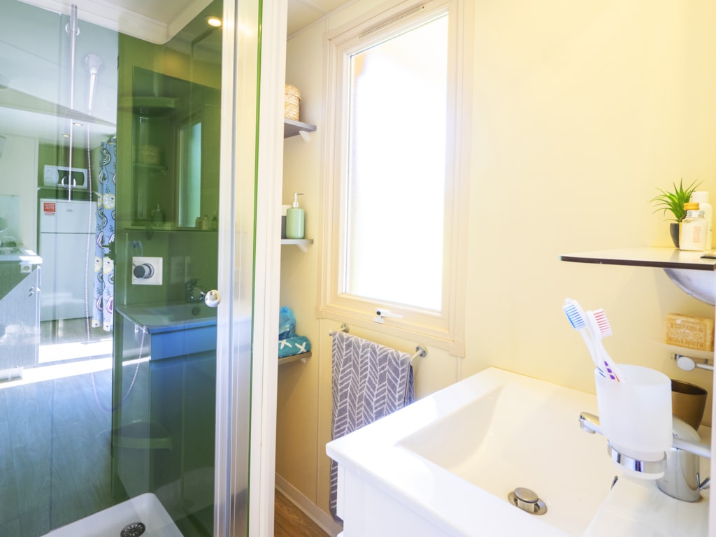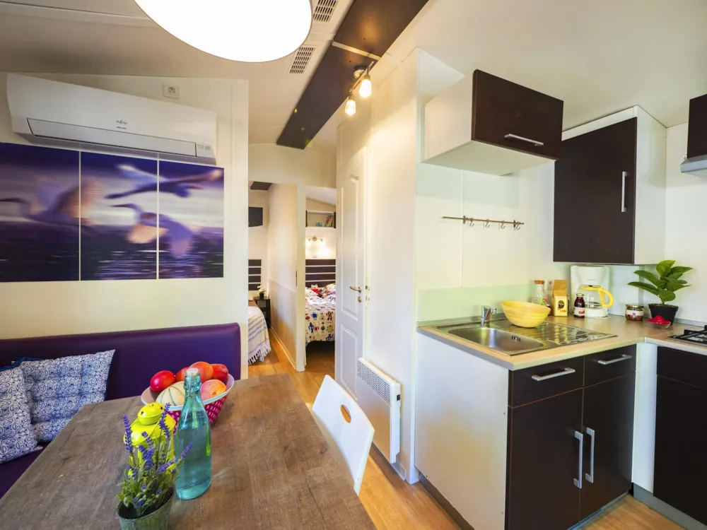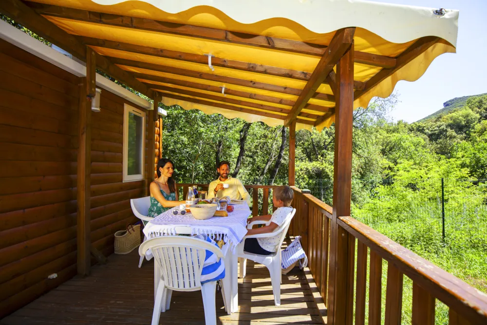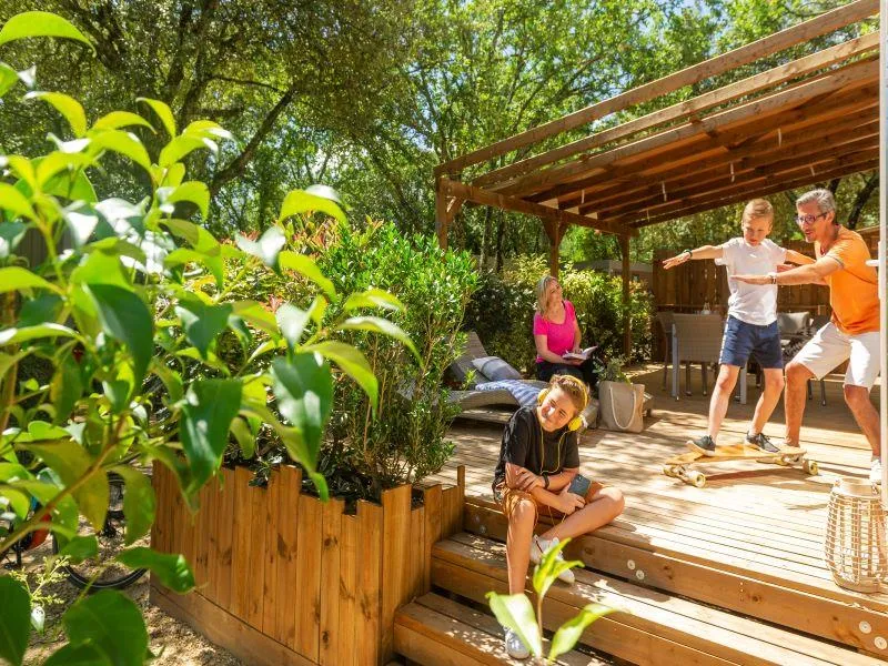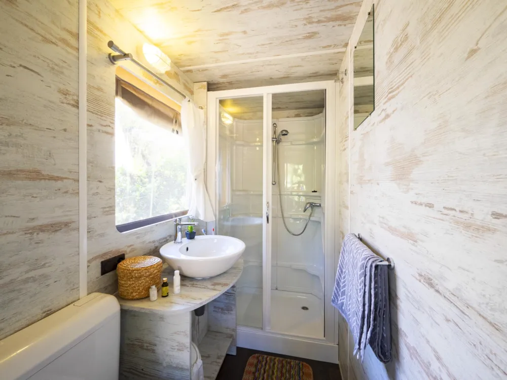 Die Air Lodge, die vollständig aus natürlichen Materialien gebaut wurde, ist ideal für ein Paar oder eine Familie von 4 Personen, die Privatsphäre und Entspannung auf dem Campingplatz Les Cascades wünschen. Bestehend aus 2 Schlafzimmern, eines im ersten Stock mit einem Doppelbett mit Blick auf die Sterne und einer kleinen Terrasse mit Blick auf den umliegenden Hügel, und einem Schlafzimmer im Erdgeschoss. Sie verfügen über eine voll ausgestattete Küche mit Kaffeemaschine, Wasserkocher, Toaster, Mikrowelle und Gasherd. Das Designer-Badezimmer verfügt über eine Dusche, ein Waschbecken und Toiletten. Draußen gibt es eine sehr große Terrasse mit Tisch, 4 Stühlen, 2 Liegestühlen zum Essen im Freien und Sonnenbaden. *Haustiere in der Unterkunfterlaubt : Nein *Moskitonetzefür Fenster : Ja