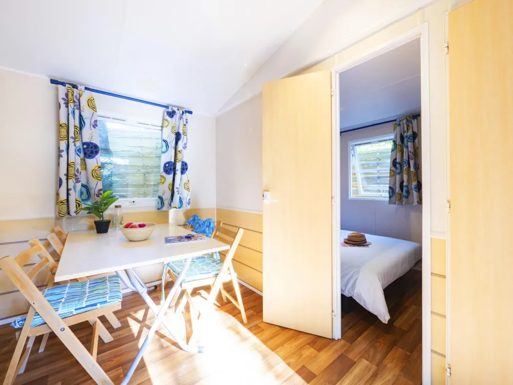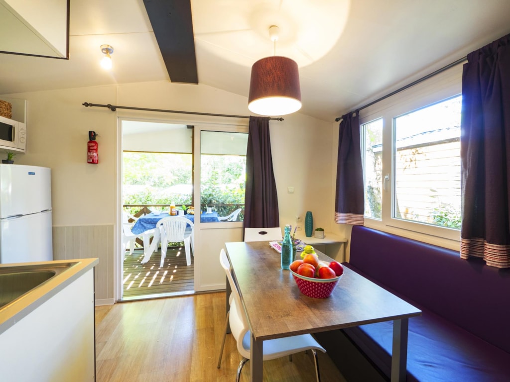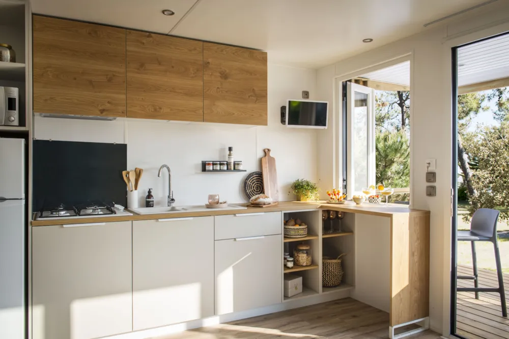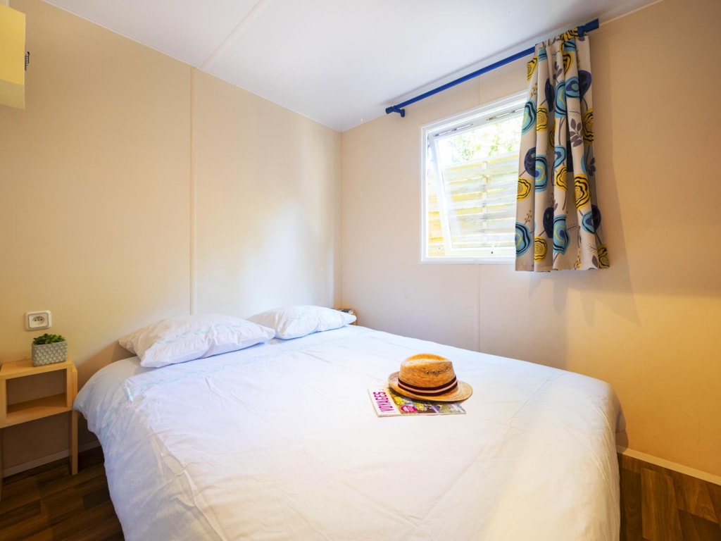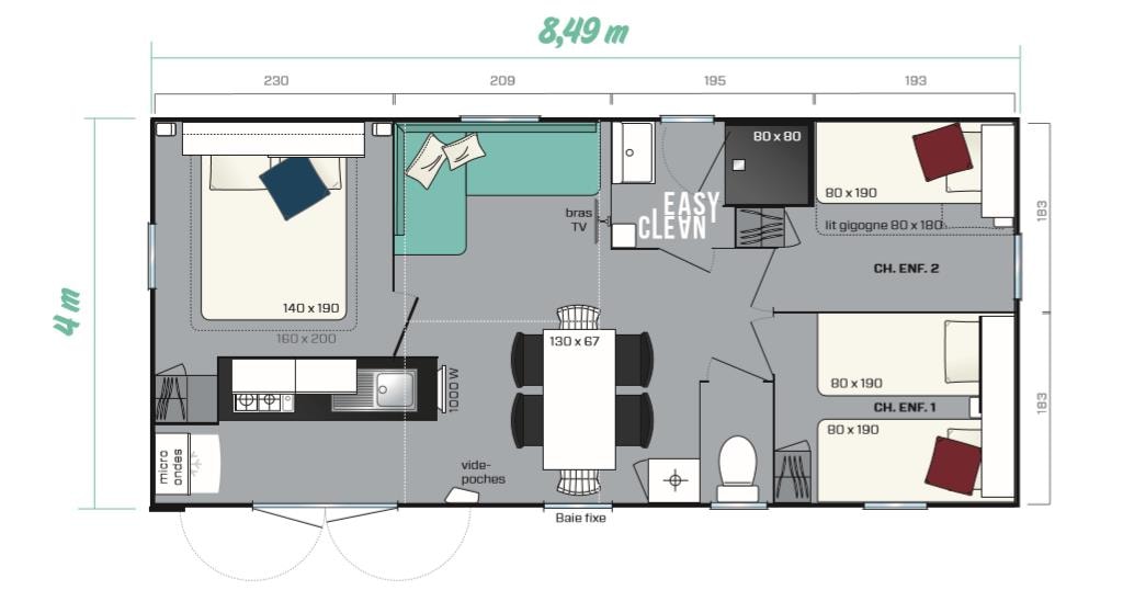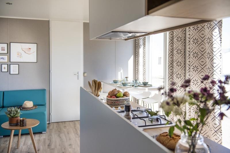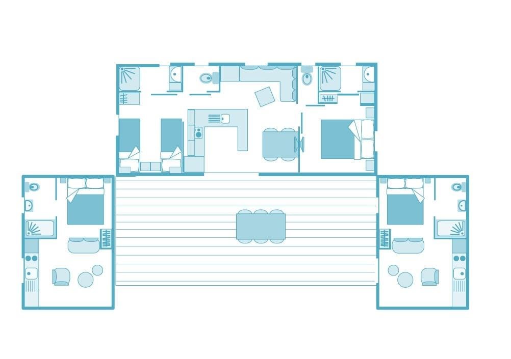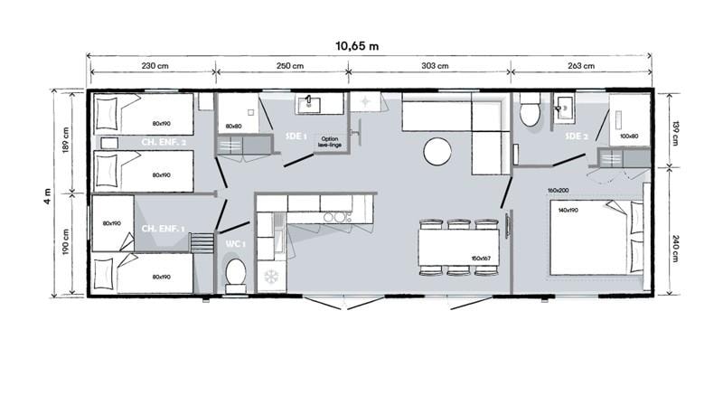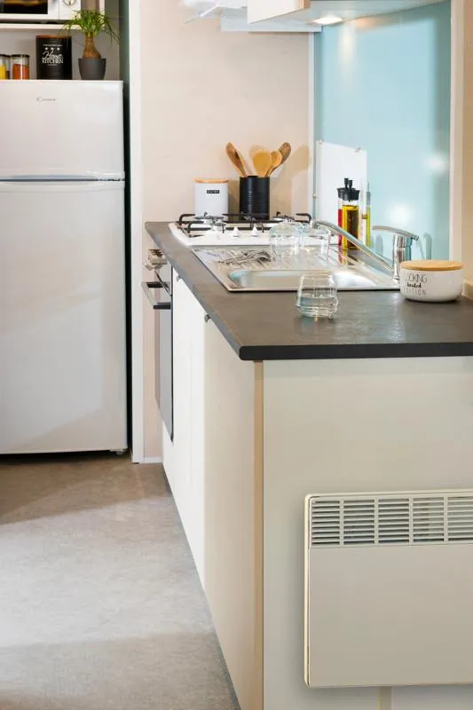 * Fläche: ab 32m² * Schlafzimmer 1: 140 x 190 Bett, Kleiderschrank, Safe. * Schlafzimmer 2: 2 Betten 80 x 190, Kleiderschrank. * Schlafzimmer 3: 2 Betten 80 x 190, Kleiderschrank. * Wohnzimmer: Bank, Tisch und Stühle, Heizung. * Küche: Kochfeld, Geschirr, Küchenutensilien, Spüle, Dunstabzugshaube, Kühl- / Gefrierschrank, Mikrowelle und elektrische Kaffeemaschine. * Duschraum: Dusche und Waschbecken. * Separates WC. * Bettdecken und Kissen werden gestellt. * Gartenmöbel, Sonnenliegen/Liegestühle und Wäscheleine. * Halbüberdachte Terrasse 12m².
