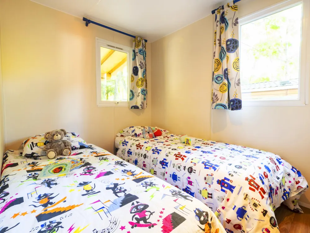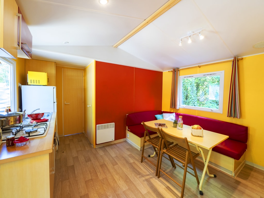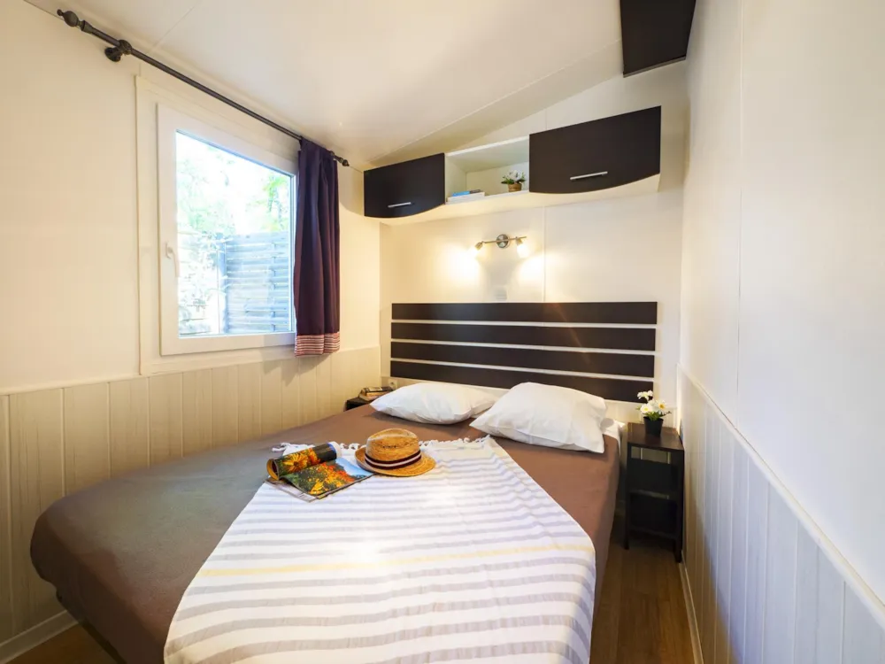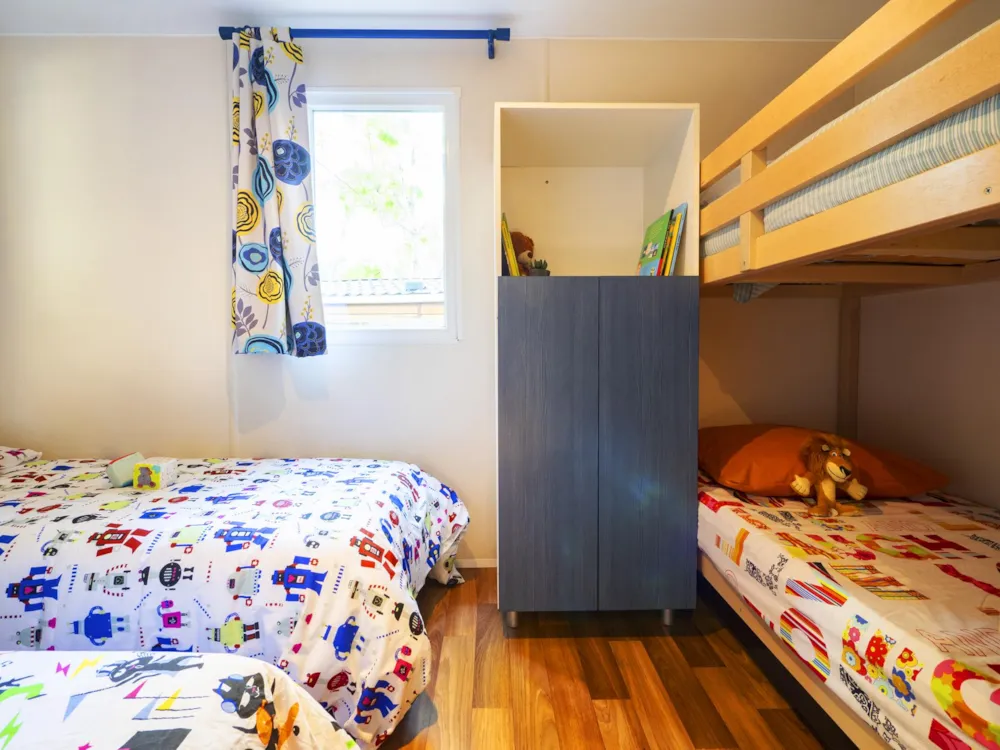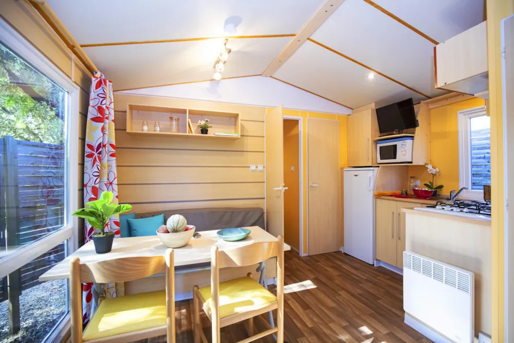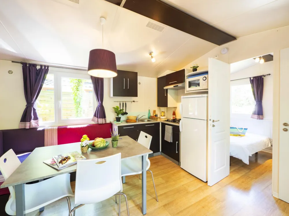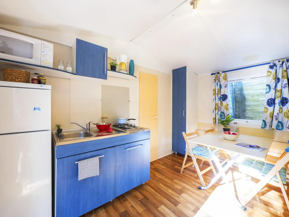 * Fläche: ab 32m² * Schlafzimmer 1: 140 x 190 Bett, Kleiderschrank, Safe. * Schlafzimmer 2: 2 Betten 80 x 190, Kleiderschrank. * Schlafzimmer 3: 2 Betten 80 x 190, Kleiderschrank. * Wohnzimmer: Bank, Tisch und Stühle, Heizung. * Küche: Kochfeld, Geschirr, Küchenutensilien, Spüle, Dunstabzugshaube, Kühl- / Gefrierschrank, Mikrowelle und elektrische Kaffeemaschine. * Duschraum: Dusche und Waschbecken. * Separates WC. * Bettdecken und Kissen werden gestellt. * Gartenmöbel, Sonnenliegen/Liegestühle und Wäscheleine. * Halbüberdachte Terrasse 12m².