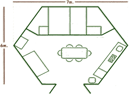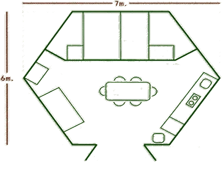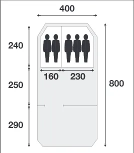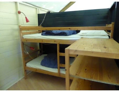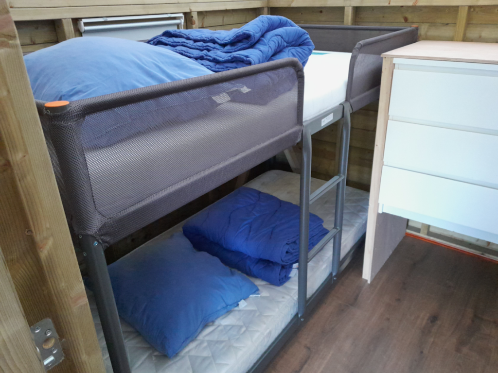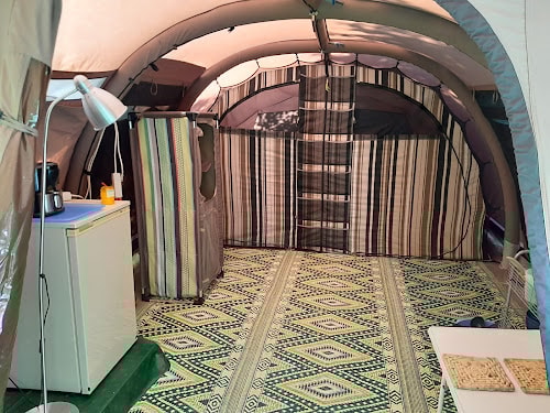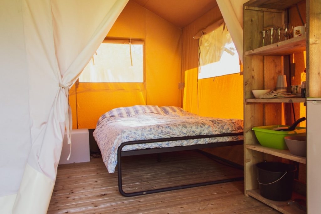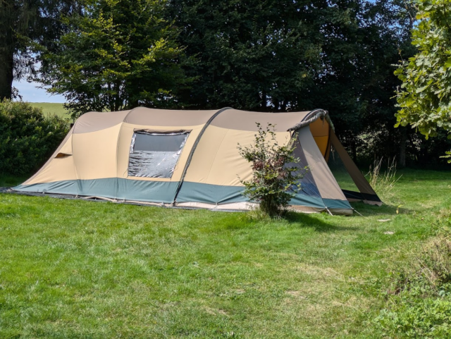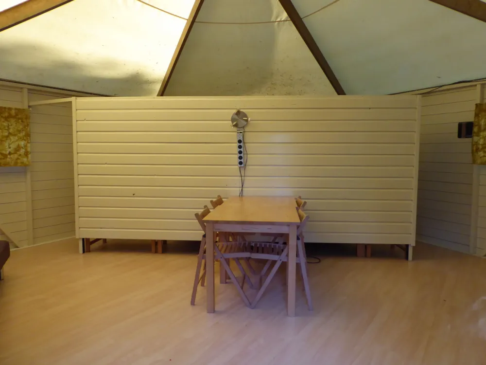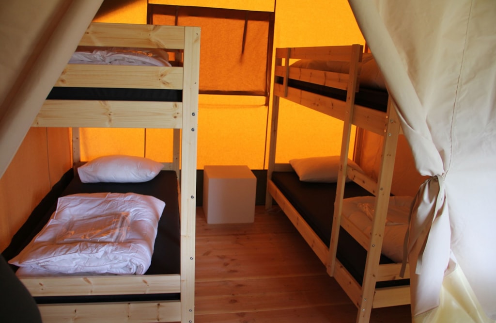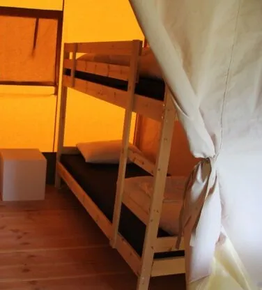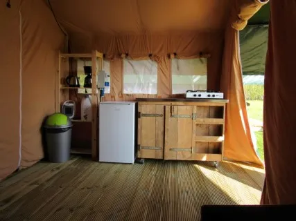 Es hat eine Innenfläche von 25m2 und eine große überdachte Terrasse. Es gibt Sitzgelegenheiten drinnen und draußen. Das Zelt hat 2 Schlafräume. Ein Zimmer mit einem Doppelbett und im anderen Zimmer gibt es 2 Etagenbetten. Das Zelt hat einen mobilen Küchenblock. Es gibt keinen Wasseranschluss und keine sanitären Einrichtungen im Zelt, aber es gibt einen Toiletten-/Wasserhahn in 25 m Entfernung.