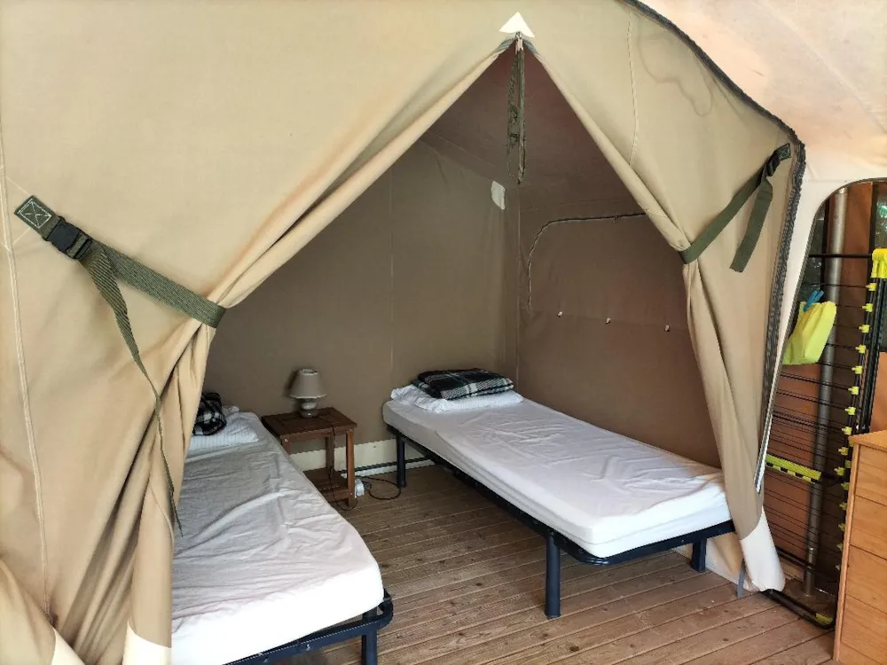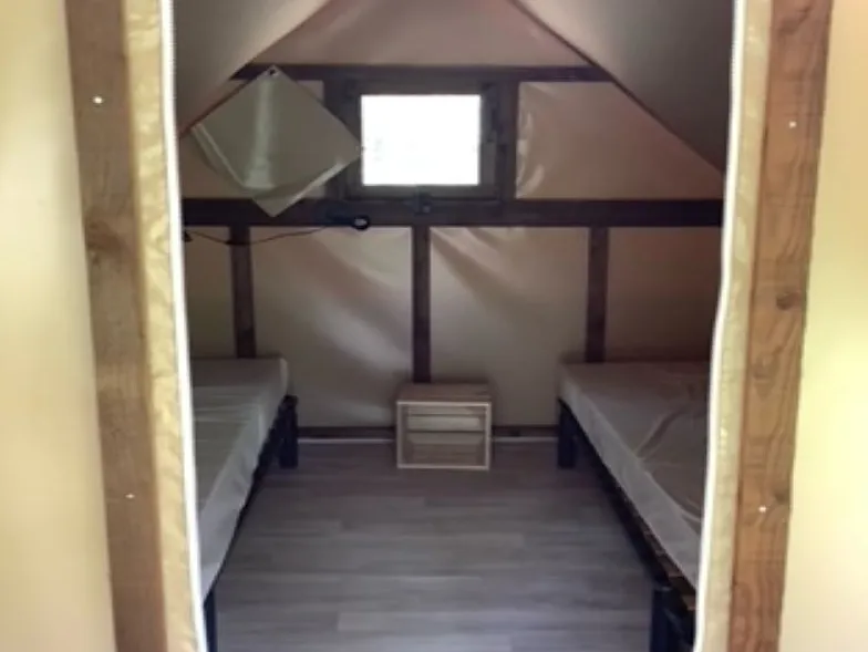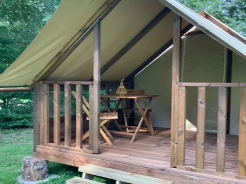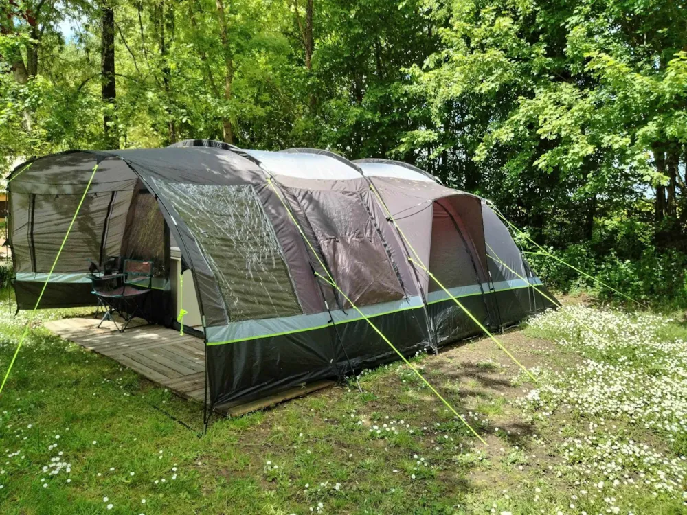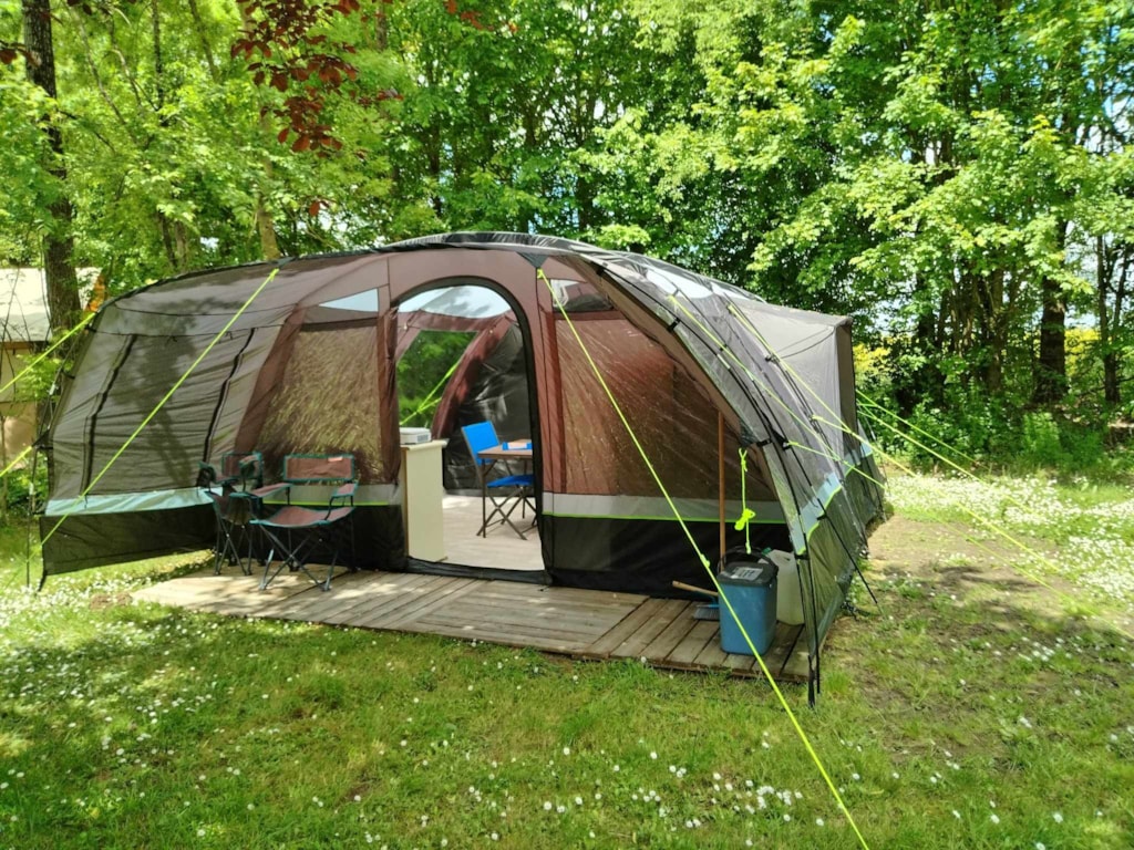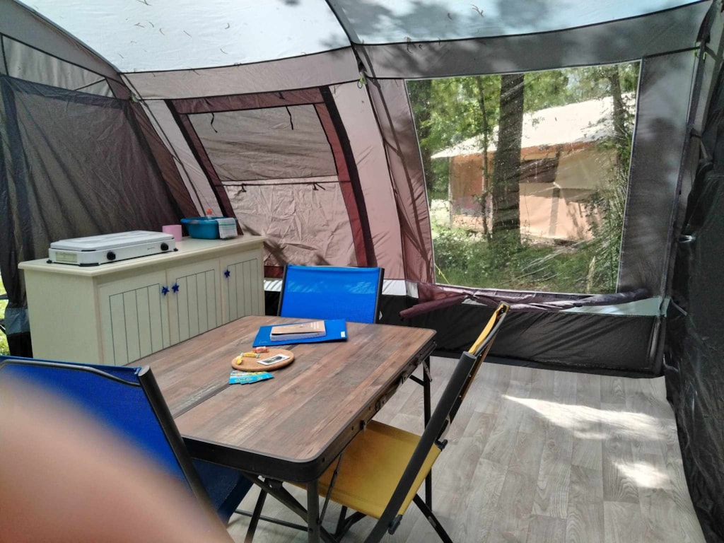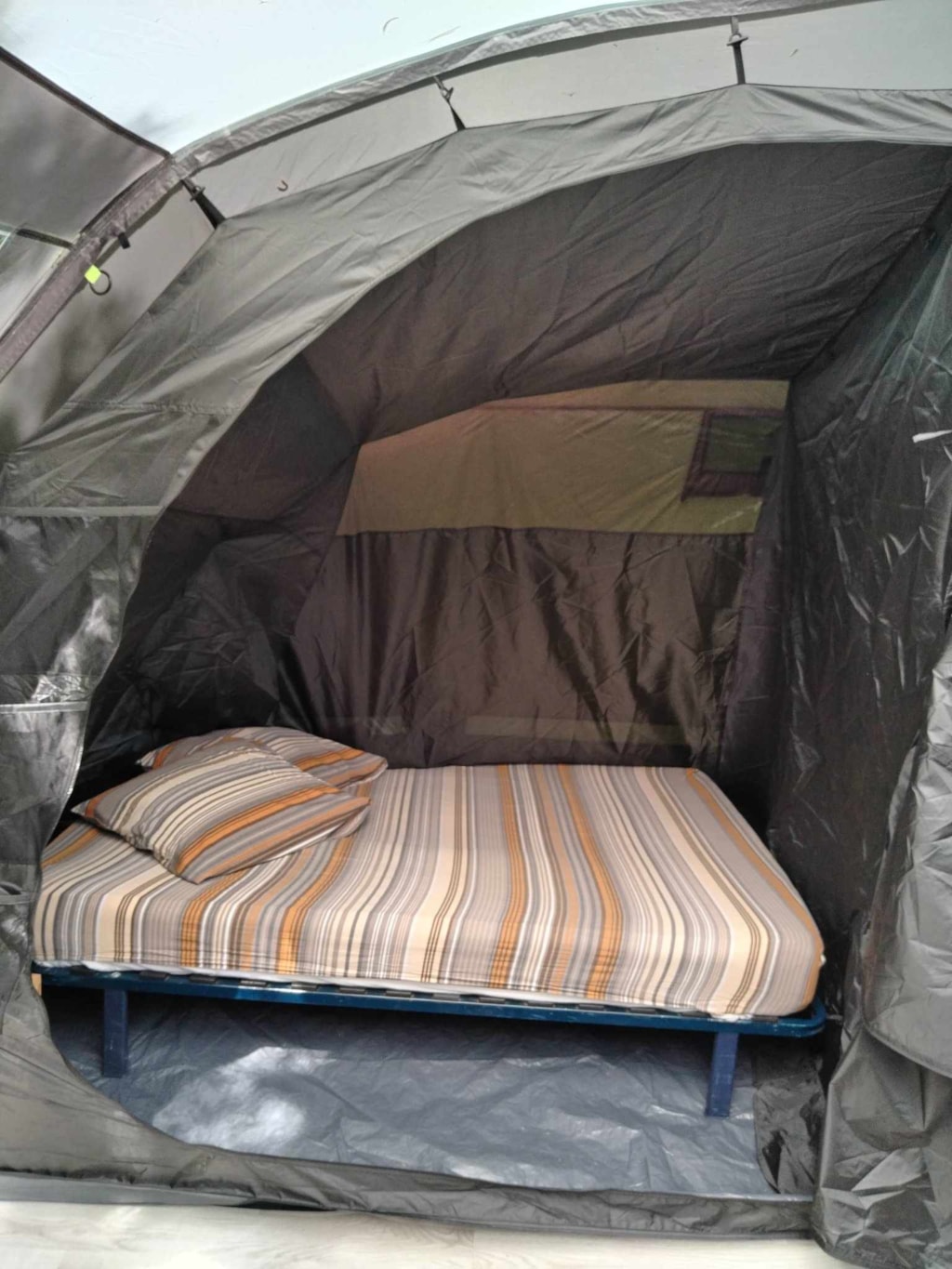 Cyclo-tente 2 personnes, avec 2 lits sur sommier, avancée couverte équipée d'une table et deux chaises