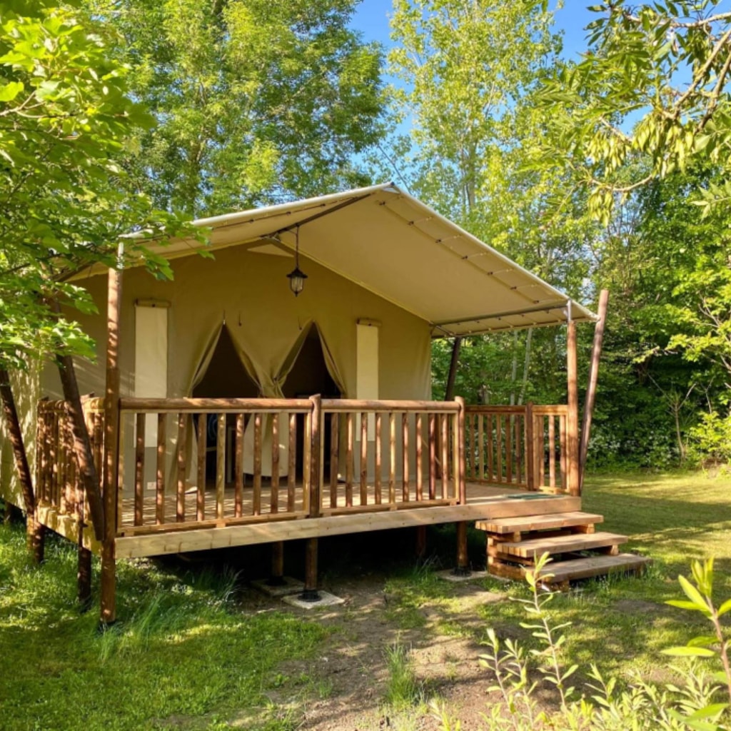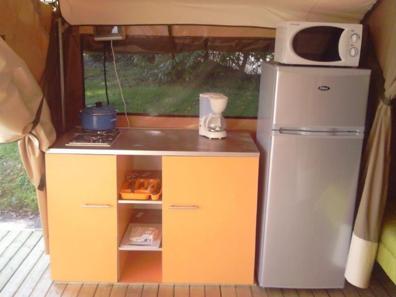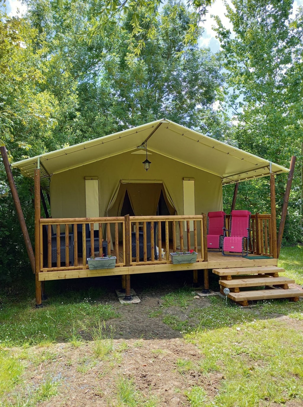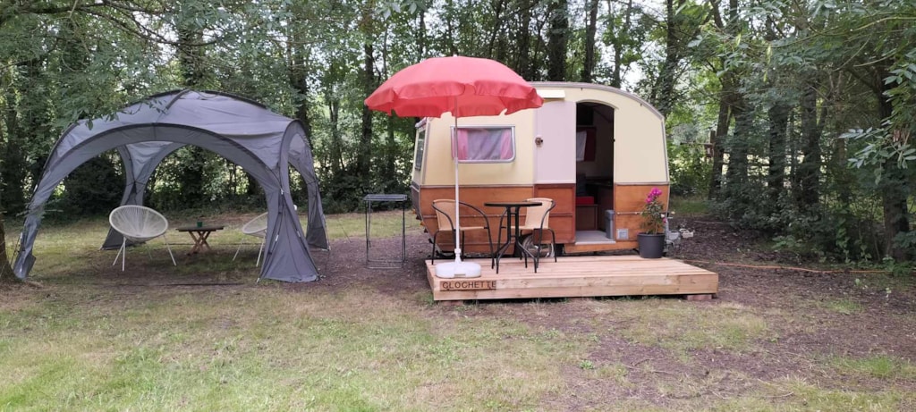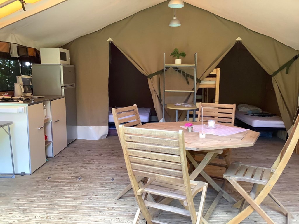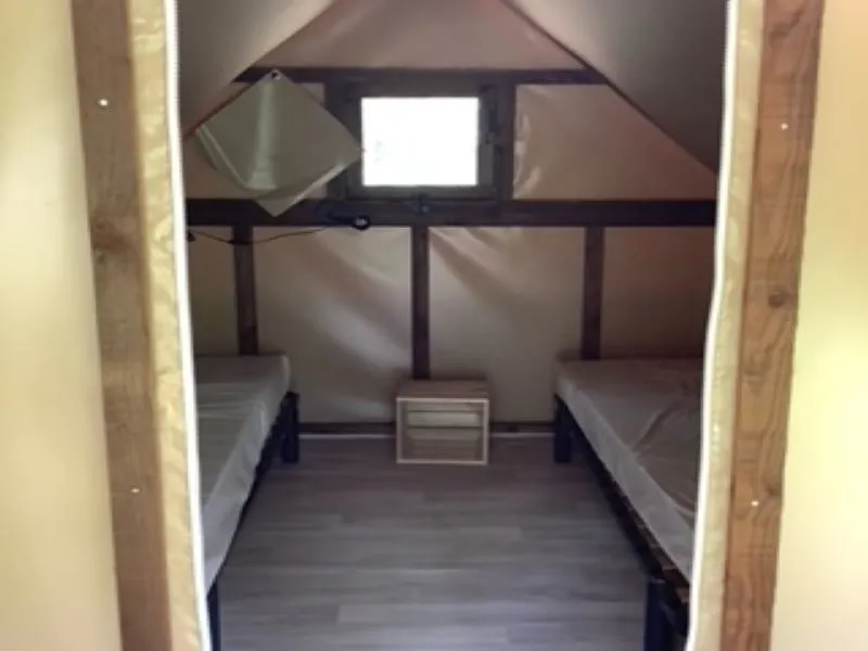 Cyclo-tente 2 personnes, avec 2 lits sur sommier, avancée couverte équipée d'une table et deux chaises