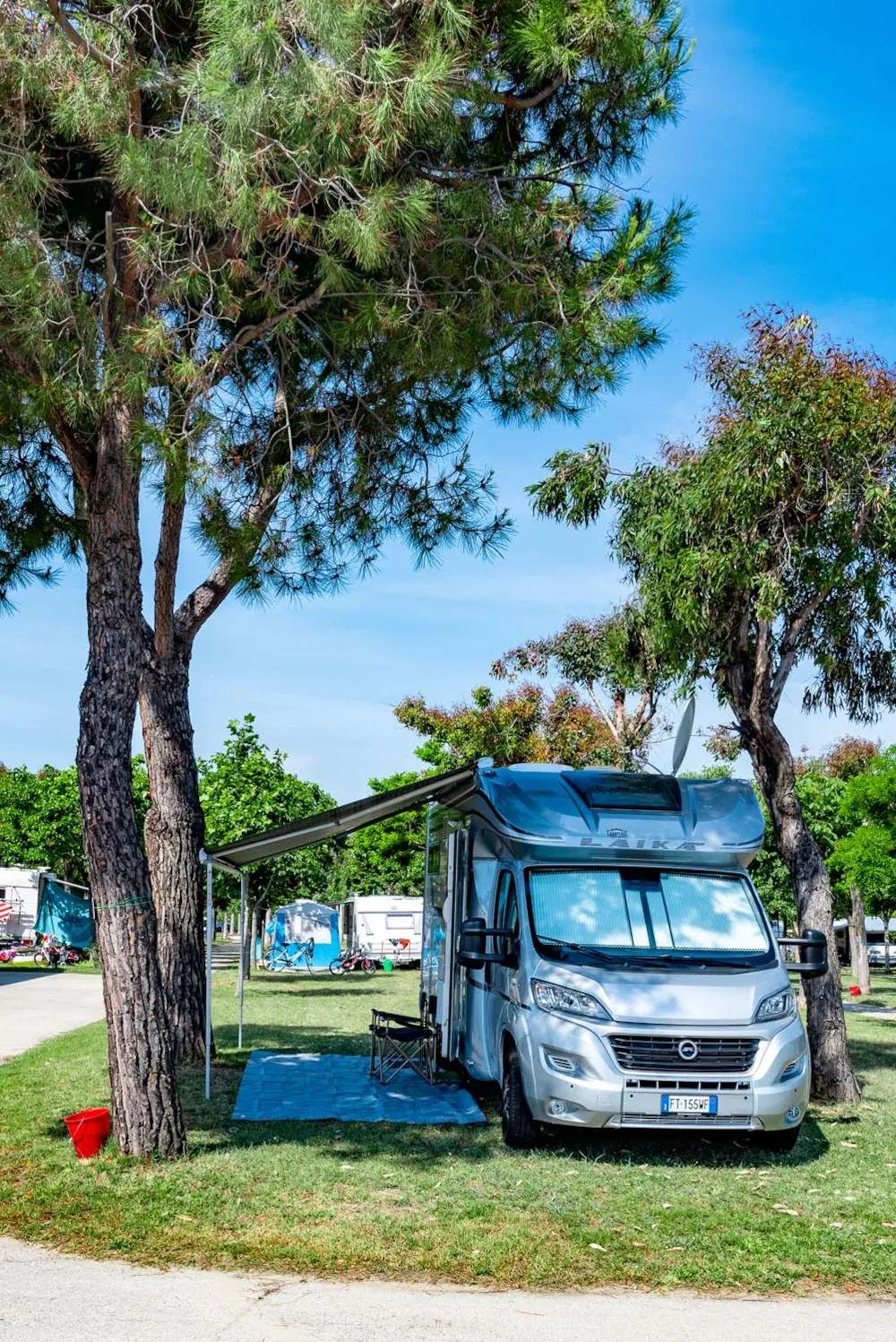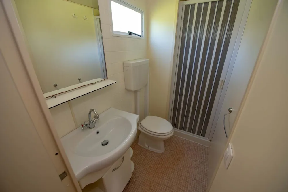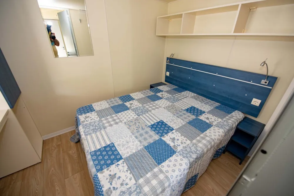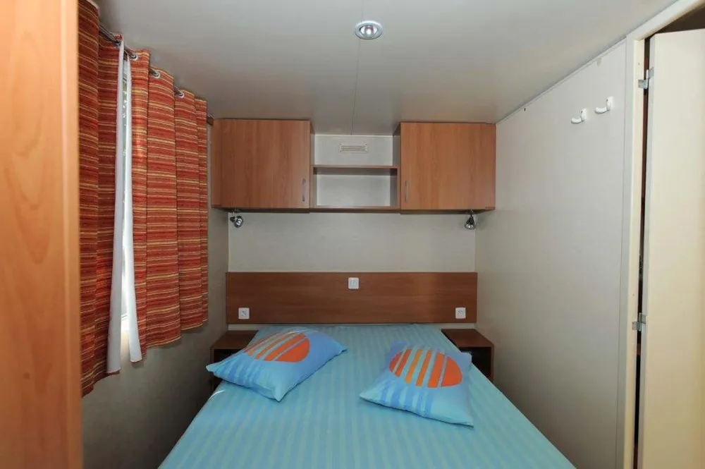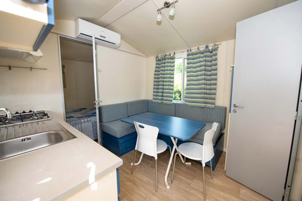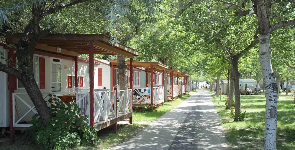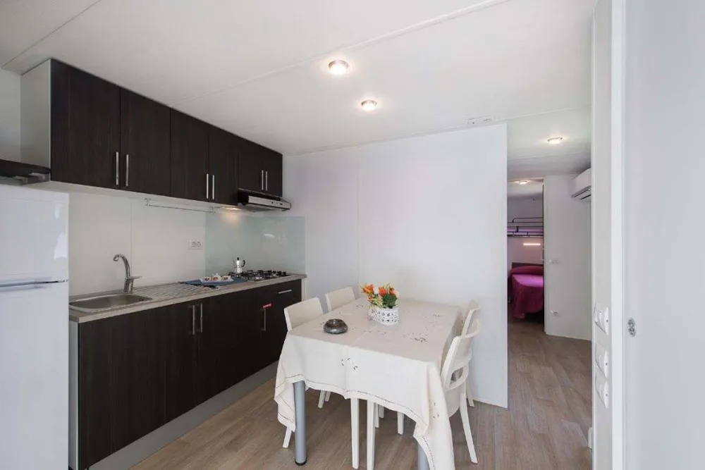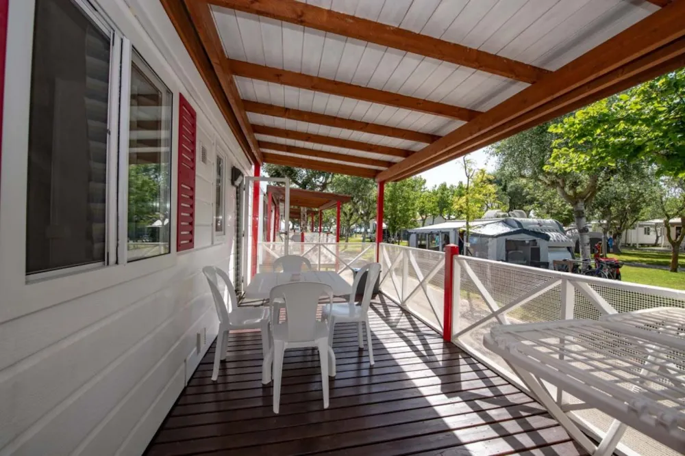 Die Mobihome New Relax ist wie folgt ausgestattet: Wohnzimmer mit Kochnische und Kühlschrank, Abstellraum; zwei Schlafzimmer, eines davon ist mit einem Doppelbett (1,90 x 1,40) und das andere mit drei Einzelbetten (1,90 x 0,70), eines davon ist ein Hochbett (Kapazität bis 40 Kg), ausgestattet mit Kissen und Decken (es besteht die Möglichkeit, das Campingbett im zweiten Schlafzimmer durch Entfernen eines Bettes hinzuzufügen); Badezimmer mit Waschbecken, WC, Duschkabine und Haartrockner; überdachte Außenveranda, leicht erhöht, mit Fliesenboden, ausgestattet mit Tisch, Stühlen und Wäschständer, Reinigungsset (Besen, Kehrschaufel, Mopp) und 3 Abfallbehälter . Das Haus ist mit zentralisierter TV-Antenne ausgestattet.