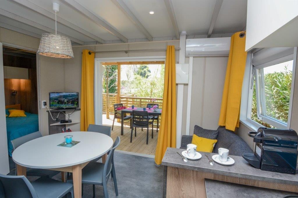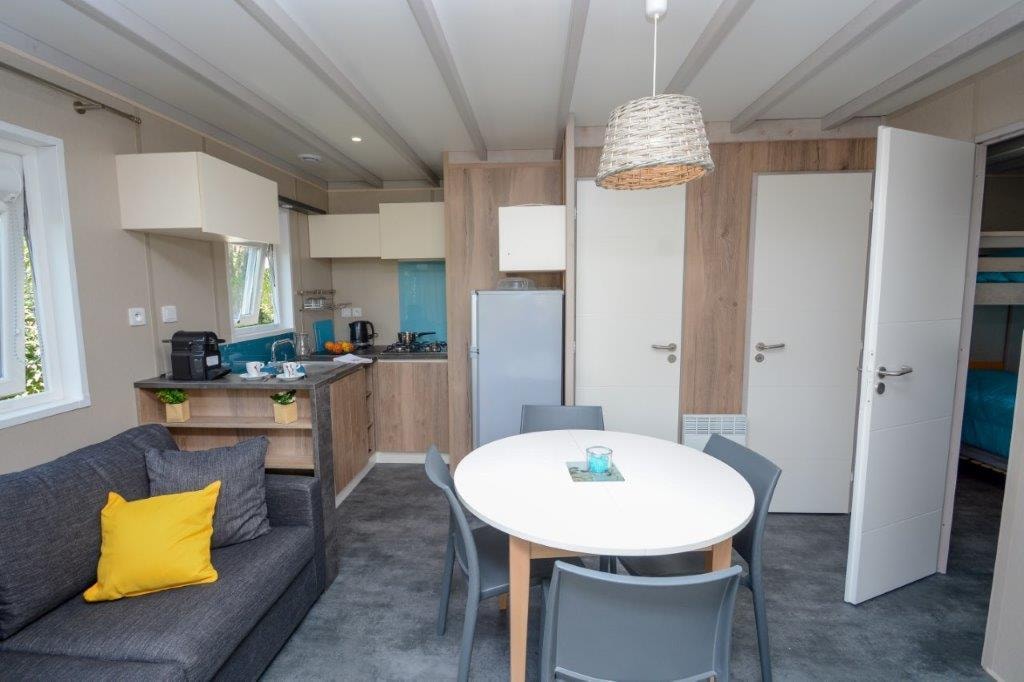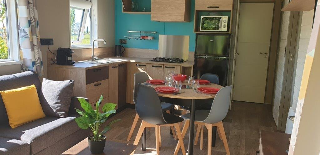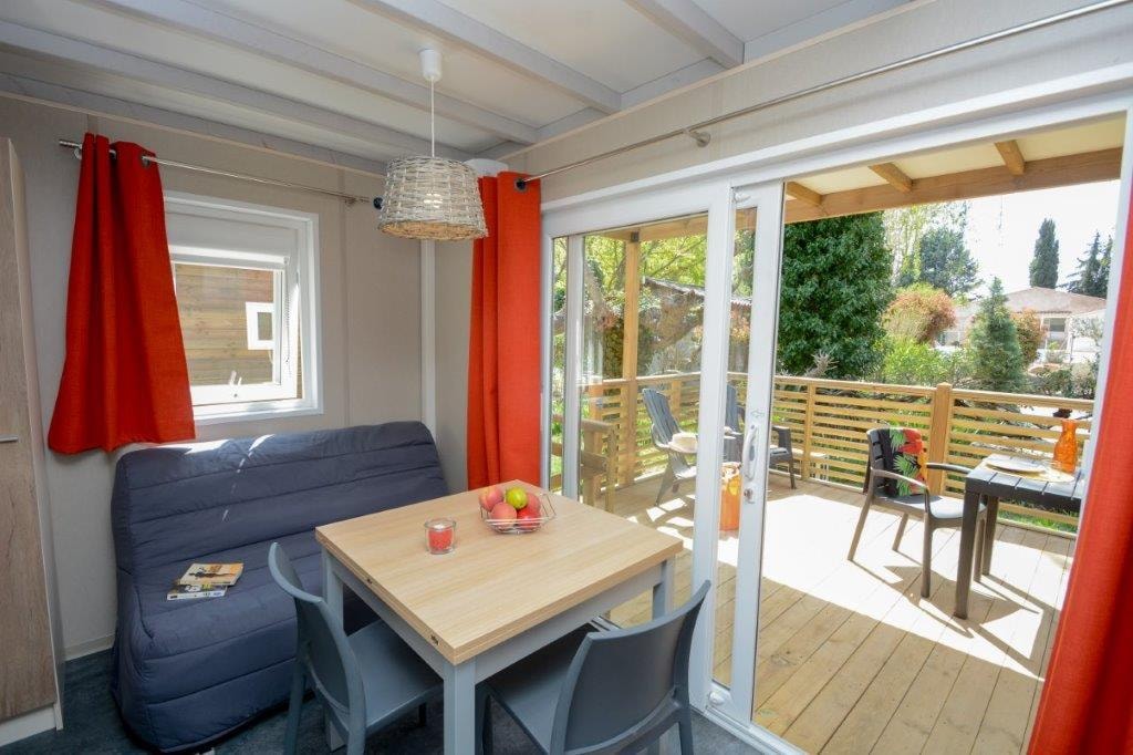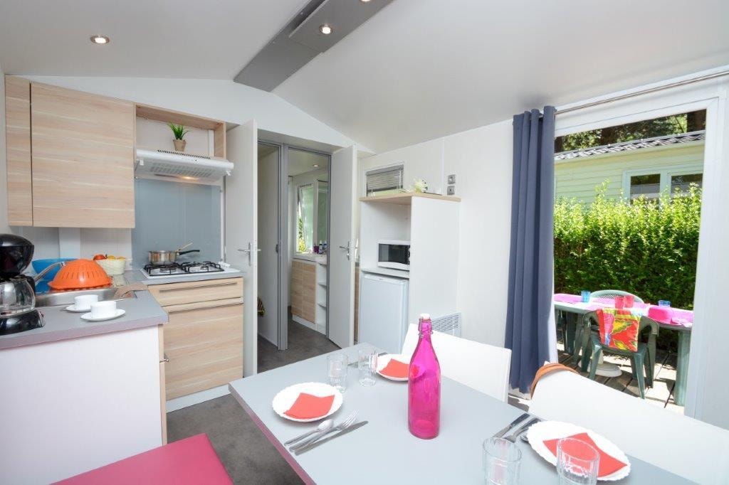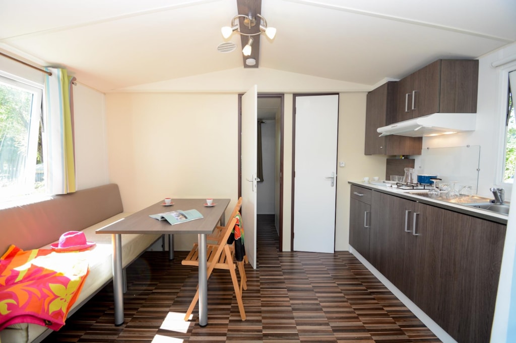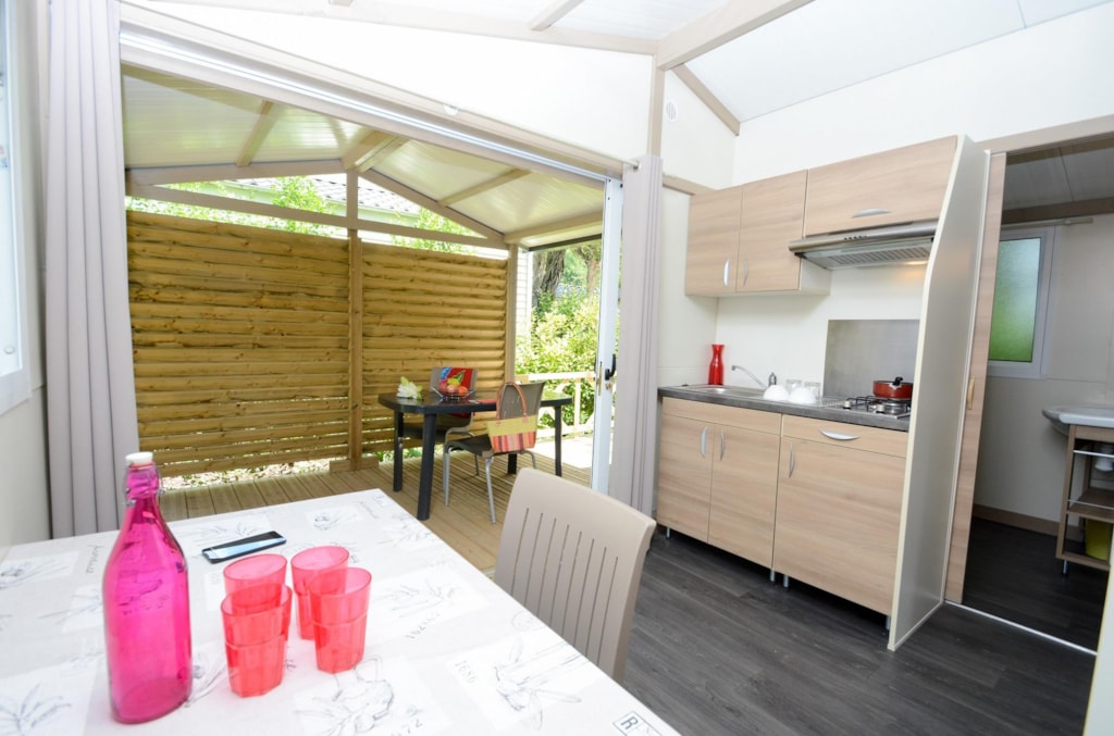 Prolongez votre intérieur en extérieur pour vos vacances dans le Sud avec ce mobil home : la cuisine s'ouvre sur la terrasse pour profiter pleinement de repas conviviaux.