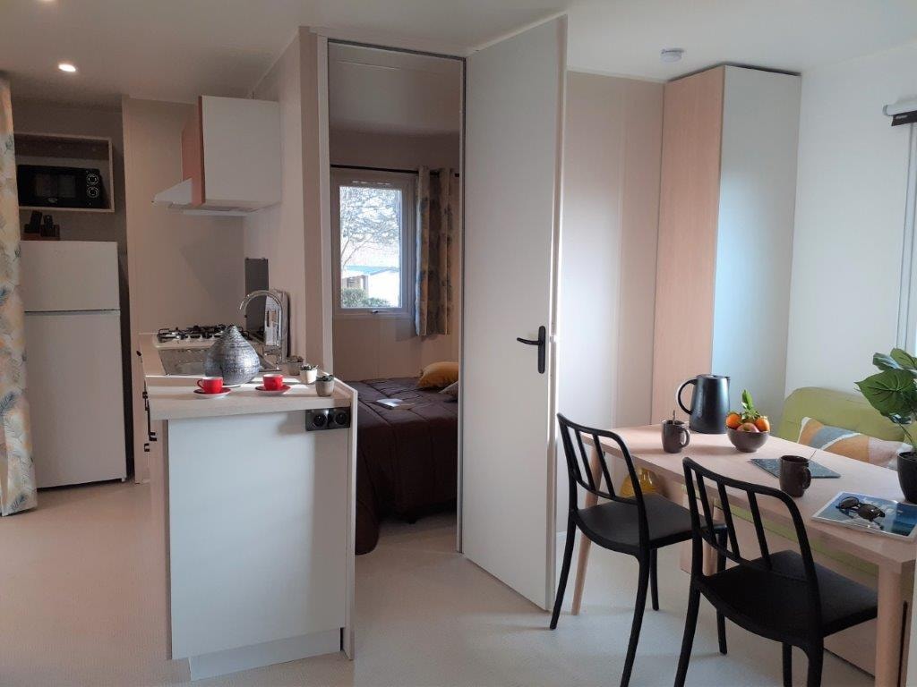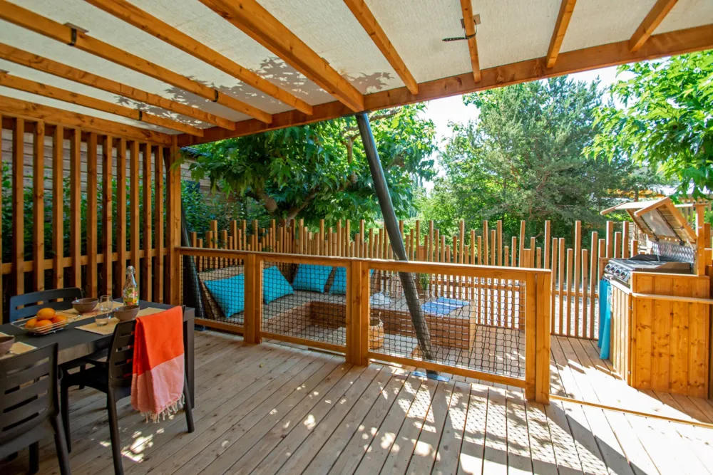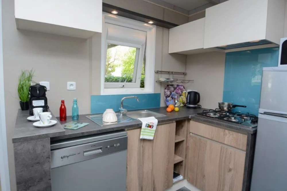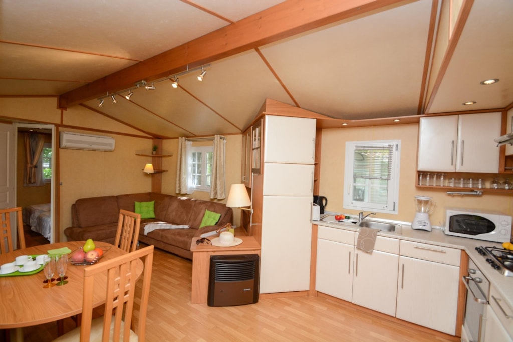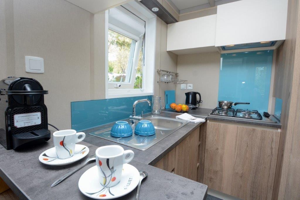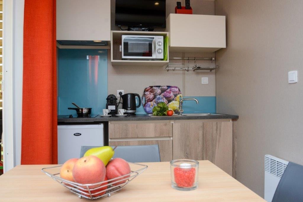 Prolongez votre intérieur en extérieur pour vos vacances dans le Sud avec ce mobil home : la cuisine s'ouvre sur la terrasse pour profiter pleinement de repas conviviaux.