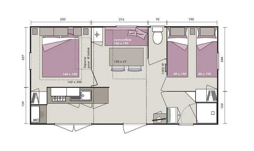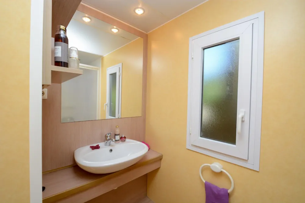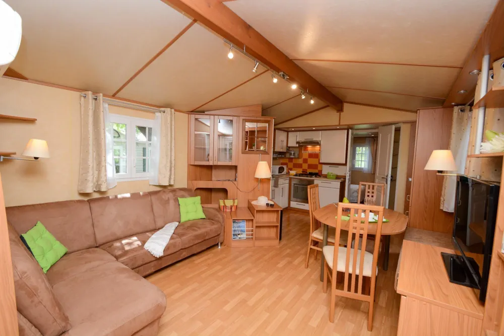 Pour vos vacances à 3 ou 4 ce mobil home est idéal. Il est agencé avec une cuisine ouverte sur le séjour, 2 chambres, une salle d'eau avec WC séparés et une terrasse en bois de 10m2.
