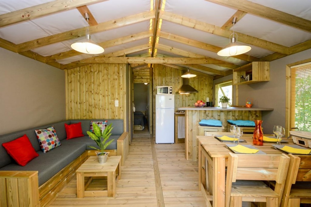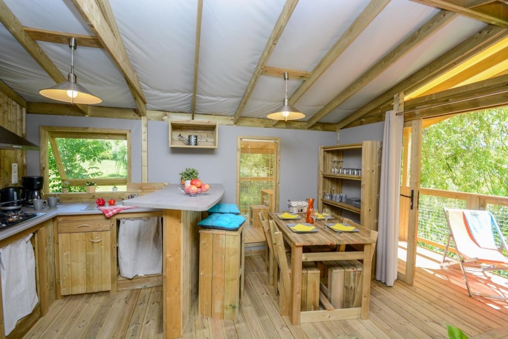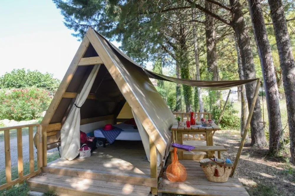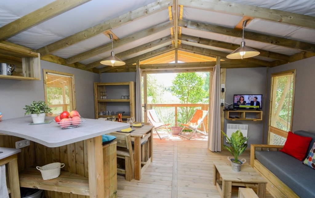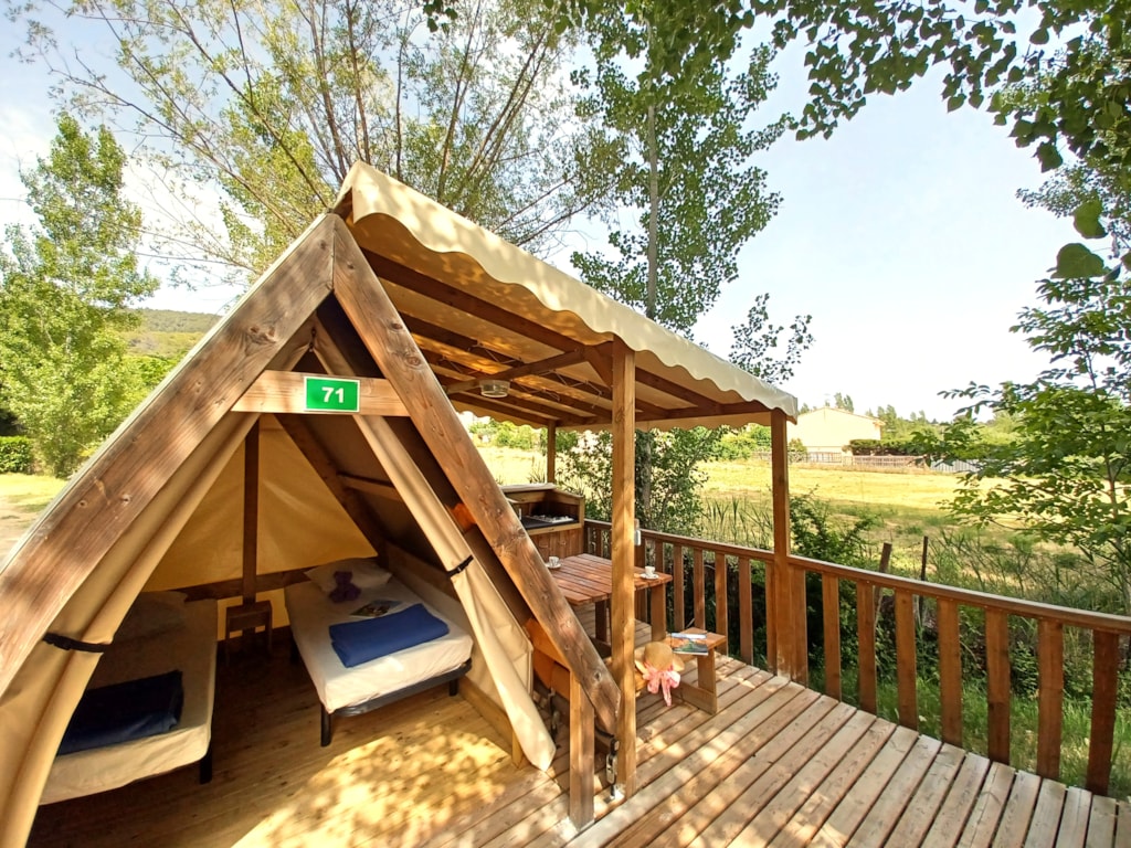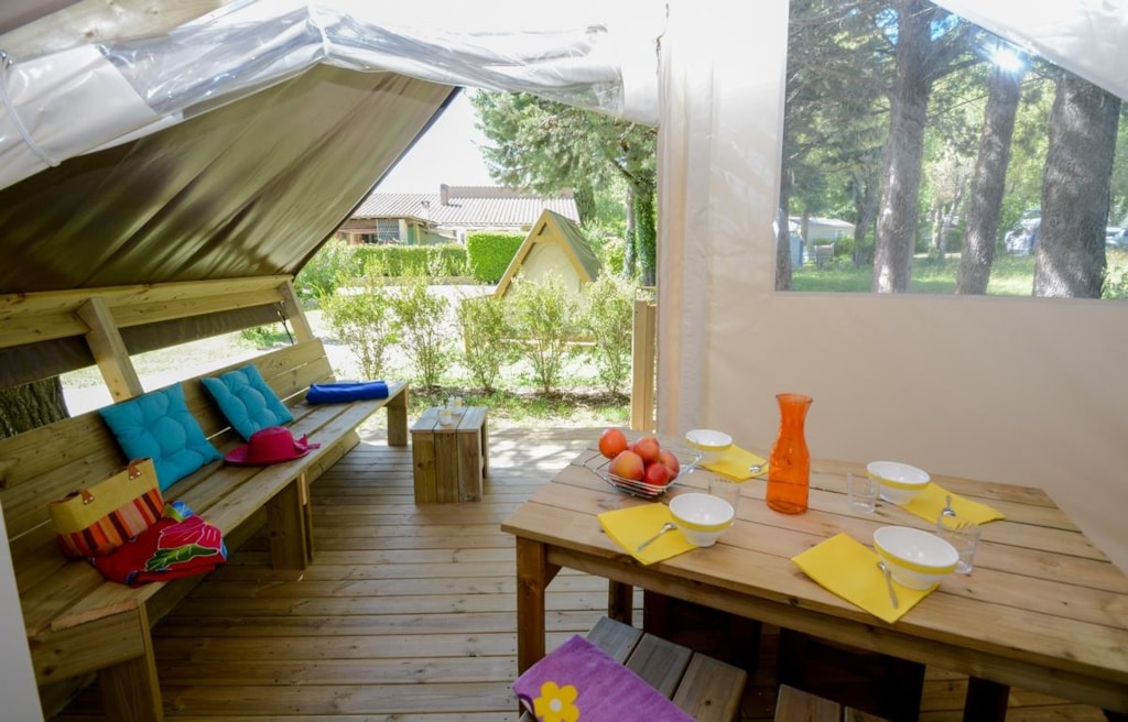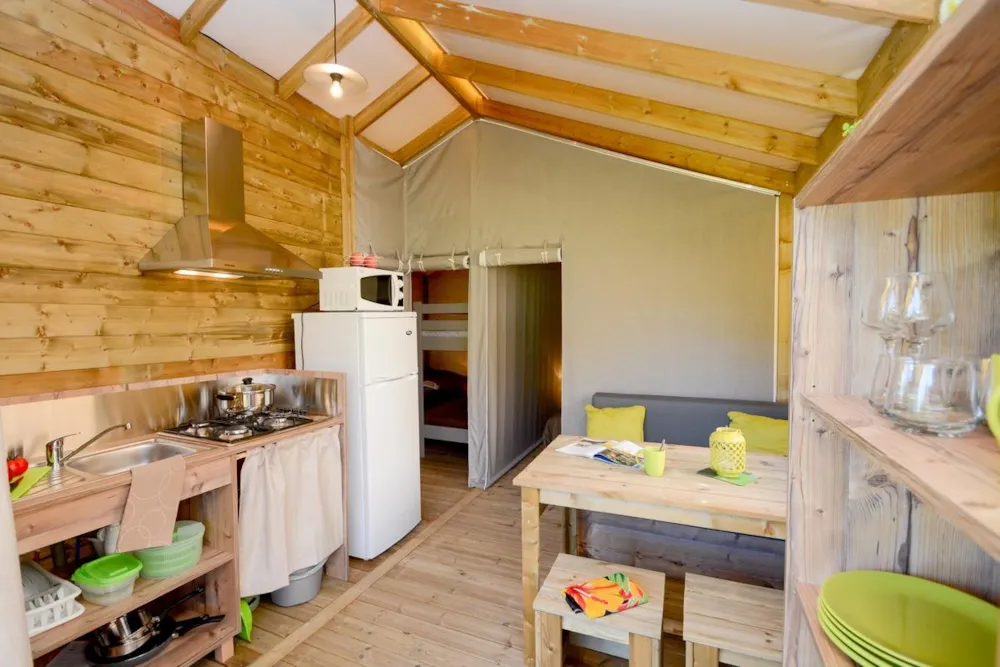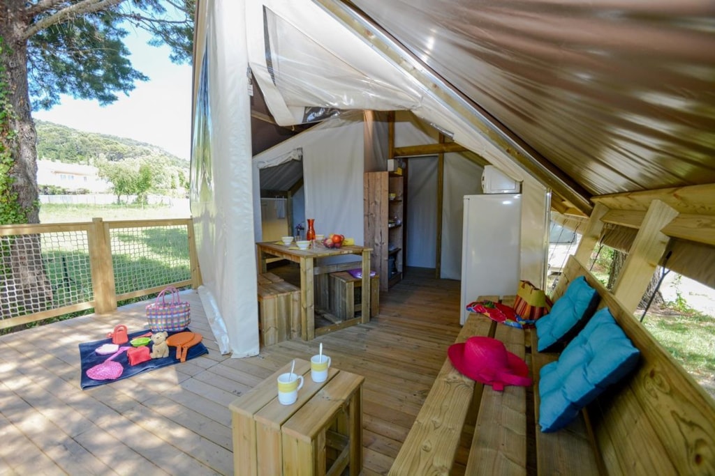 Tente avec un grand lit ou deux petits lits + table de nuit+ Electricité 6A incluse option 10A+ Terrasse en bois couverte avec table bois, deux bancs, meuble cuisine extérieur avec camping gaz + coffre rangement à clé - possibilité de louer un frigo