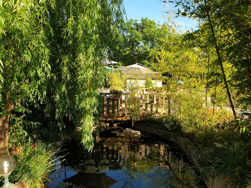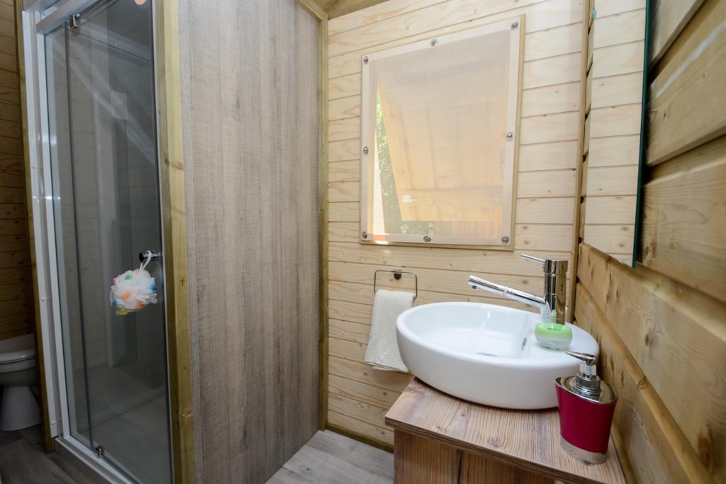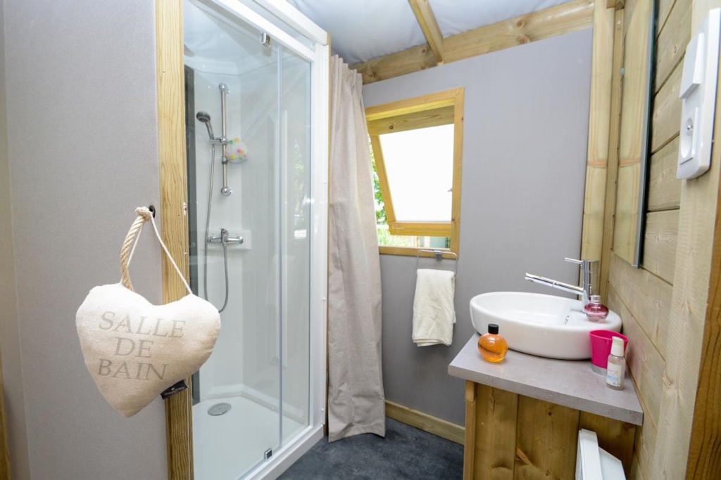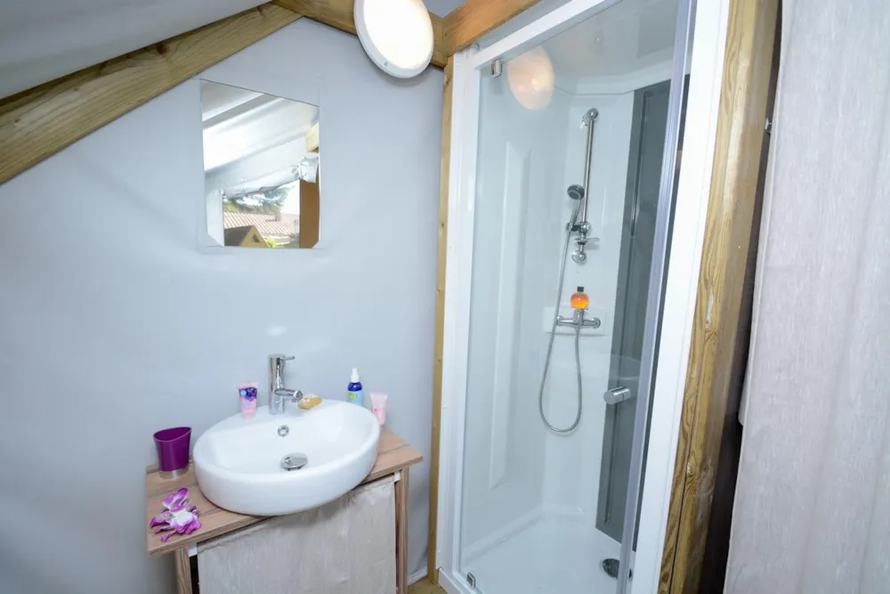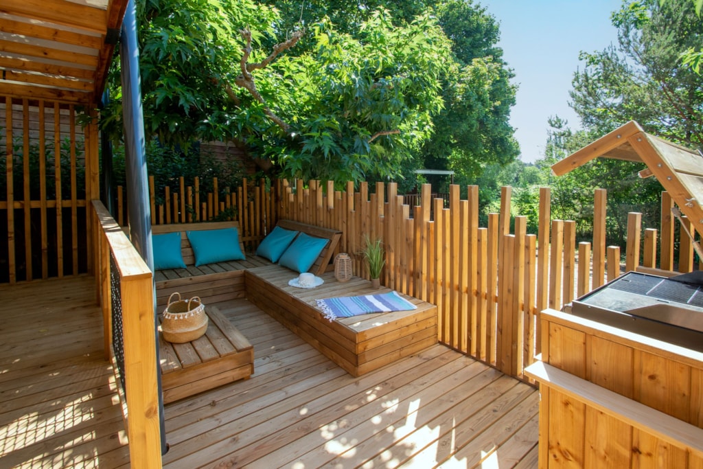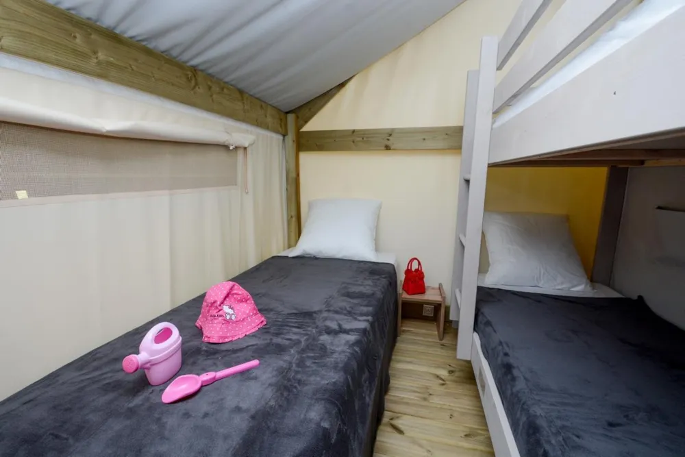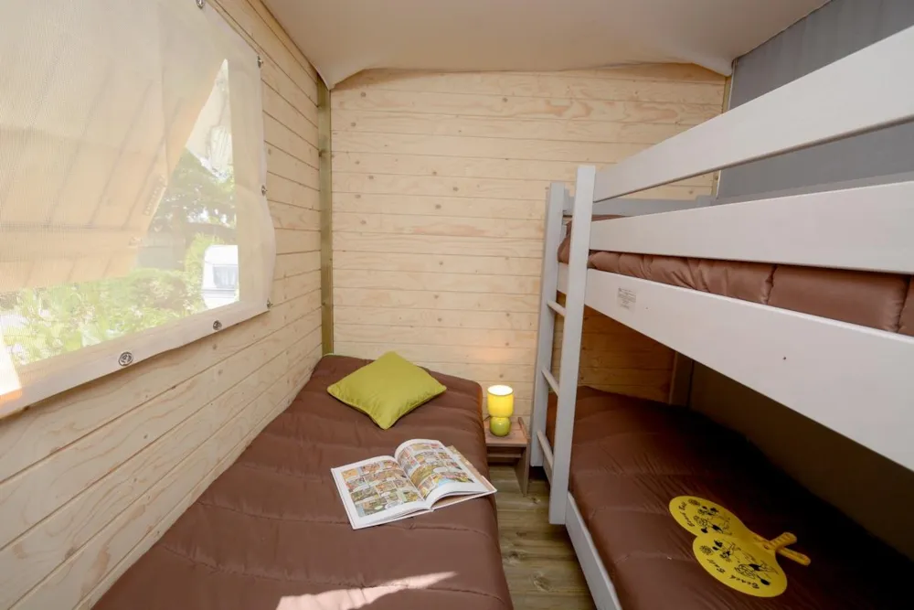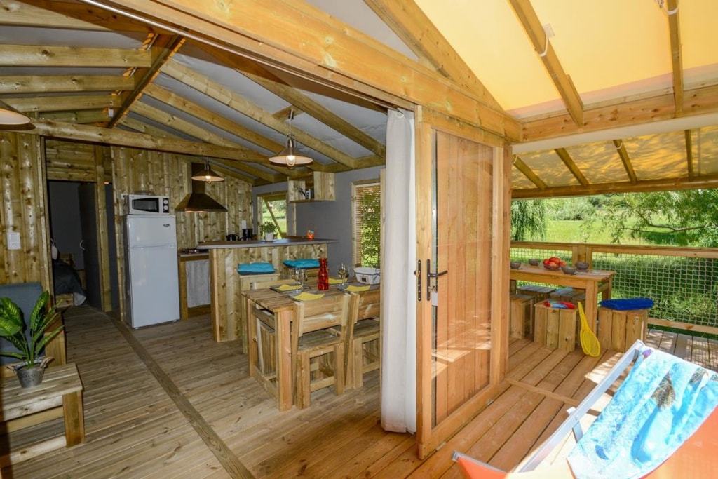 Tente avec un grand lit ou deux petits lits + table de nuit+ Electricité 6A incluse option 10A+ Terrasse en bois couverte avec table bois, deux bancs, meuble cuisine extérieur avec camping gaz + coffre rangement à clé - possibilité de louer un frigo