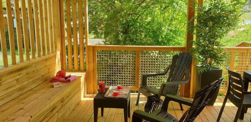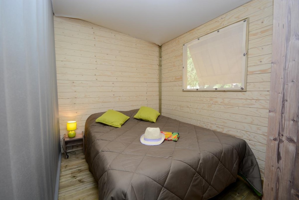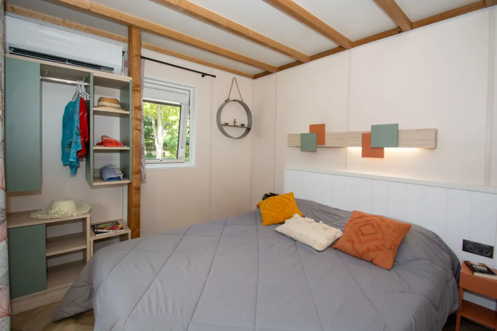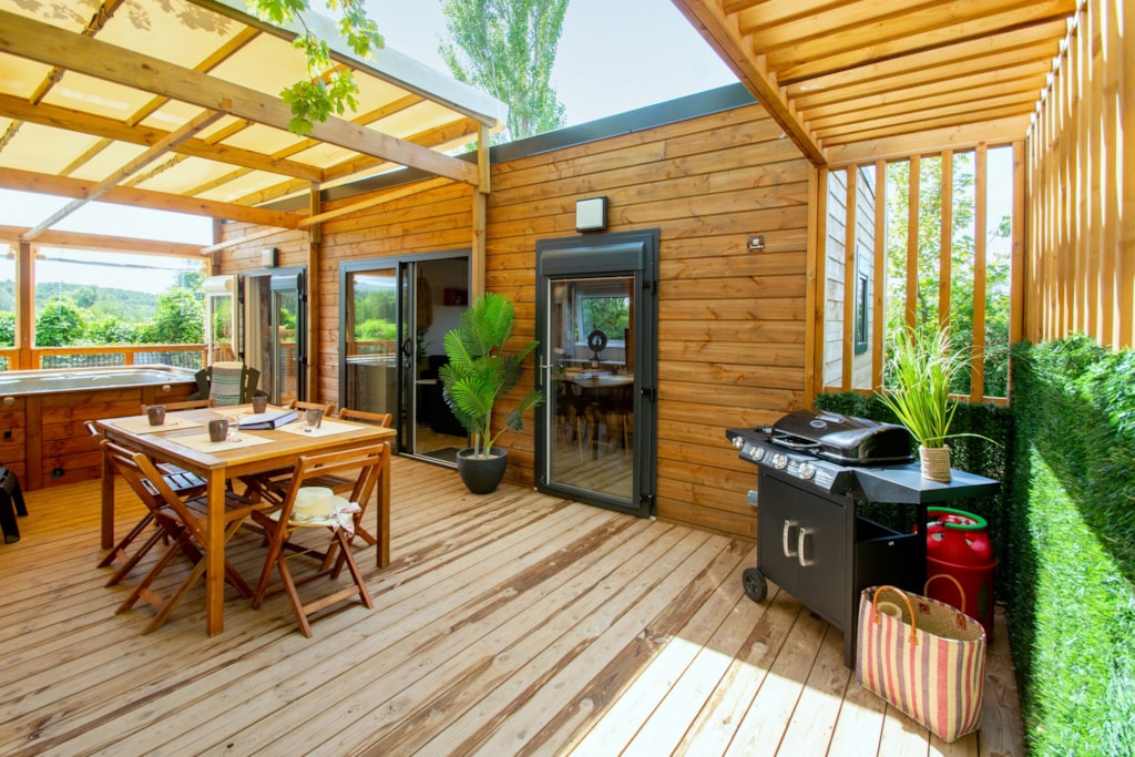 Ce chalet tout en bois est parfait pour accueillir un couple. Vous disposerez d'une chambre avec lit double, d'un séjour avec cuisine équipée et d'une grande terrasse couverte. Des équipements haut de gamme sont mis à votre disposition : TV écran plat, barbecue, fauteuils d'extérieur, climatisation, volets roulants, moustiquaires, cafetière Nespresso, sèche-serviette dans la salle de bain ...