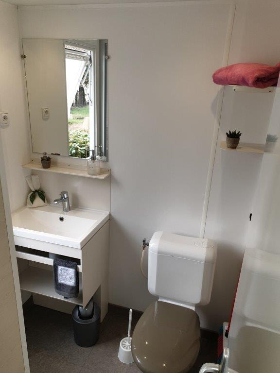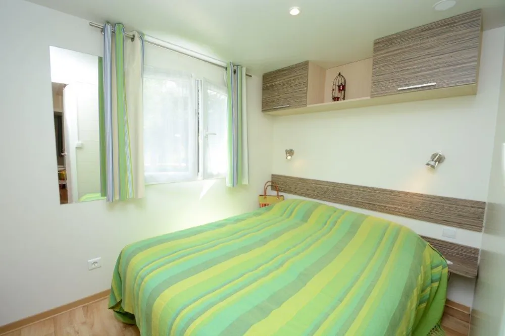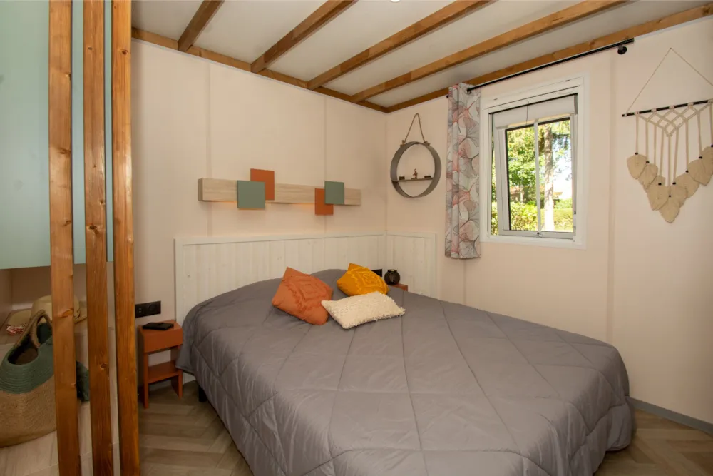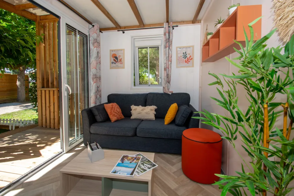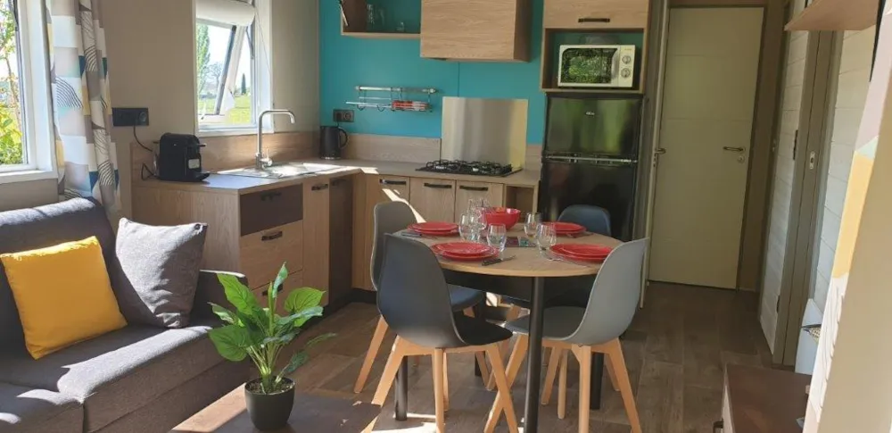 Ce petit mobil home peut loger 2 à 3 personnes. Vous trouverez un lit double dans une chambre et une banquette convertible dans le séjour. Disposez d'une pièce de vie ouverte sur une terrasse couverte de 12m2.