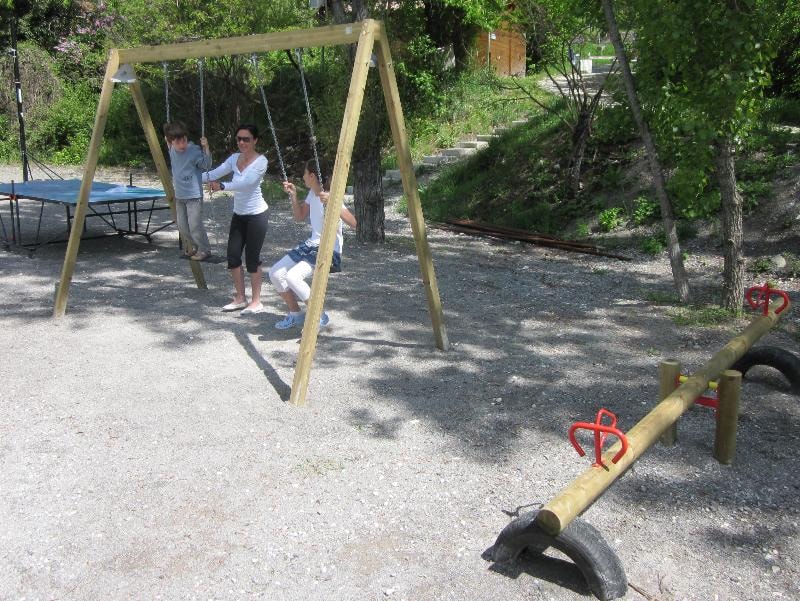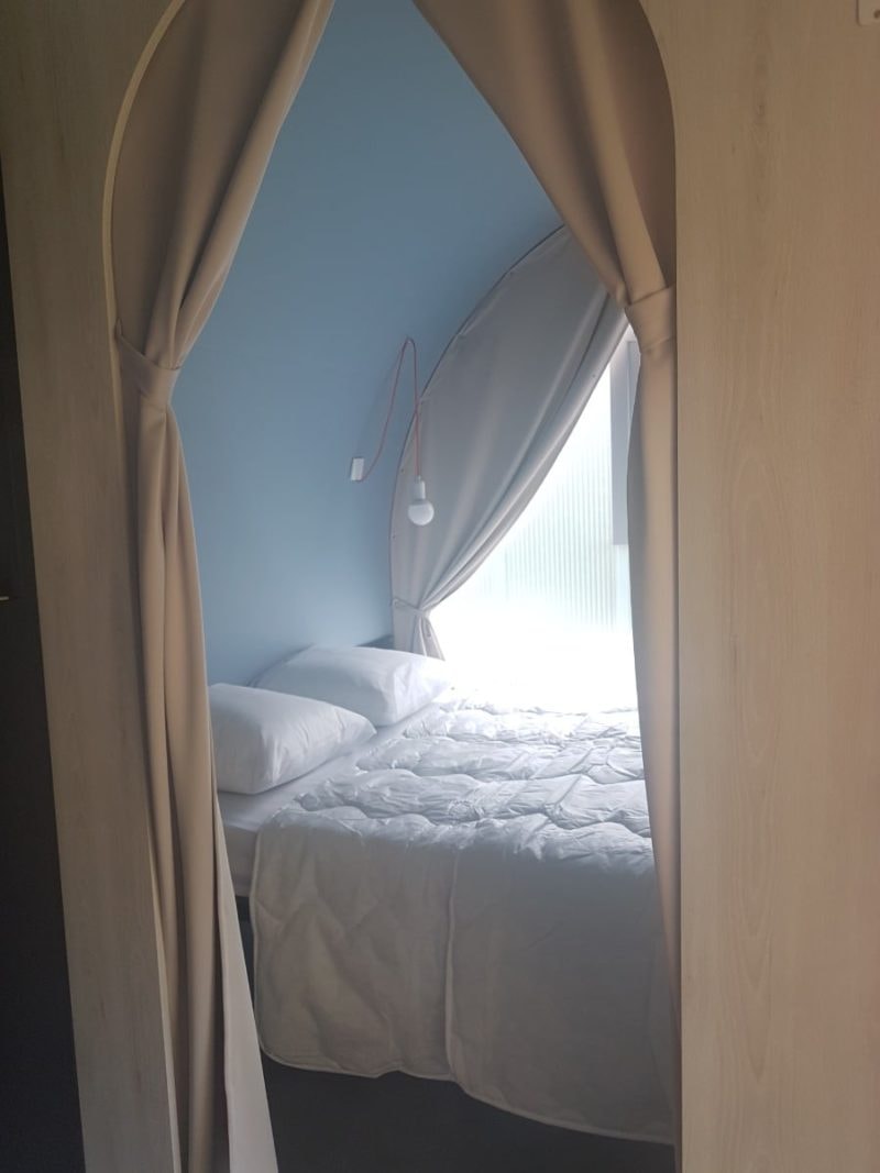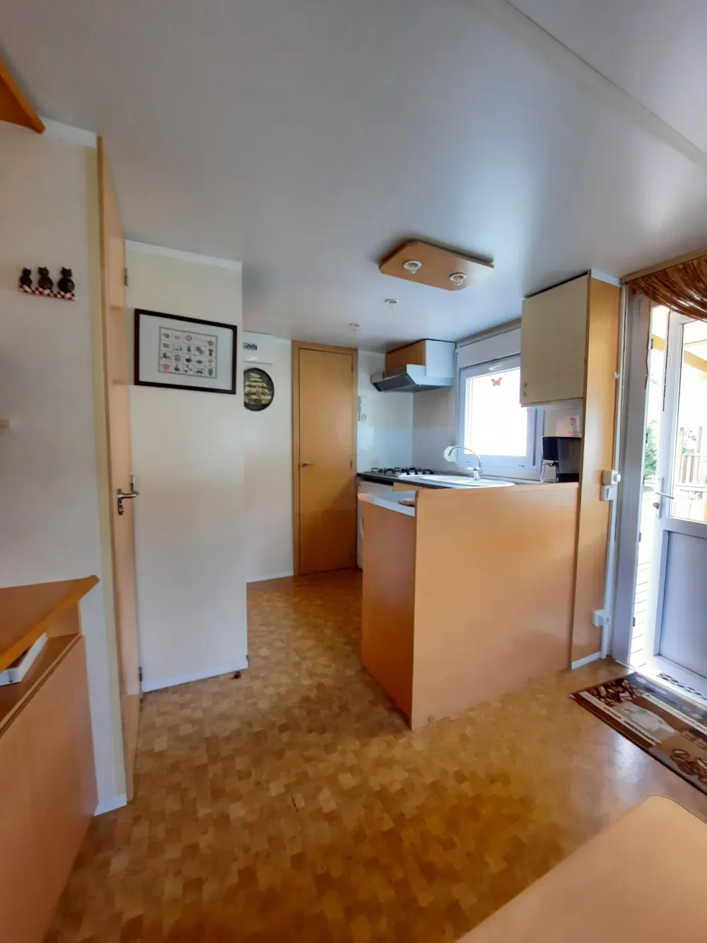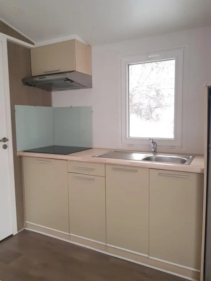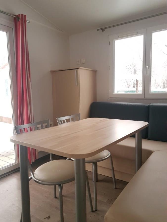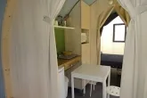 Chalet 24m² . Schlafzimmer mit 2 Etagenbetten. Elternbett im Hauptraum, der durch einen Vorhang abgetrennt ist, Küchenecke mit zweiflammigem Gasherd, Mikrowelle, Kühlschrank, elektrischer Kaffeemaschine, Geschirr und Besteck, Essecke, TV - Bettdecken und Kopfkissen werden gestellt. Bringen Sie Ihre eigene Bettwäsche, Handtücher und Haushaltswäsche mit. Laken können vor Ort gemietet werden. Überdachte Terrasse mit Gartentisch und Stühlen.
