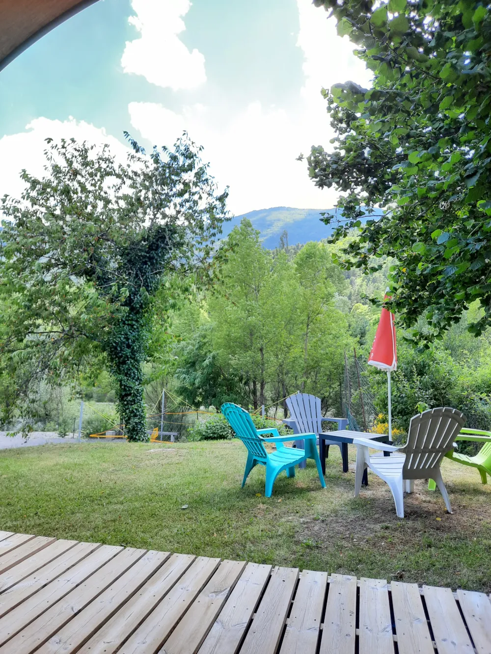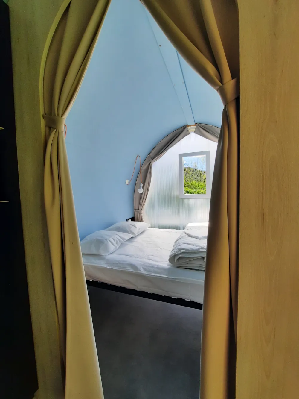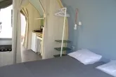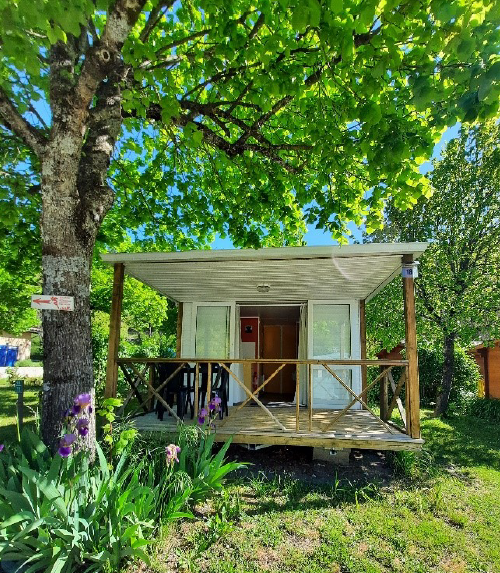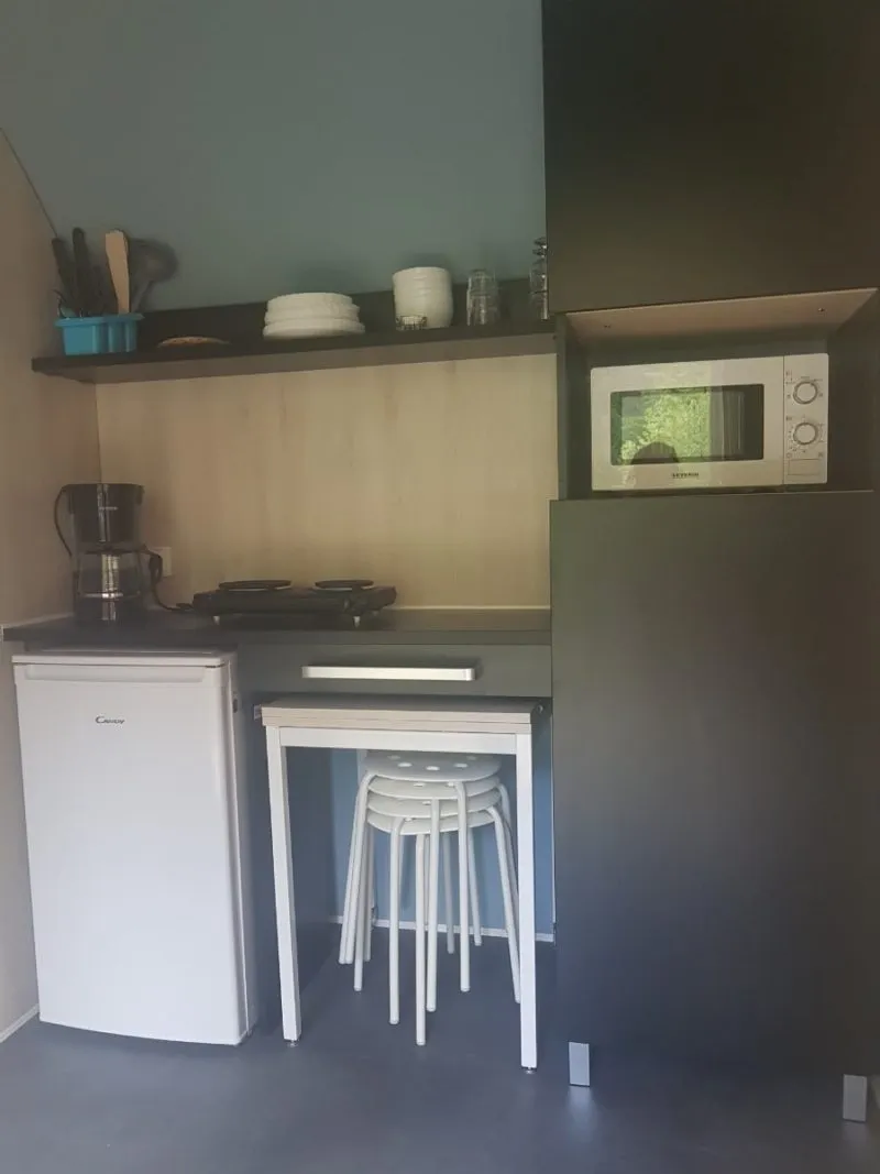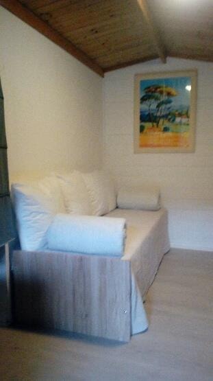Die 16m2 Chalets haben kein Wasser und keine sanitären Anlagen. 1 Ausziehbett für 2 Personen und 1 Schlafzimmer mit 2 Etagenbetten, ausgestattet mit Kochnische, Mikrowelle, Kühlschrank, Kaffeemaschine, Geschirr, Essecke, Fernseher. Bettdecken und Kopfkissen sind vorhanden. Bringen Sie Ihre eigene Bettwäsche, Handtücher und Haushaltswäsche mit. Laken können vor Ort gemietet werden. Überdachte Terrasse mit Gartentisch und Stühlen.
