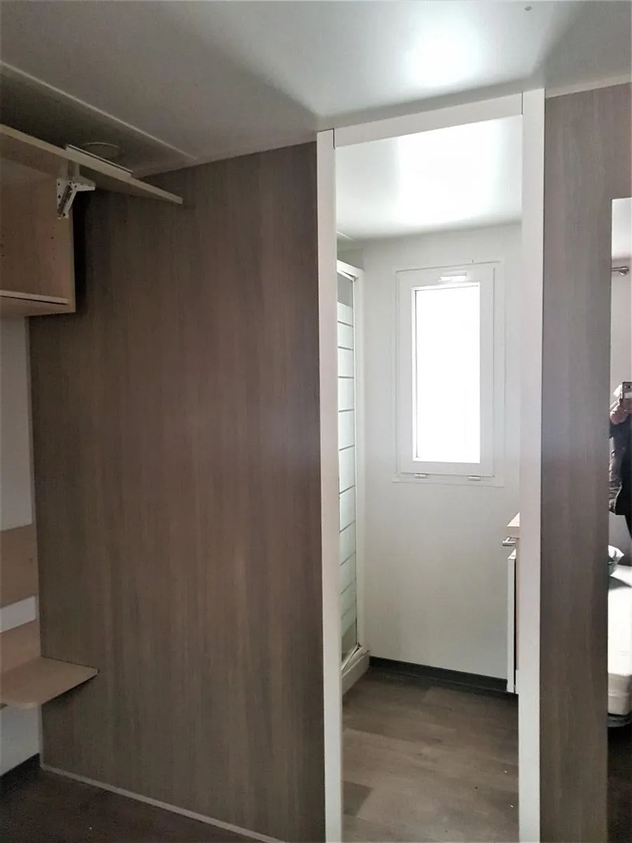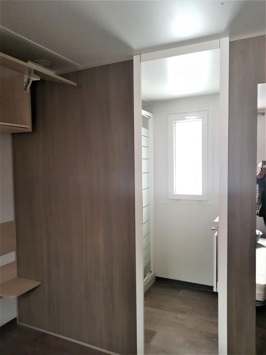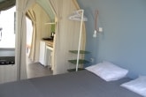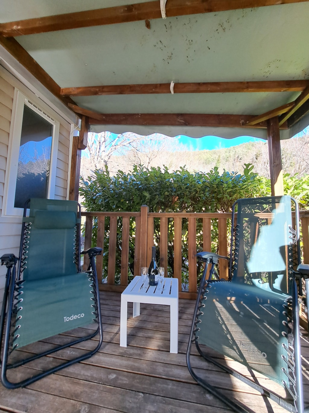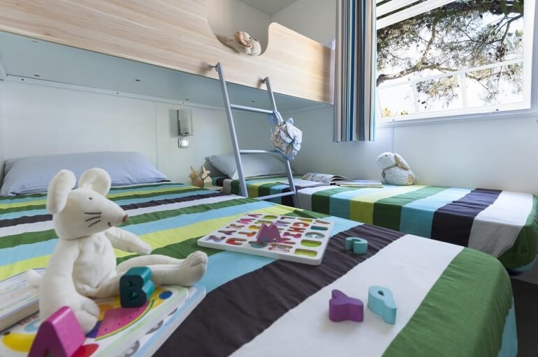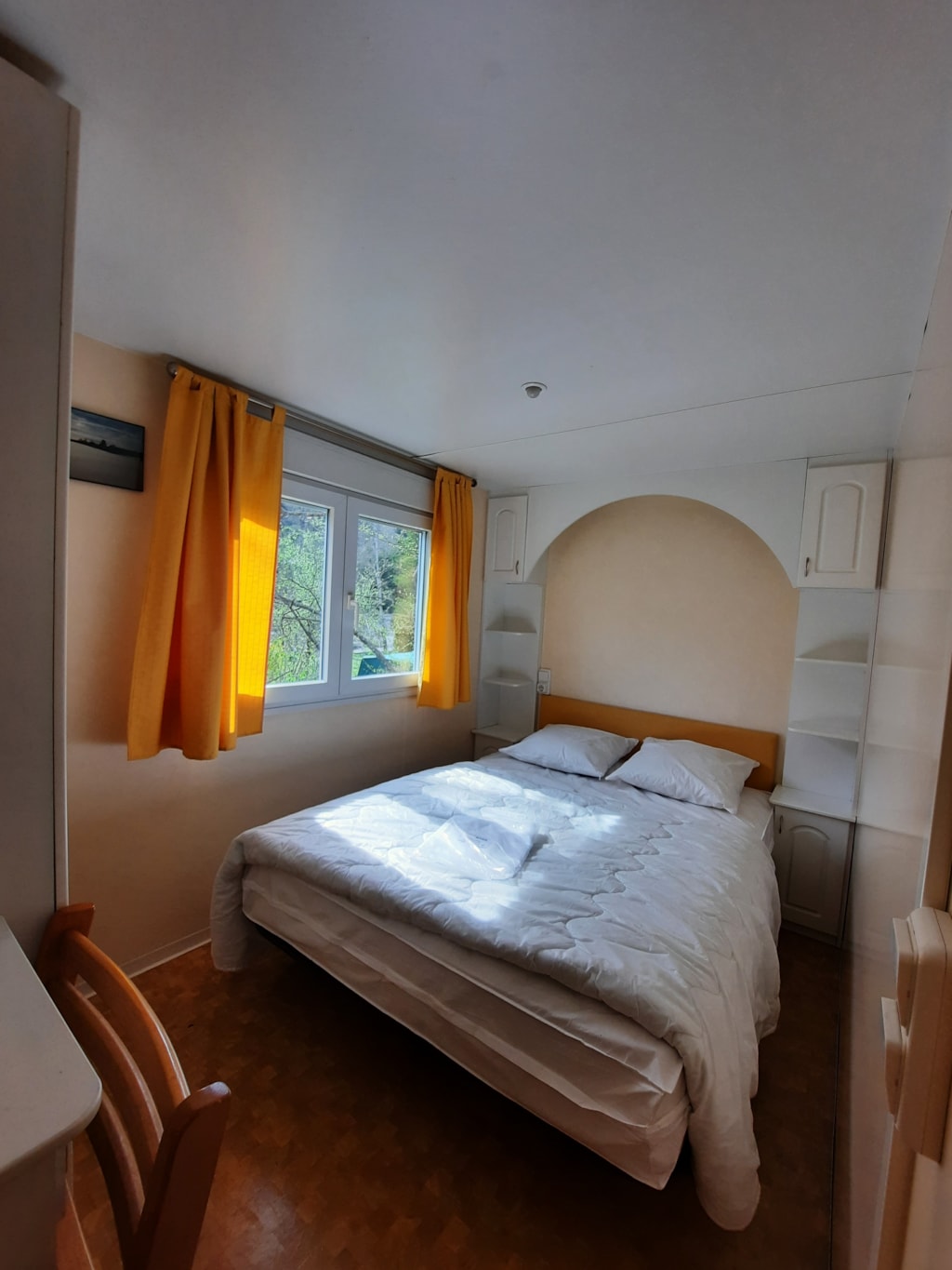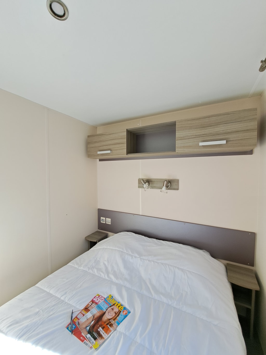Mobilheim für bis zu 4 Personen, mit 2 Schlafzimmern, 1 Doppelbett 140x190cm und 2 Einzelbetten 80x190cm, einer Essecke, Küche ausgestattet mit Kühlschrank/Gefrierschrank, Mikrowelle, Gasherd, Dunstabzugshaube, Kaffeemaschine, Geschirr und Besteck, Duschbad, separates WC, TV, umschaltbare Klimaanlage, separates Duschbad und WC, überdachte Terrasse mit Gartenmöbeln und zwei Liegestühlen.