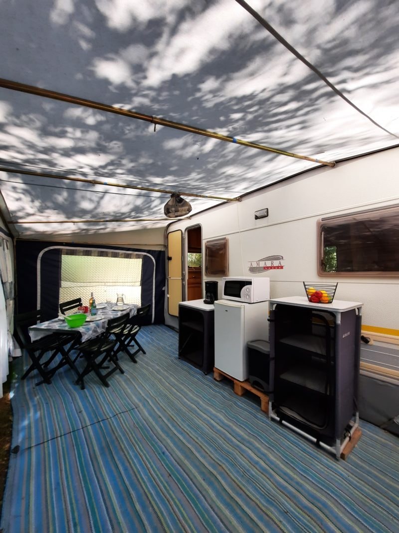 Der Wohnwagen besteht aus einem Doppelbett (140 cm breit). Sitzbank und Tisch im Inneren, Küchenzeile mit Gasherd, Abzugshaube, Kühlschrank, Mikrowelle, Kaffeemaschine, Geschirr und Küchenutensilien. Großes geschlossenes Vorzelt. Fernseher. Gartentisch und -stühle und Relax.