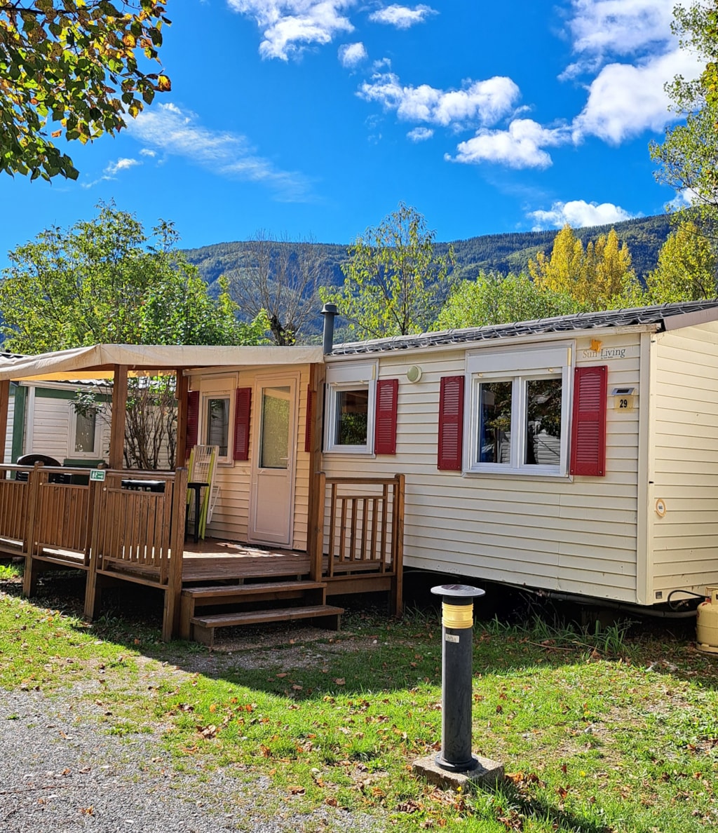 Mobilheim 4 Personen - Überdachte Terrasse mit Gartentisch und -stühlen und Relax- 2 separate Schlafzimmer - 1 Badezimmer und 1 separates WC - Kochecke mit Kühl-/Gefrierschrank - Mikrowelle - Kaffeemaschine - 2-flammige Gaskochplatte - Geschirr und Küchenutensilien - Essecke - TV - elektrische Heizung - Bettdecke und Kopfkissen vorhanden - Bettwäsche und Handtücher optional gegen Gebühr.