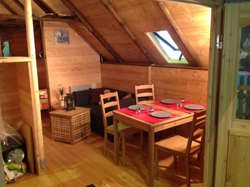 • Ein Haupt Wohnzimmer mit Kochnische ausgestattet mit einem Tisch und 4 oder 5 Stühle, Kühlschrank , Campinggas , Teller, Gabeln ... ( komplette Ausrüstung für das Kochen.