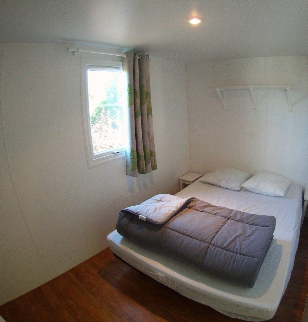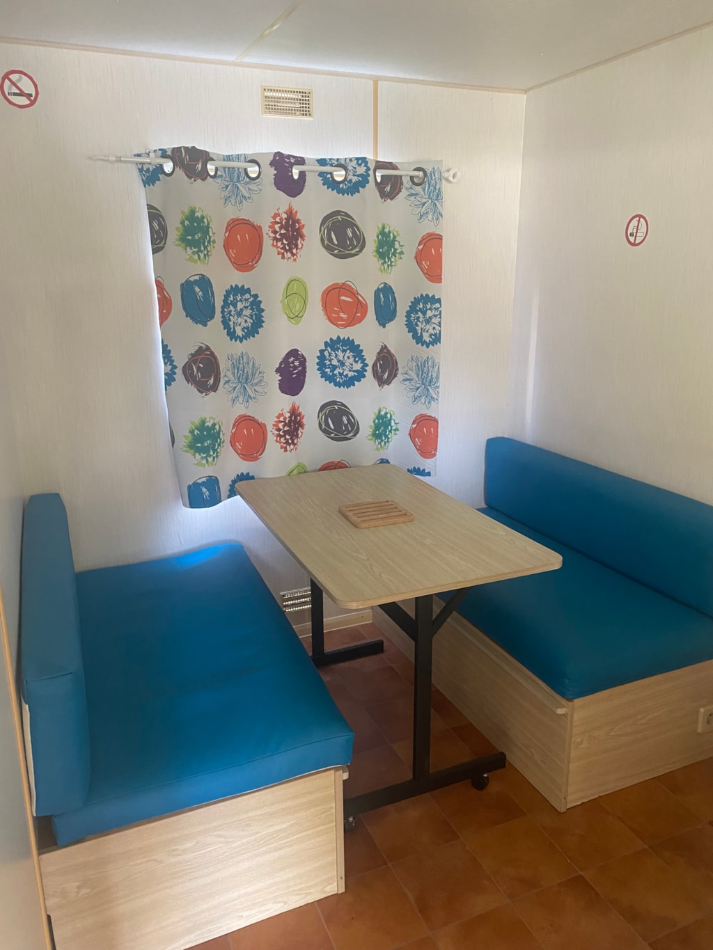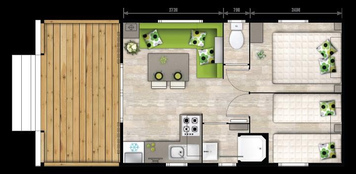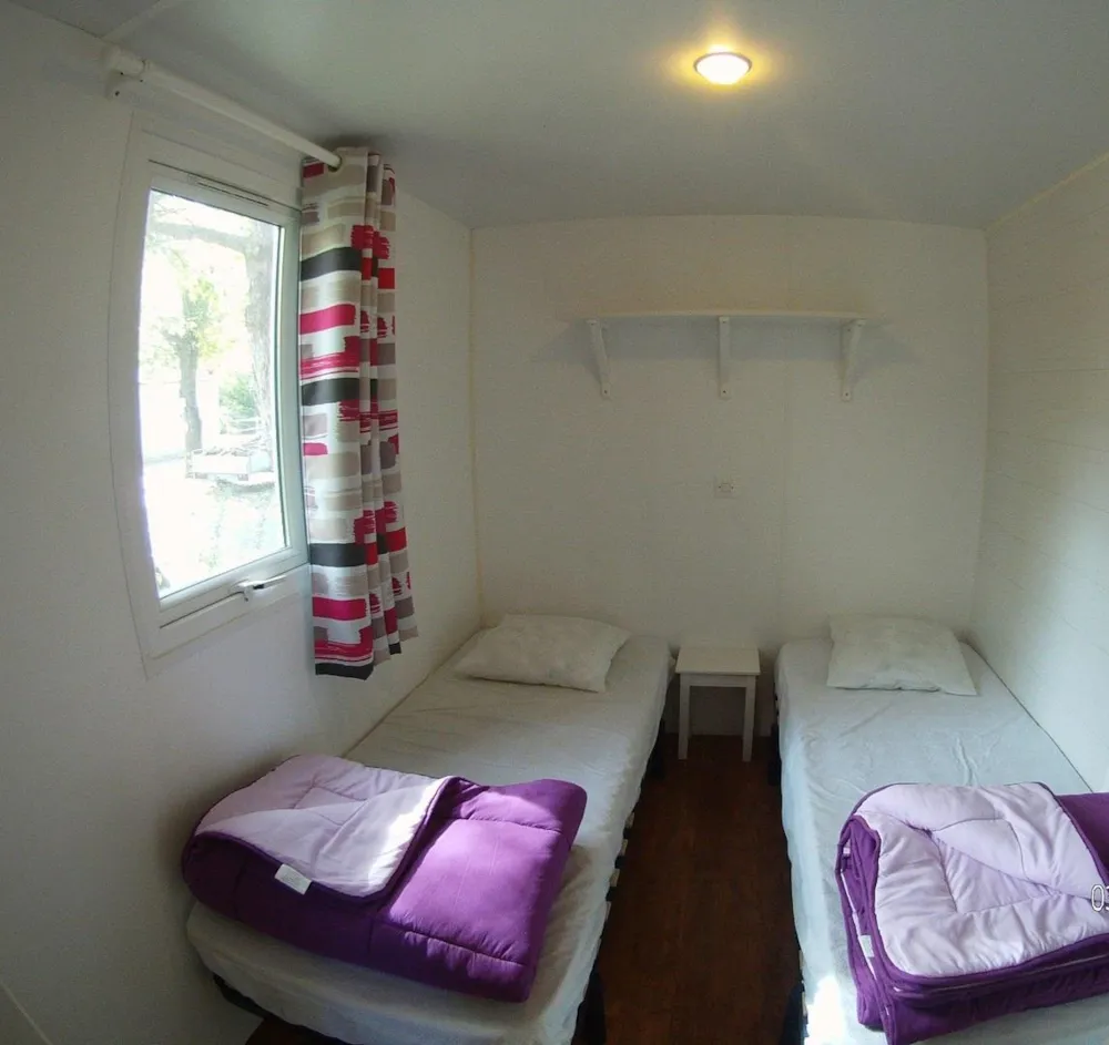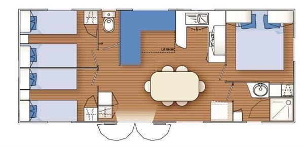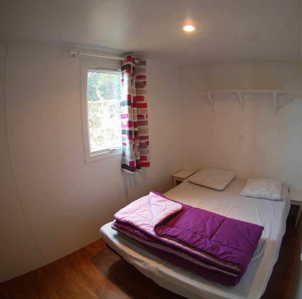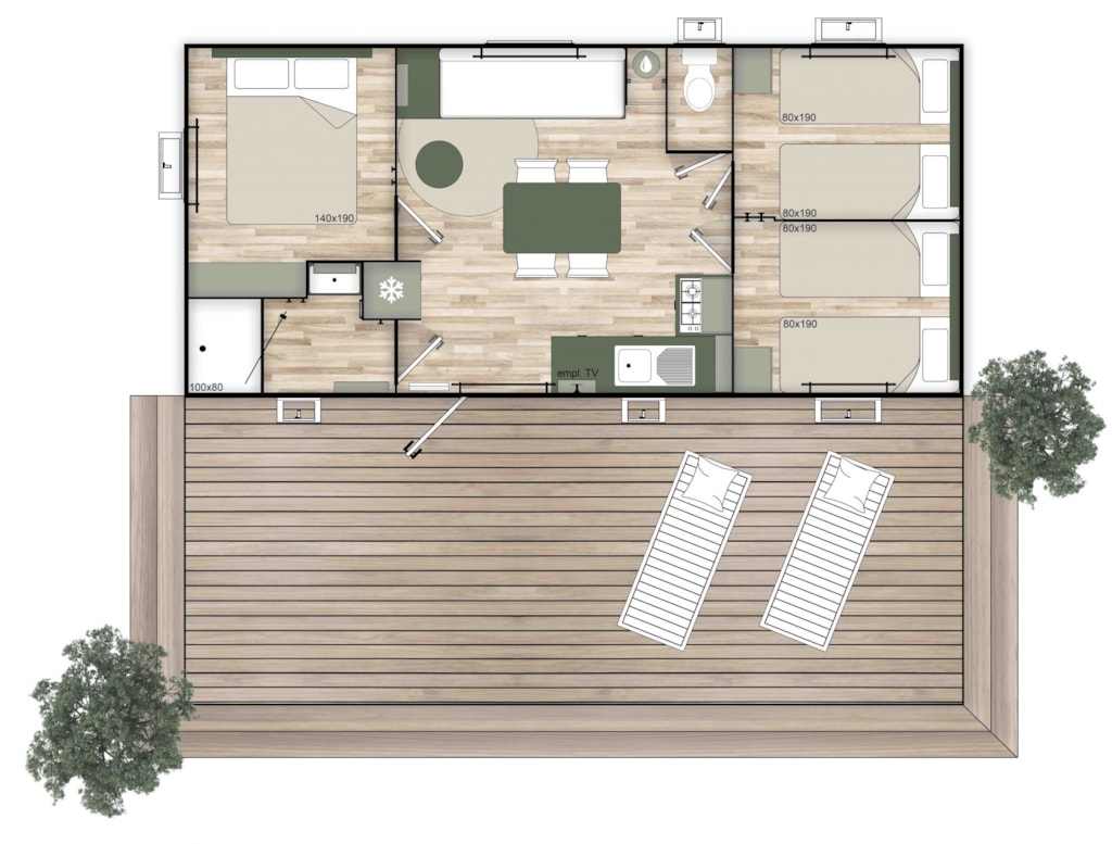 Bungalow 6 personas con terraza cubierta, de 34m². 3 habitaciones, una con una cama doble, 2 con dos camas simples. Un salon-comedor con una concina. Servicio separado del baño.