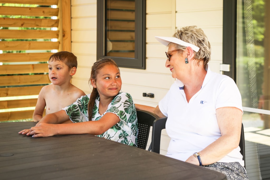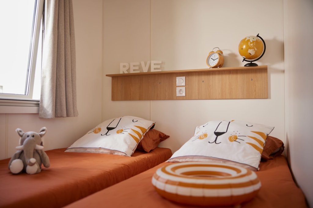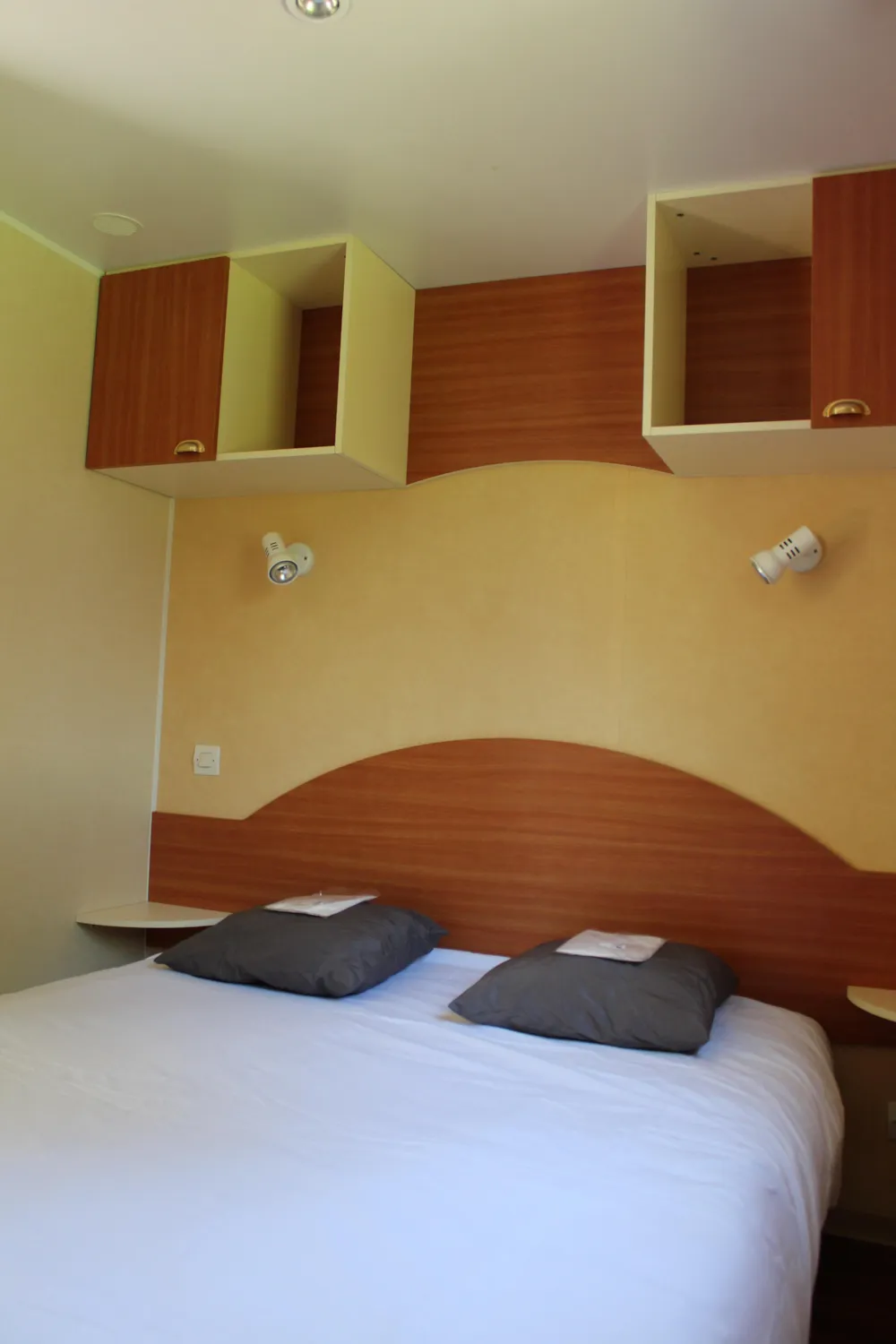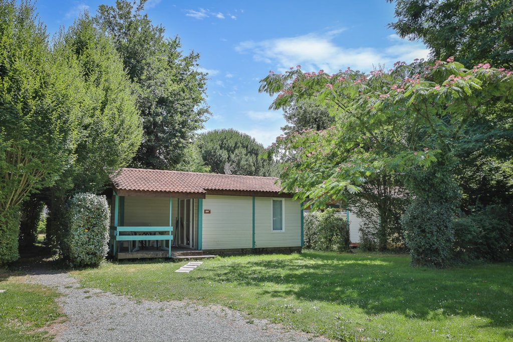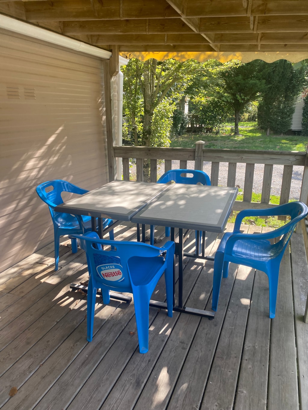 Bungalow 6 personas con terraza cubierta, de 34m². 3 habitaciones, una con una cama doble, 2 con dos camas simples. Un salon-comedor con una concina. Servicio separado del baño.