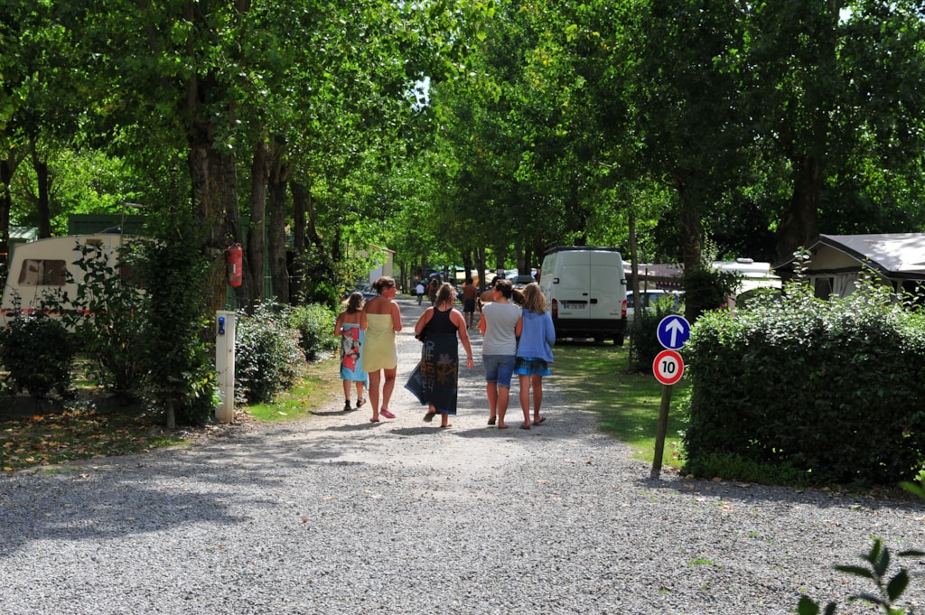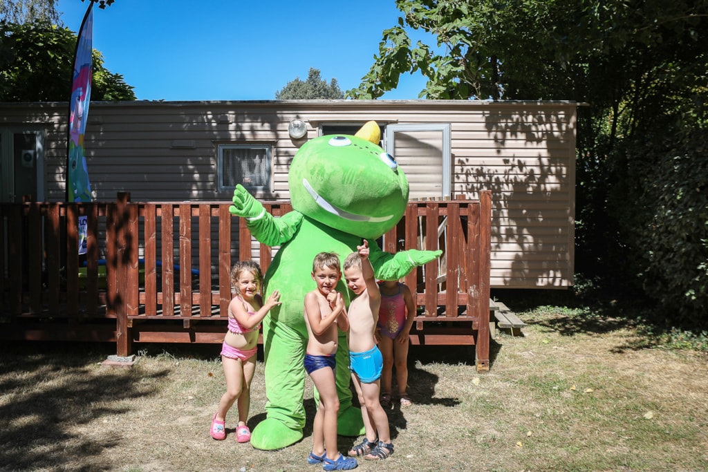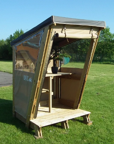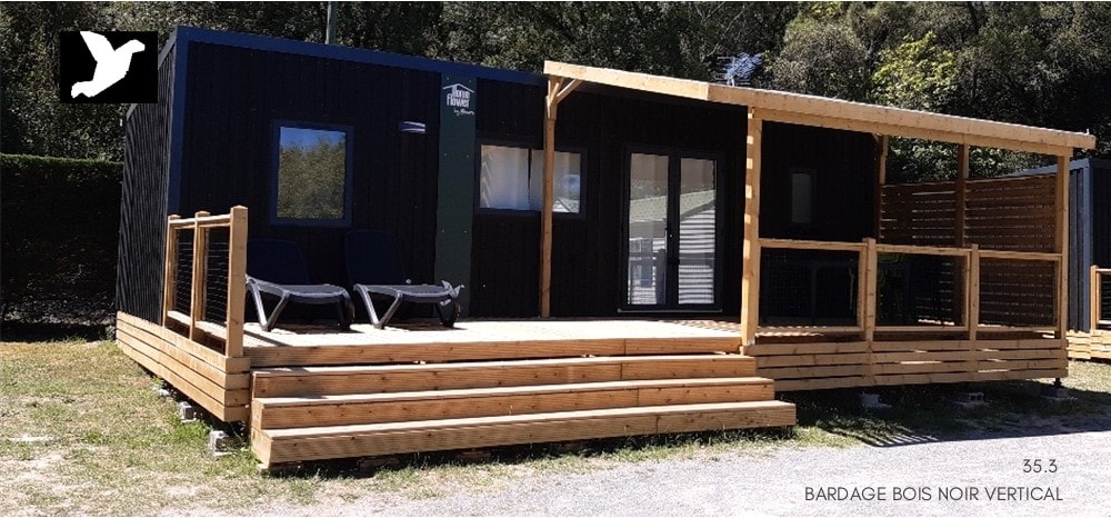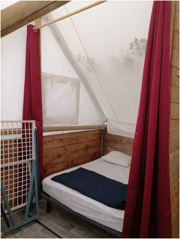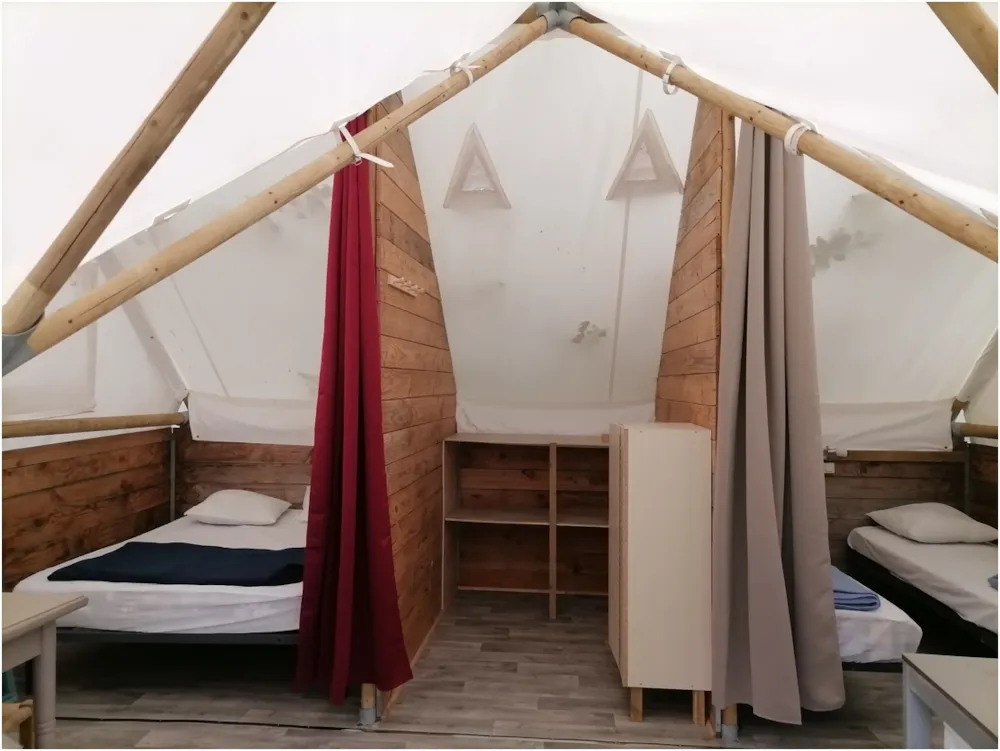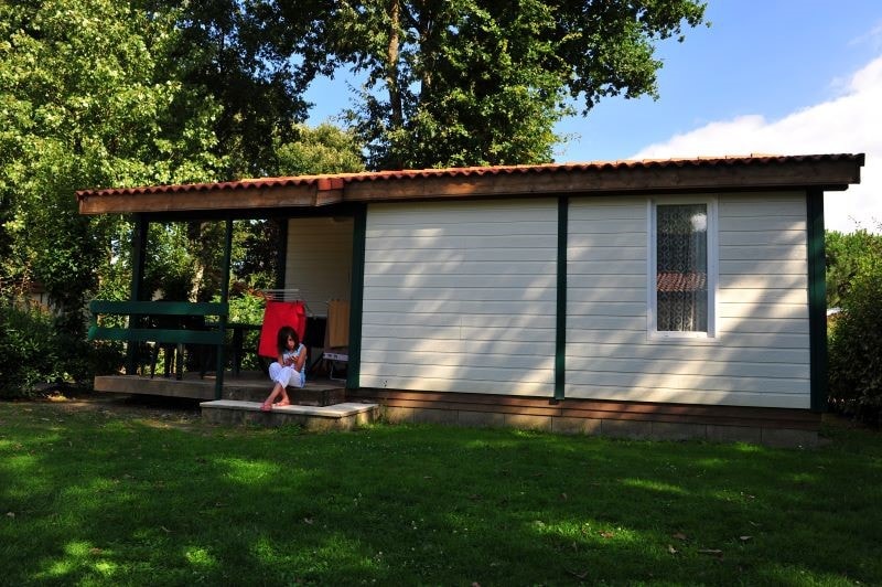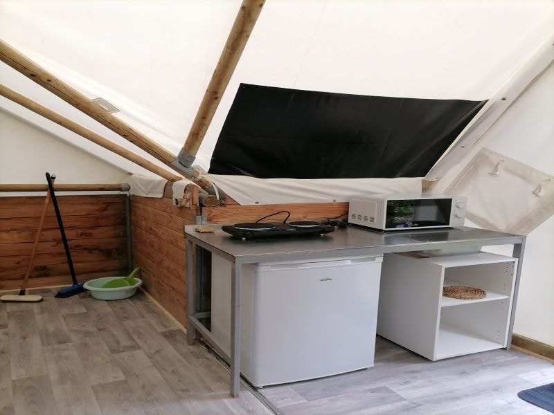 Bungalow mi bois -mi toile pour des vacances nature avec une terrasse en bois pour profiter de l'extérieur , une petite kitchenette à l'intérieur avec un frigo top et 2 feux gaz .Les sanitaires sont à 2 minutes a pied