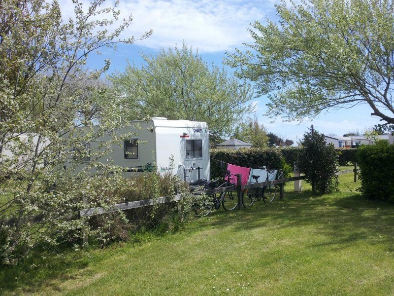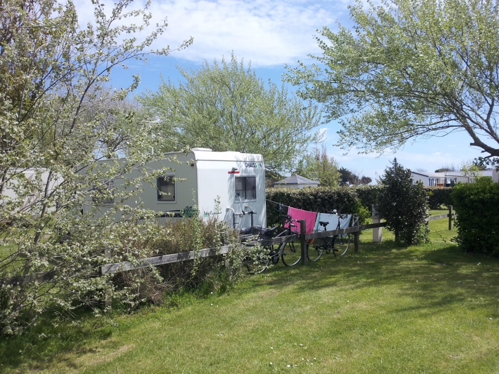 Emplacement d'environ 90 m² sur herbe, séparé par des haies. Branchement électrique avec prise européenne - 10 A